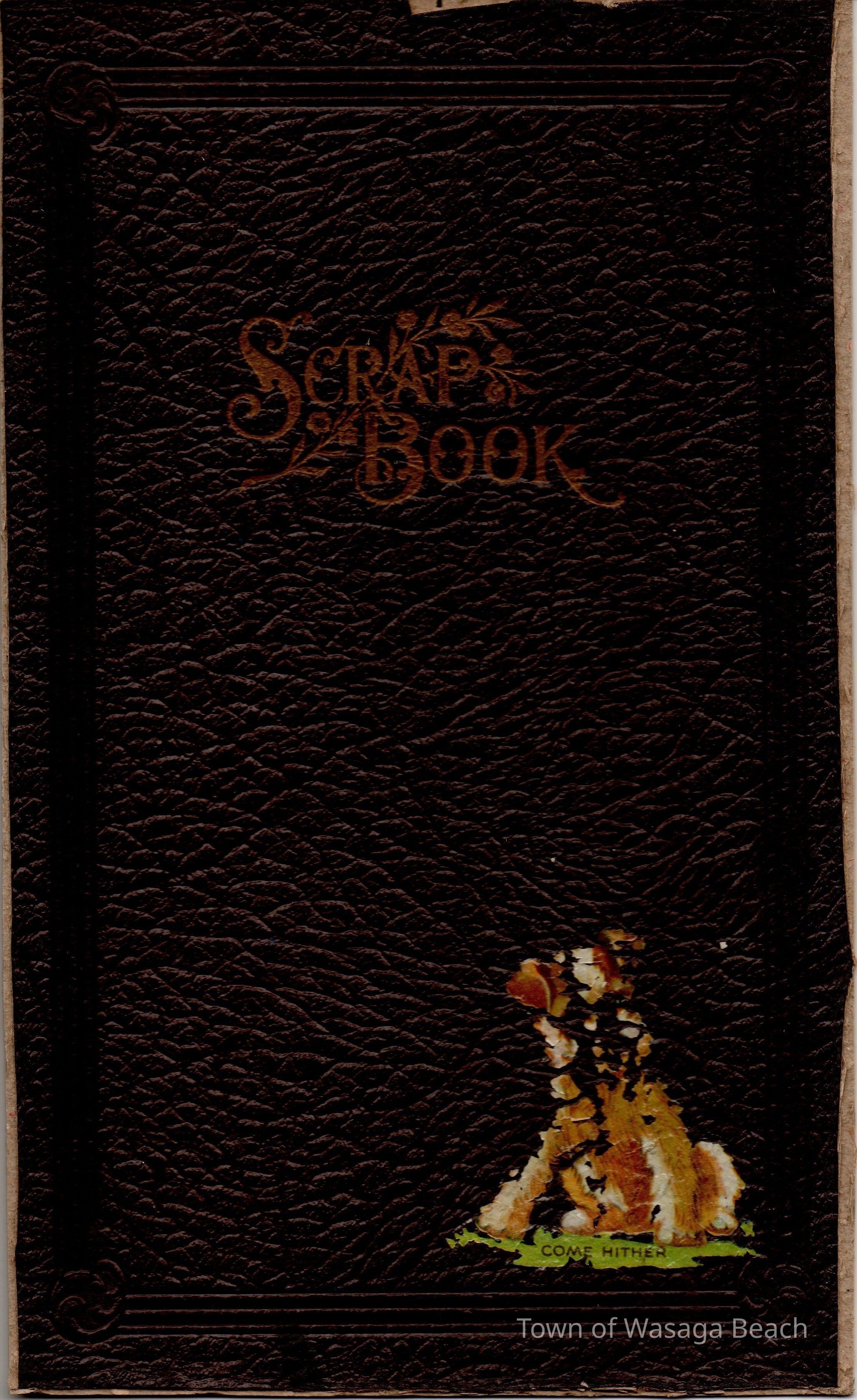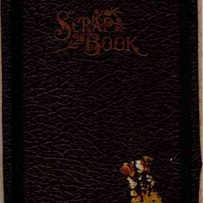 Newspaper article attached to 1/16" thick cardboard with leather type cover of a scrapbook that reads "SCRAPBOOK" and "COME HITHER"Context