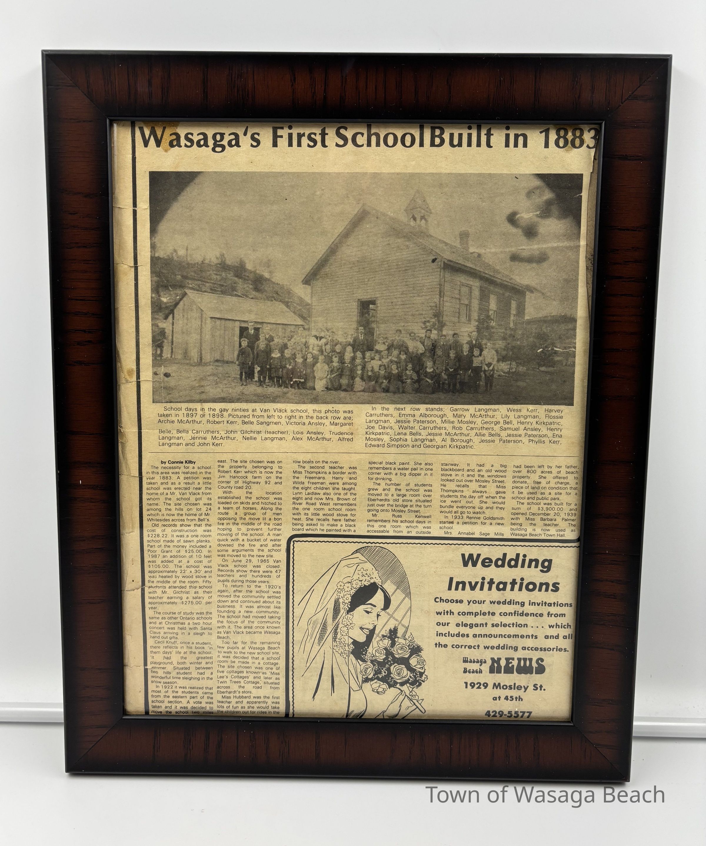 After the Van Vlack School moved, the distance was too great for some students to travel to the new location. As a result, a school room began in a cottage at Miss Lee's Cottages, later known as Twin Trees Cottage, across the road from Eberhardt's Store. As the number of students grew, the school was then moved to a large room over Eberhardt's Store. In 1933, a petition circulated to build a new school. Mrs. Annabel Sage Mills donated property to be used as a site for a new school and public park. The school was built for $3900.00 and opened in December, 1939. Located at 30 Lewis Street, the building became the current Town of Wasaga Beach Muncipal Office in 1974. Mills Park is located on the same property. The article includes memories from former students of early Wasaga Beach schools.Acquisition