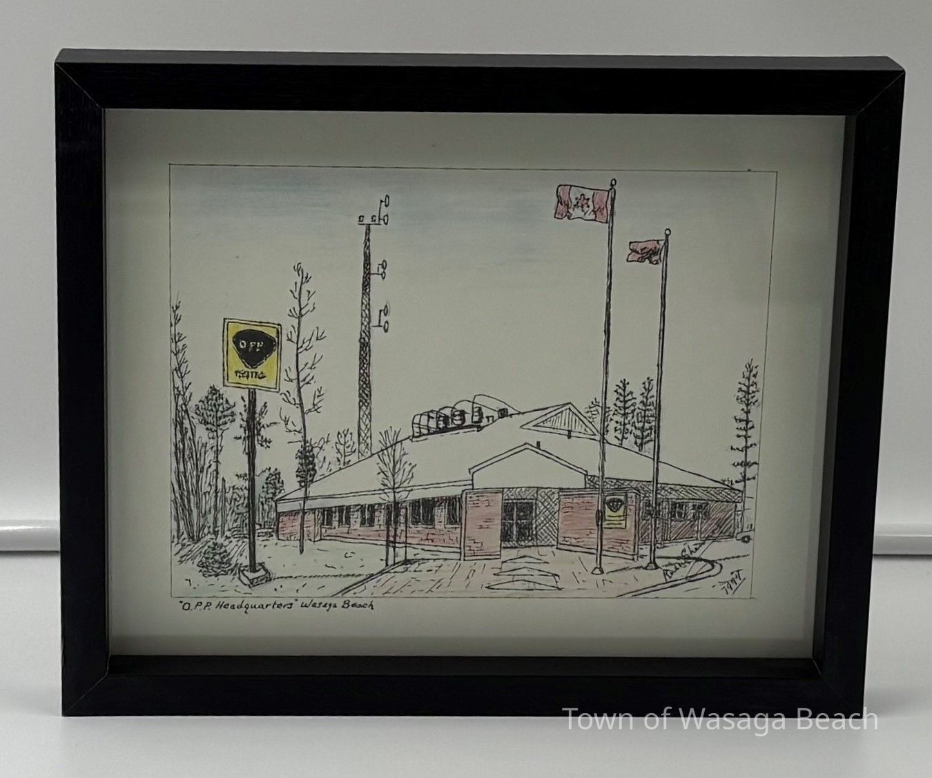 A framed pen and ink drawing of "O.P.P. Headquarters", Wasaga Beach, signed by artist Russ Shannon, 1994.Acquisition