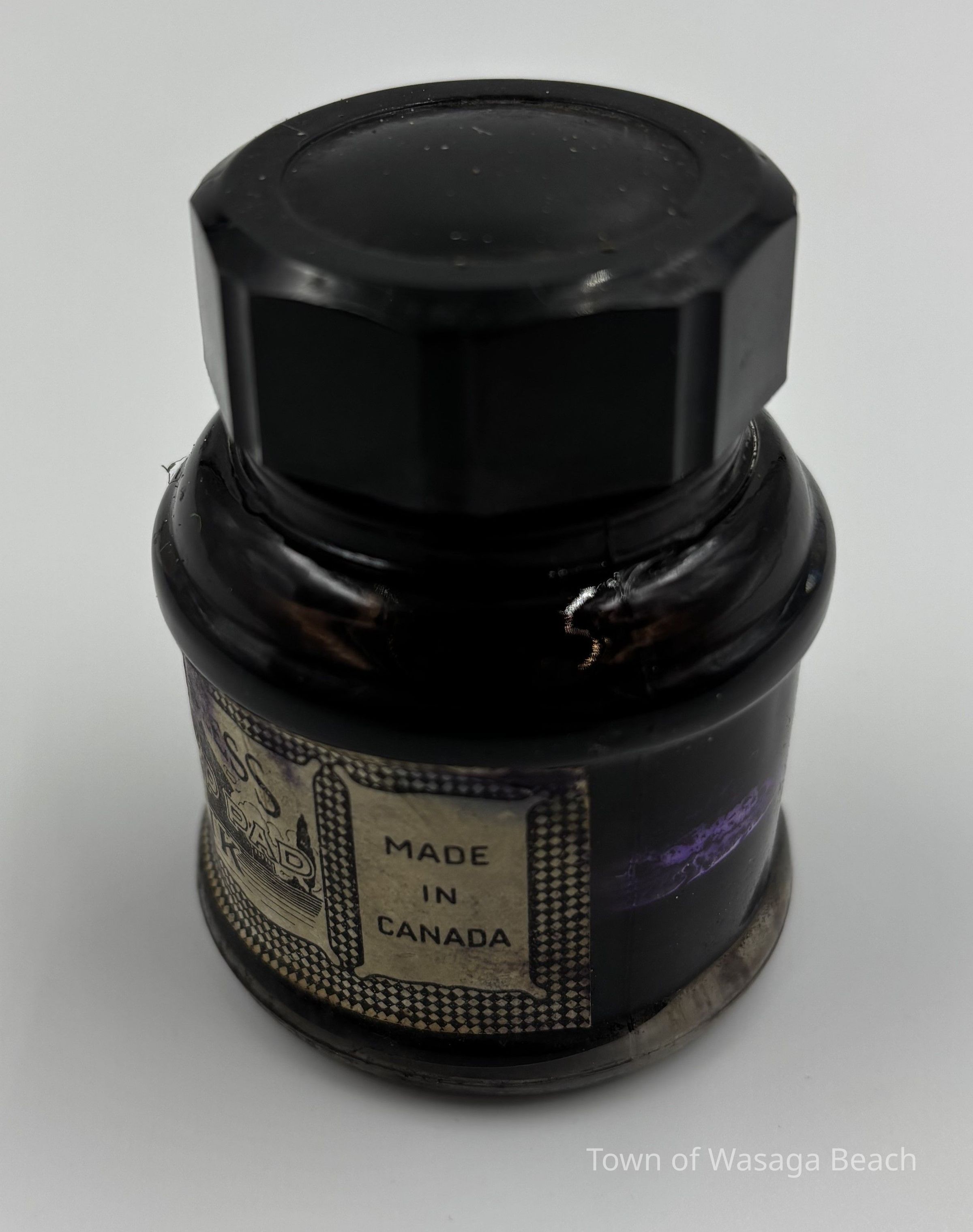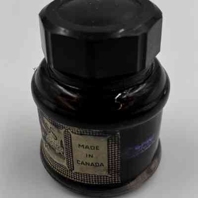 Ink from a bottle such as this, was added to stamp pads and also used to refill inkwells for the purpose of writing with quills and fountain pens. An inkwell is a container to hold ink to dip writing instruments such as a quill or pen into. Inkwells over time were made from clay, stone, animal horn, glass, porcelain, pewter, sterling silver and gold. Inkwells would often fit into a hole in a desk or table and usually included a lid to prevent spilling and to protect ink from evaporation. As fountain pens became popular in the 1800s and quills were less used, inkwells were used to refill the reservoirs in fountain pens with ink. Inkwells and fountain pens were less used with the invention of the typewriter and ballpoint pens later in 1943.Acquisition