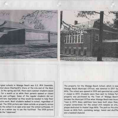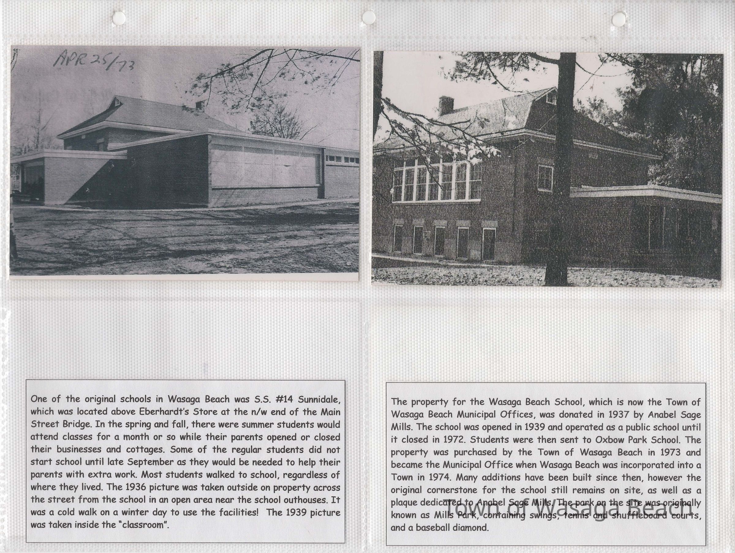 "The property for the Wasaga Beach School, which is now the Town of Wasaga Beach Municipal Offices, was donated in 1937 by Anabel Sage Mills. The school was opened in 1939 and operated as a public school until it closed in 1972. Students were then sent to Oxbow Park School. The property was purchased by the Town of Wasaga Beach in 1973 and became the Municipal Office when Wasaga Beach was incorporated into a Town in 1974. Many additions have ben built since then, however the original cornerstone for the school still remains on site, as well as a plaque dedicated to Anabel Sage Mills. The Park on the site was originally known as Mills Park, containing swings, tennis and shuffleboard courts, and a baseball diamond.