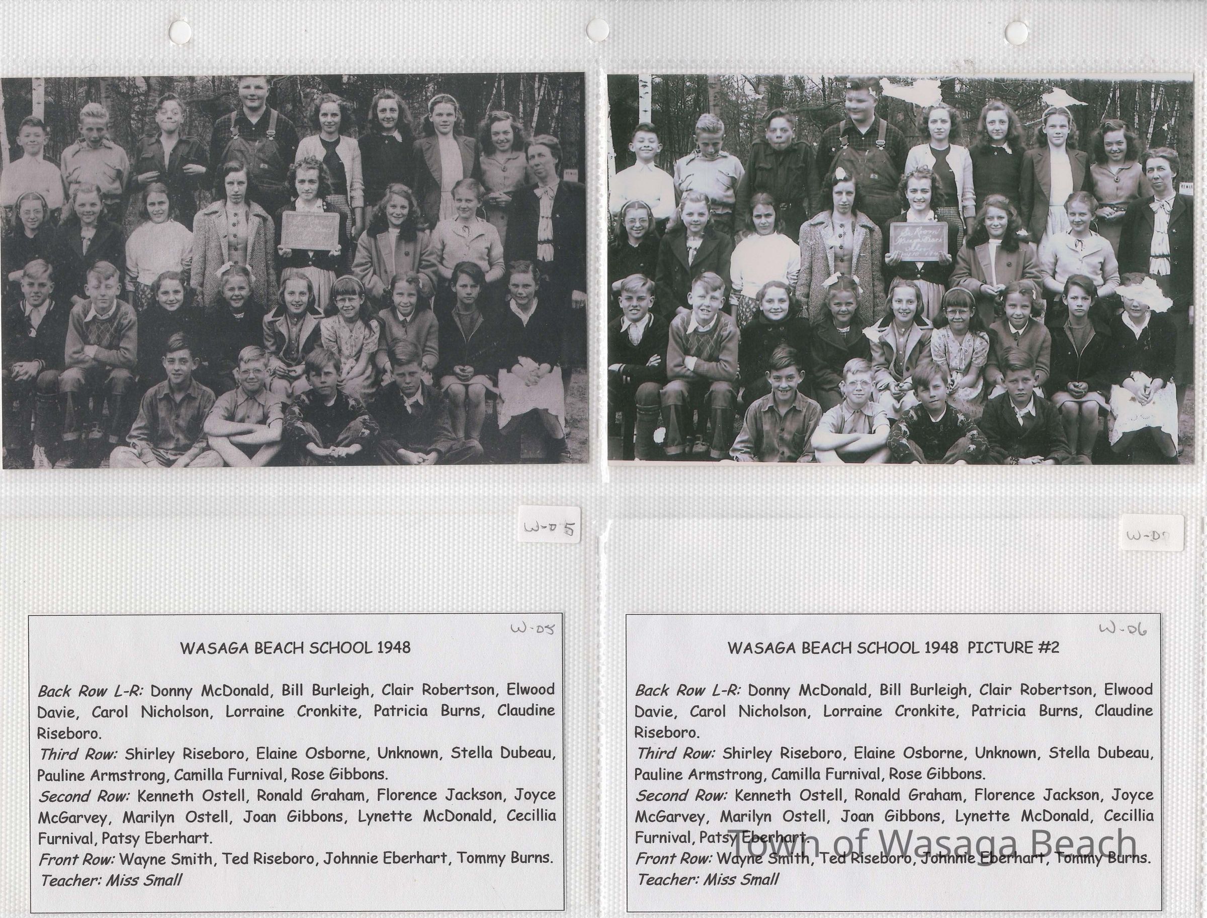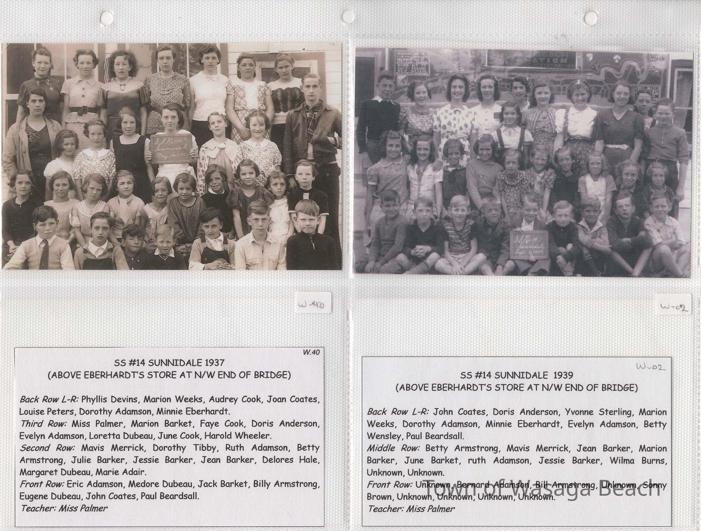 “ One of the original schools in Wasaga Beach was S.S. #14 Sunnidale, which was located above Eberhardt’s Store at n/w end of the Main Street Bridge. In the spring and fall, there were summer students who would attend classes for a month or so while their parents opened or closed their businesses and cottages. Some of the regular students did not start school until late September as they would be needed to help their parents with extra work. Most students walked to school, regardless of where they lived. The 1936 picture was taken outside on property across the street from the school in an open area near the school outhouses. It was a cold walk on a winter day to use the facilities! The 1939 picture was taken inside the classroom"