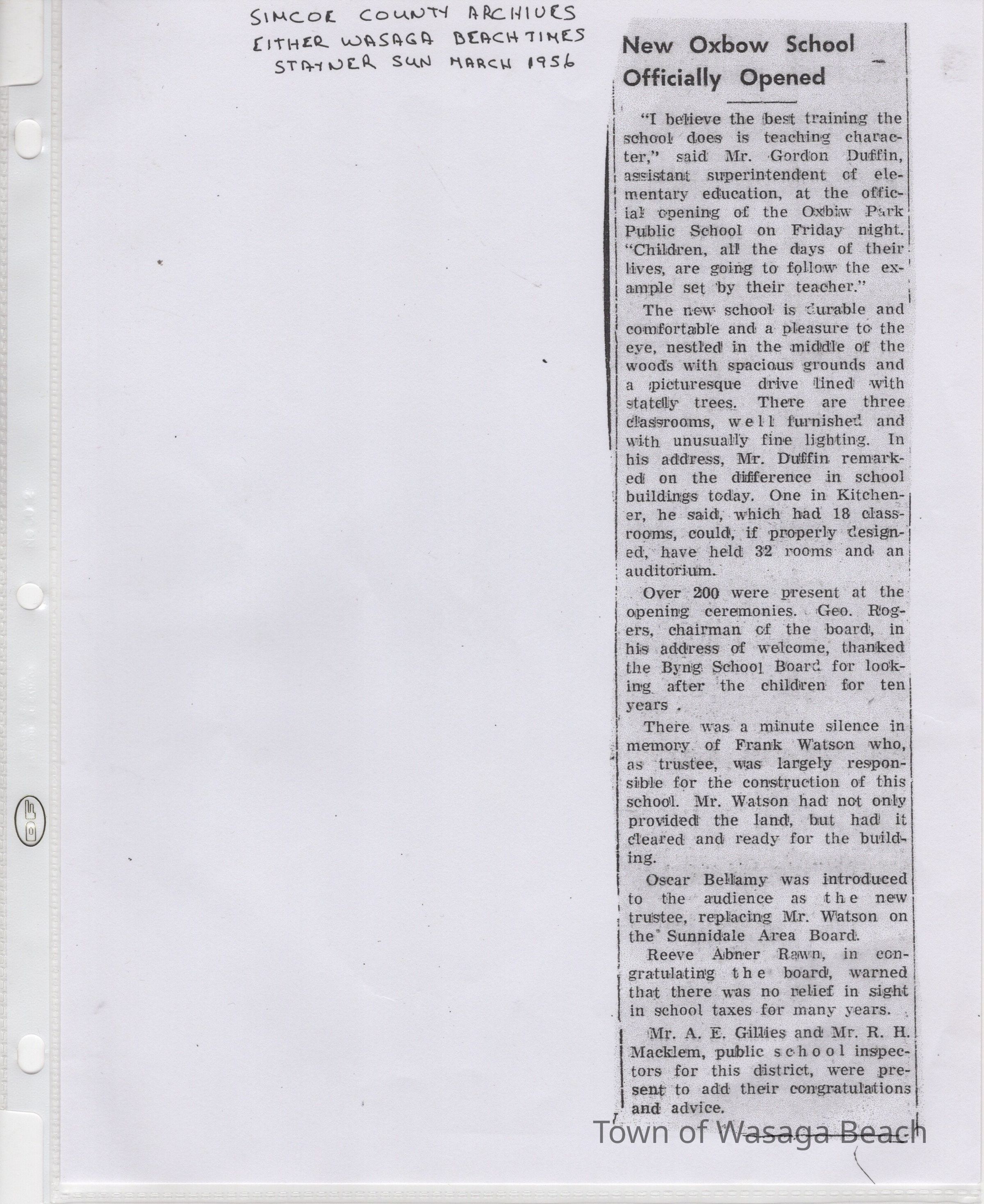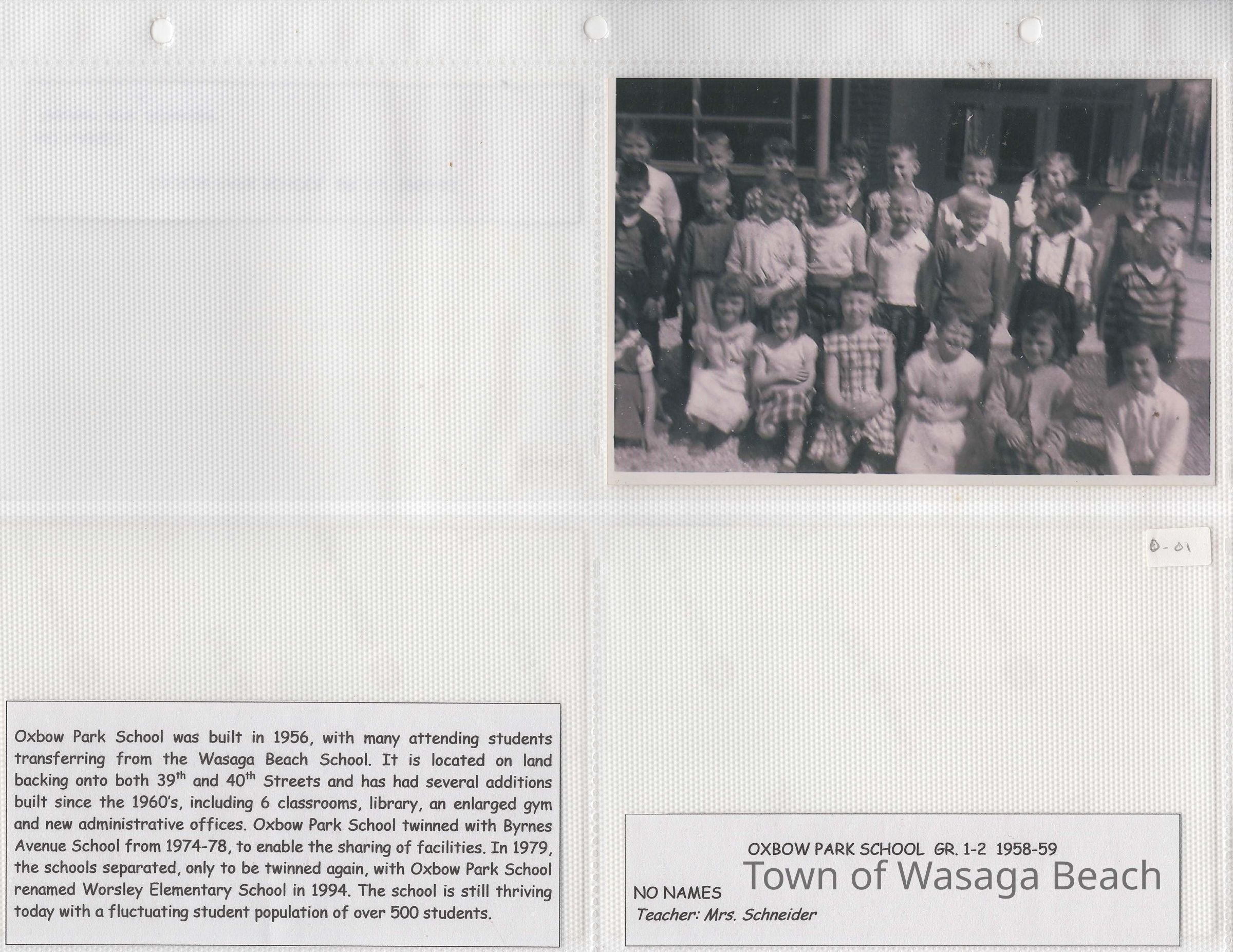 “Oxbow Park School was built in 1956, with many attending students transferring from the Wasaga Beach School. It is located on land backing onto both 39th and 40th Streets and has had several additions built since the 1960’s, including 6 classrooms, library, and enlarged gym and new administrative offices. Oxbow Park School twinned with Byrnes Avenue School from 1974-78, to enable the sharing of facilities. In 1979, the schools separated, only to be twinned again, with Oxbow Park School renamed Worsley Elementary school in 1994. The school is still thriving today with a fluctuating student population of over 500 students.”Acquisition