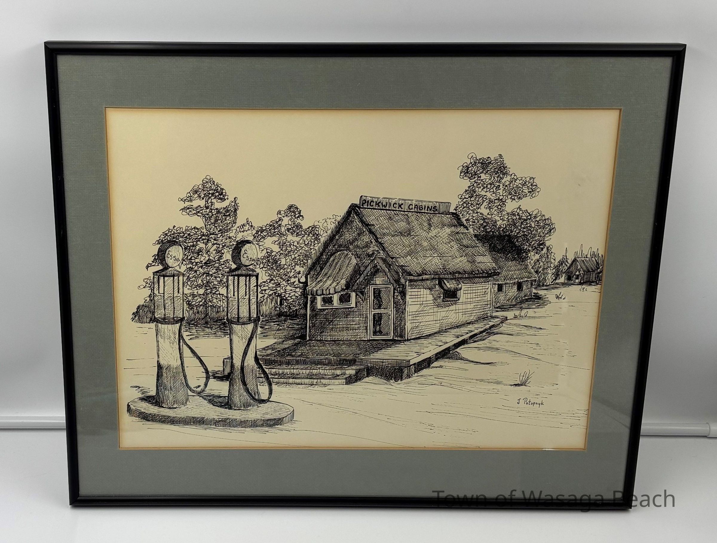 The pen and ink sketch of Pickwick Cabins was sketched by Jan Potopnyk, artist and entrepreneur from Wasaga Beach, from a photo by Elsie McEachern taken in 1930.