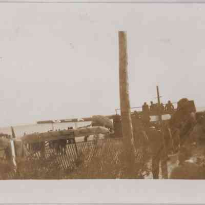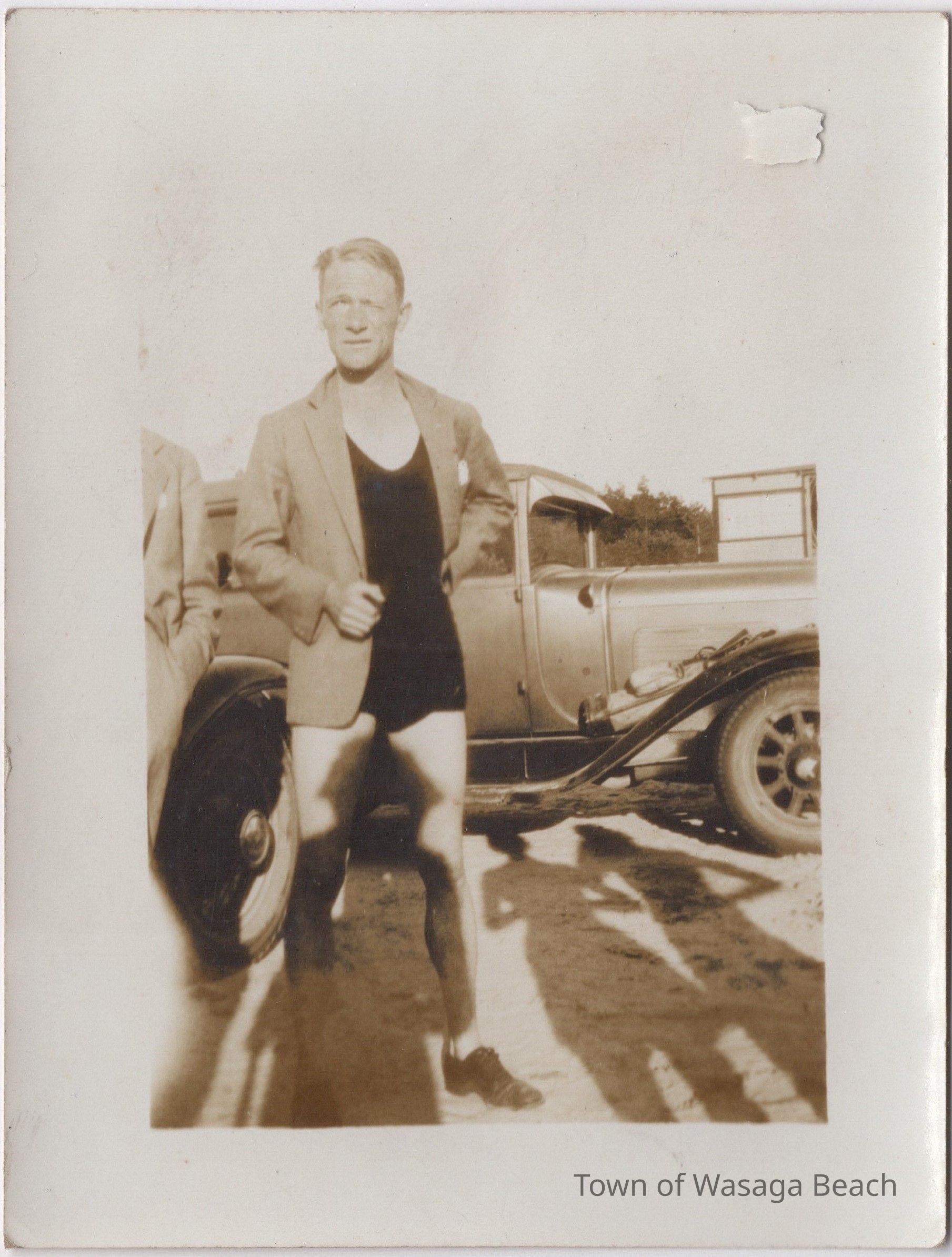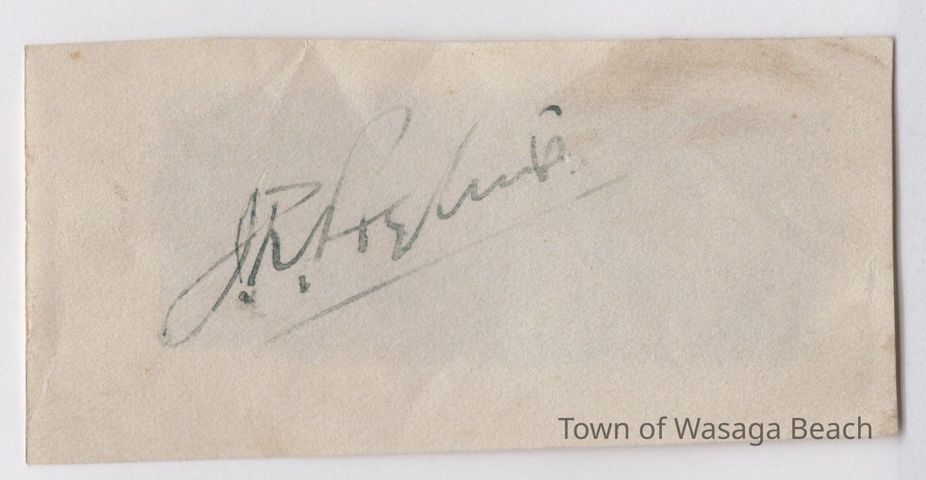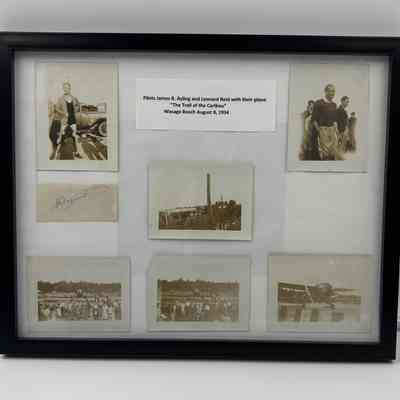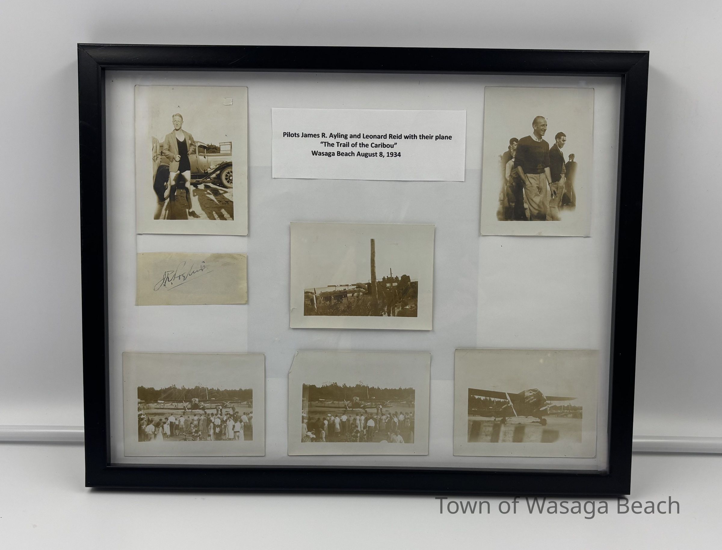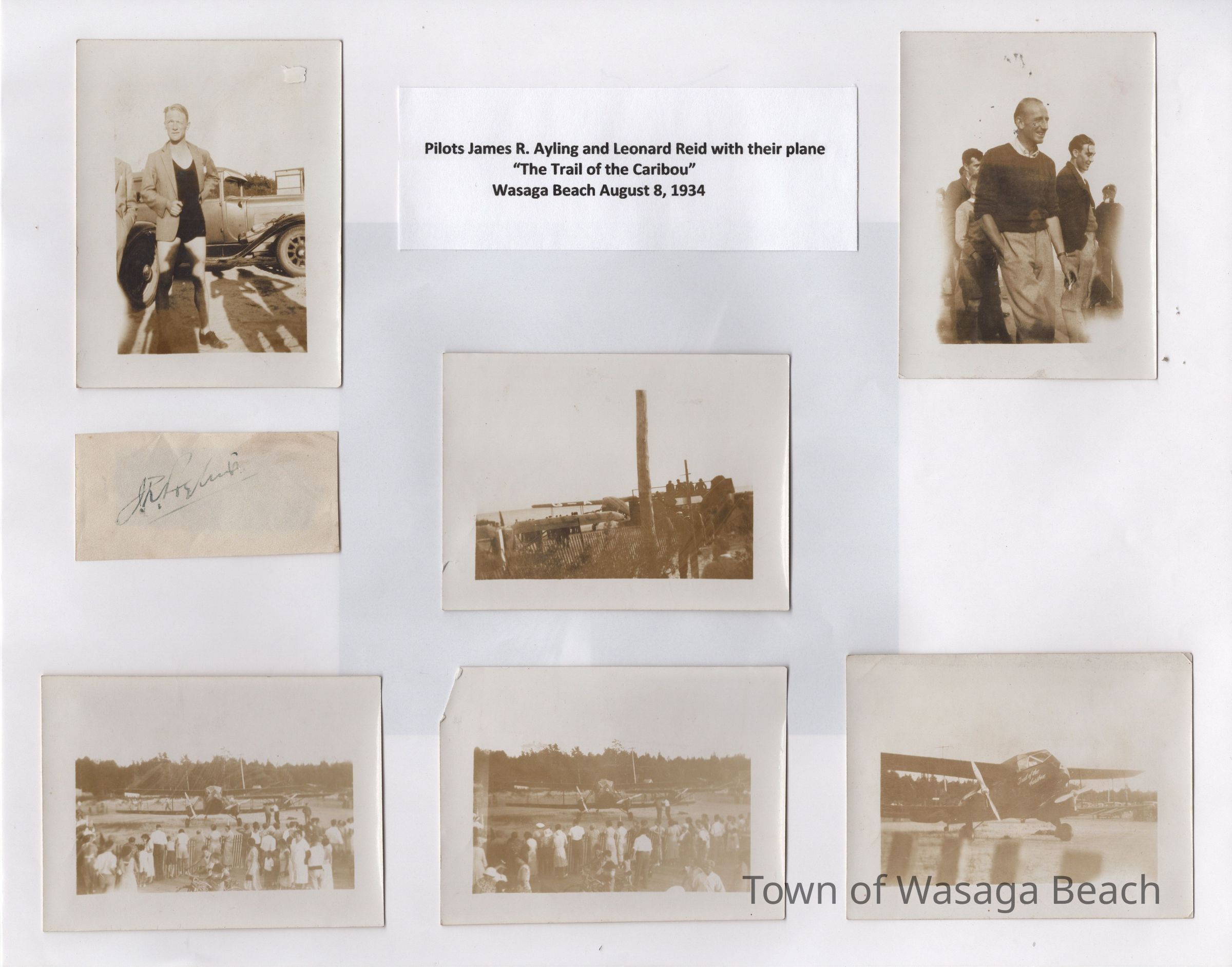 As noted in the caption included in the collage, the photos show James Ayling and Leonard Reid and the Trail of the Caribou on the beach at Wasaga Beach, August 8, 1934. Also included is a small piece of paper with the signature of James Ayling. It is not known if the signature is original.Acquisition