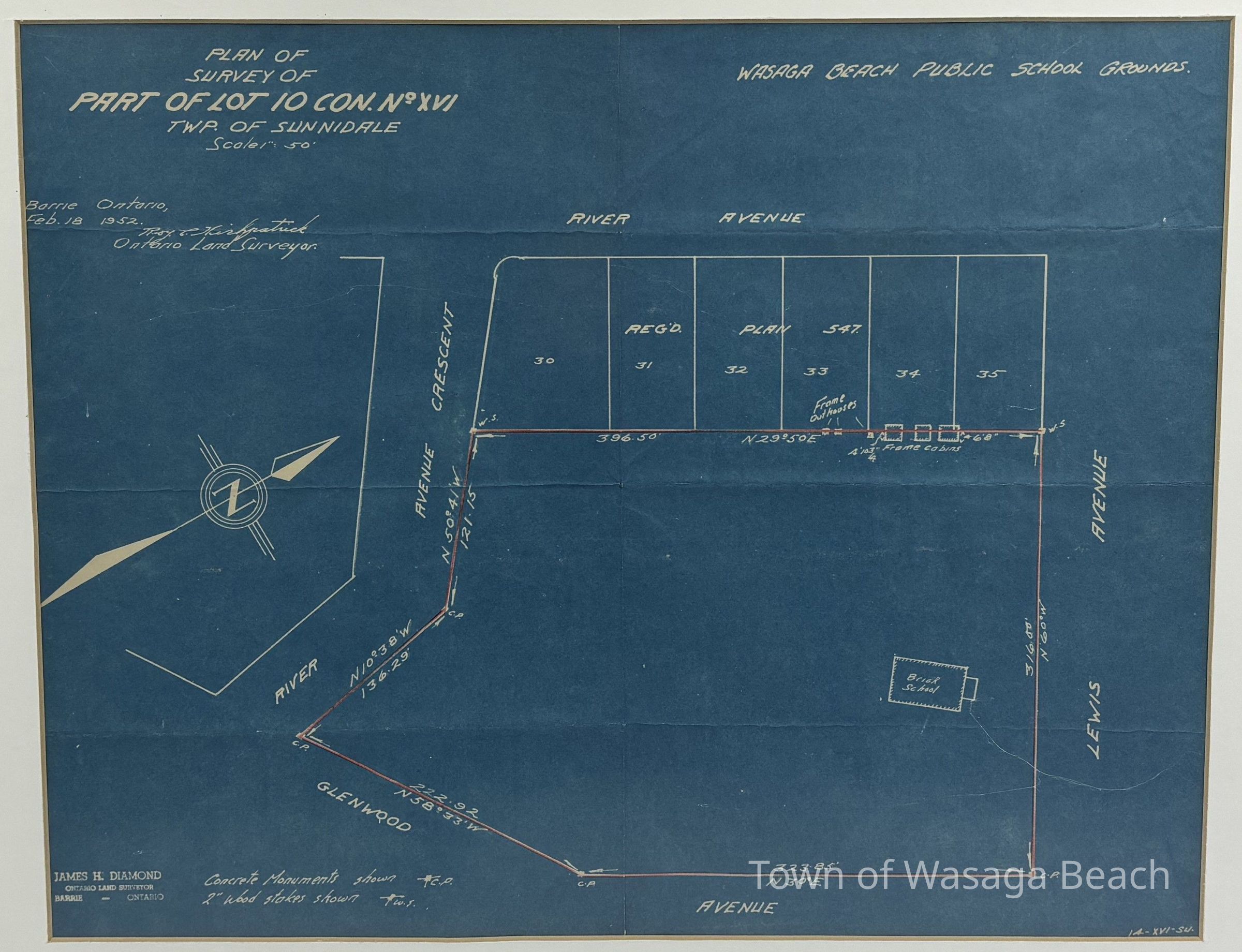 The survey of the Wasaga Beach Public School Grounds, Plan of Survey of Part of Lot 10 Con. No. XVI, Township of Sunnidale was conducted by Troy C. Kirkpatrick, Ontario Land Surveyor, Barrie, Ontario, on February 18, 1952. Around the perimeter of the property are River Avenue Crescent, Glenwood Drive and Lewis Street as well as 6 lots, Registered Plan 547, #30-35. imprinted on the bottom left of the survey, James H. Drummond, Ontario Land Surveyor, Barrie-Ontario with a legend indicating concrete monuments as C.P. and 2" wood stakes shown as W.S., with symbols for each. Along the property line between lot 33 and the school grounds, 2 frame outhouses are marked. Along the property line between Lot 34 and the school grounds, 3 framed cabins are drawn. One of the cabins is also on the property line with Lot 35. A frame outhouse is shown on the school grounds property close the property line of Lot 34. The school is drawn on the school grounds property.
