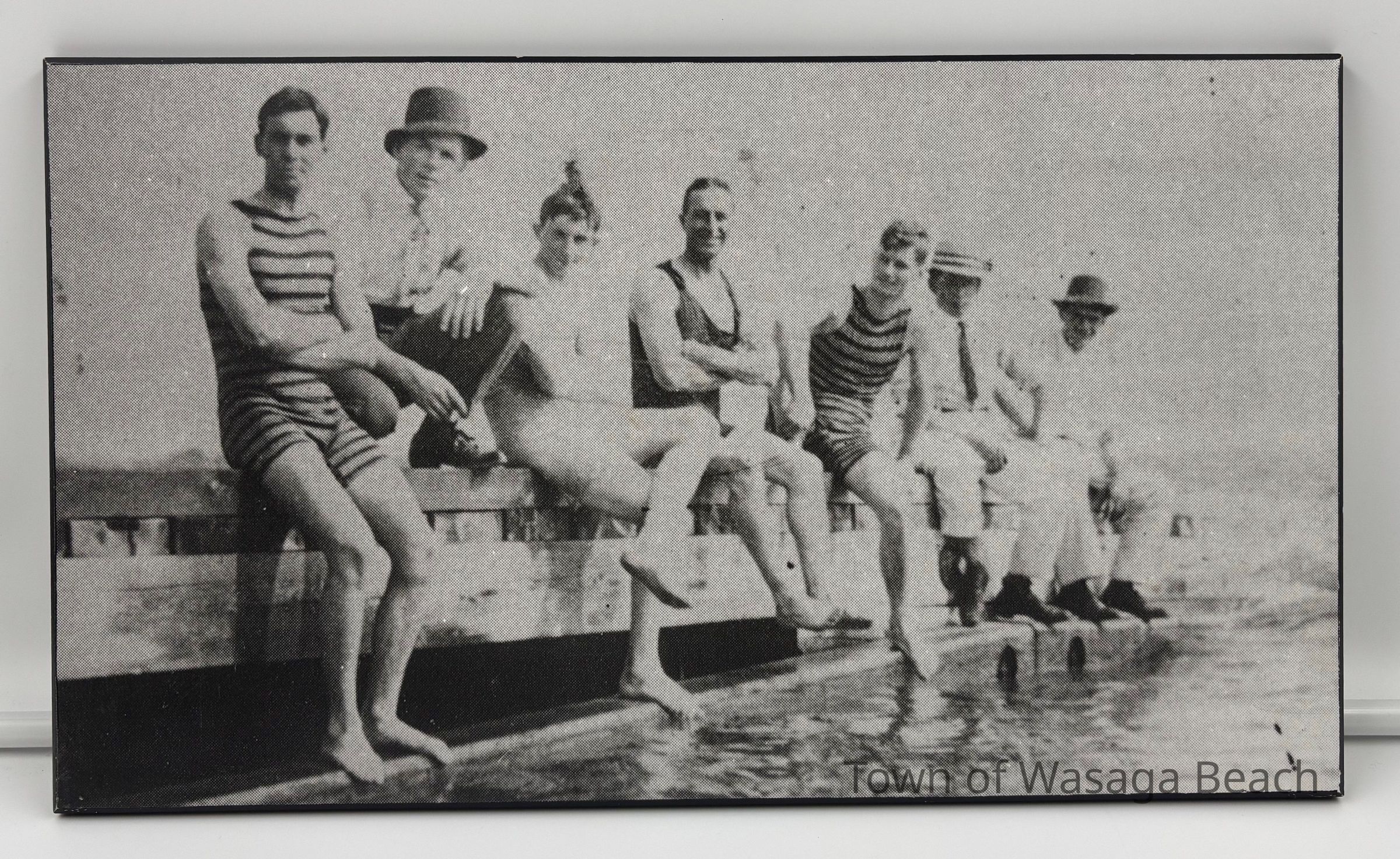 Plaqued black and white photograph of men in swimsuits and shirts and ties sitting on a dockAcquisition