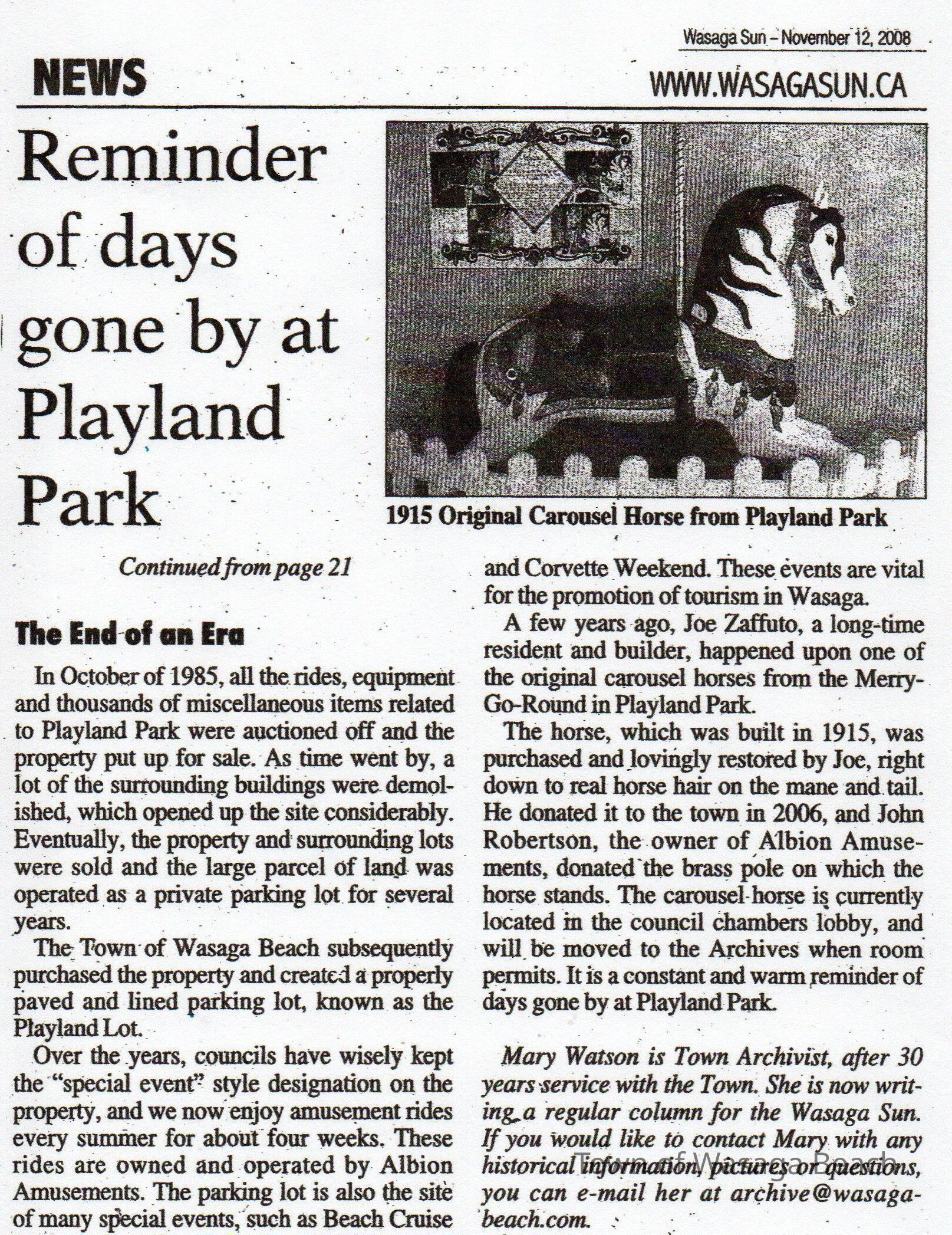 The newspaper article describes the history of the original carousel horse that was donated to the Wasaga Beach Archives in 2006Acquisition