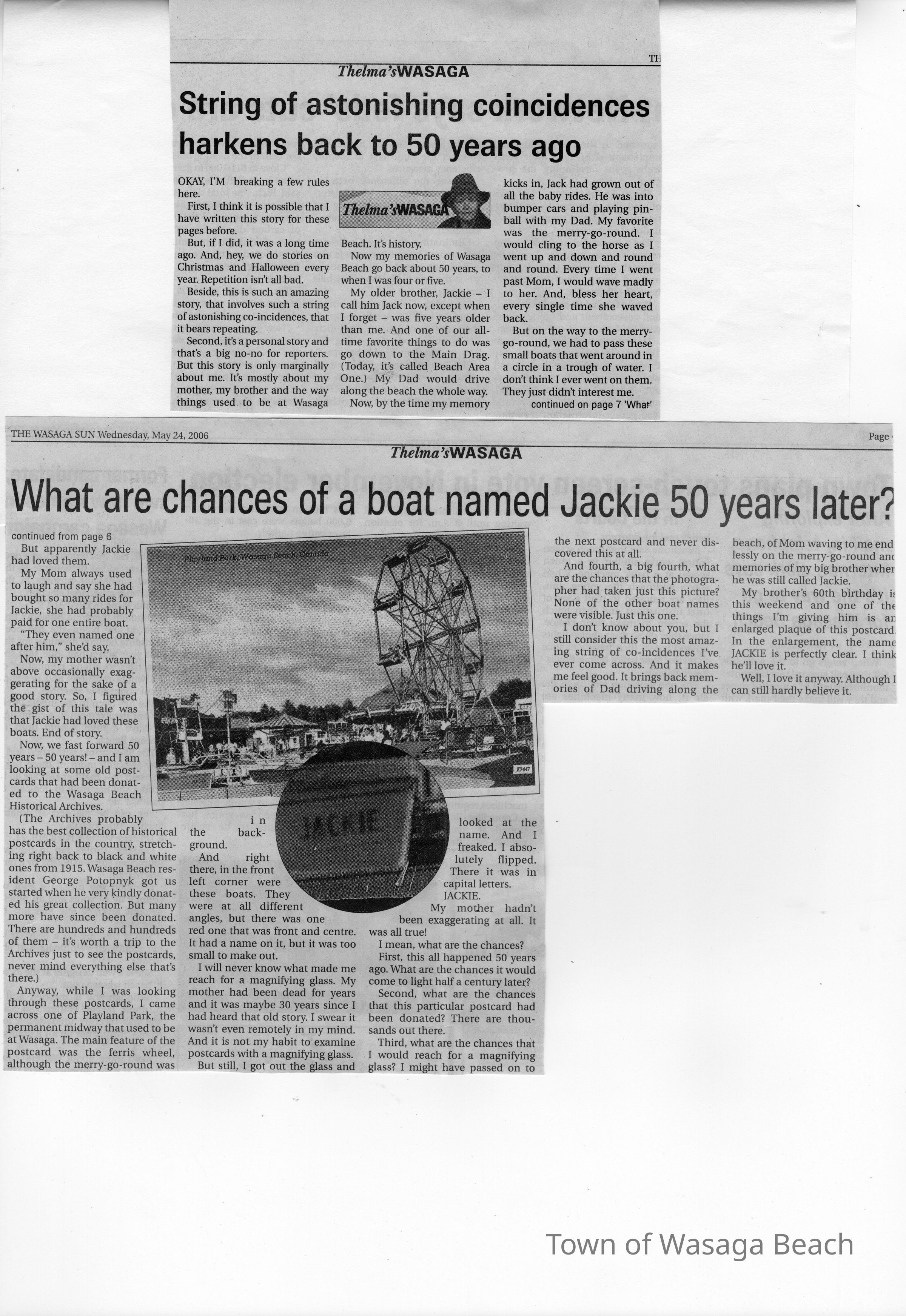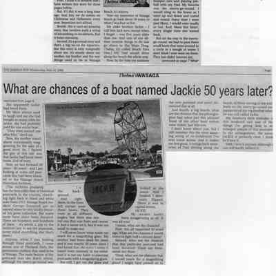 The newspaper article in The Wasaga Sun, Wednesday, May 24, 2006 - "What are chances of a boat named Jackie 50 years later?" by Thelma Morrison tells the story of Thelma finding her brother's name, Jackie, on a boat in a post card donated to the Archives. Thelma, her brother Jackie, and her mom and dad frequented Playland Park where the boat ride once was.