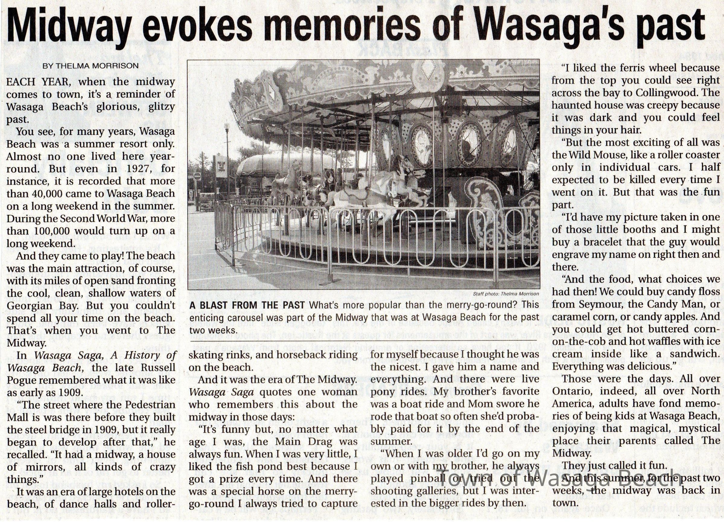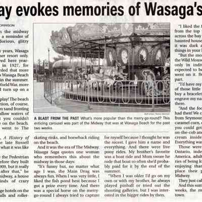 The newspaper article, "Midway evokes memories of Wasaga's past" by Thelma Morrison describes memories of midway rides at Wasaga Beach.