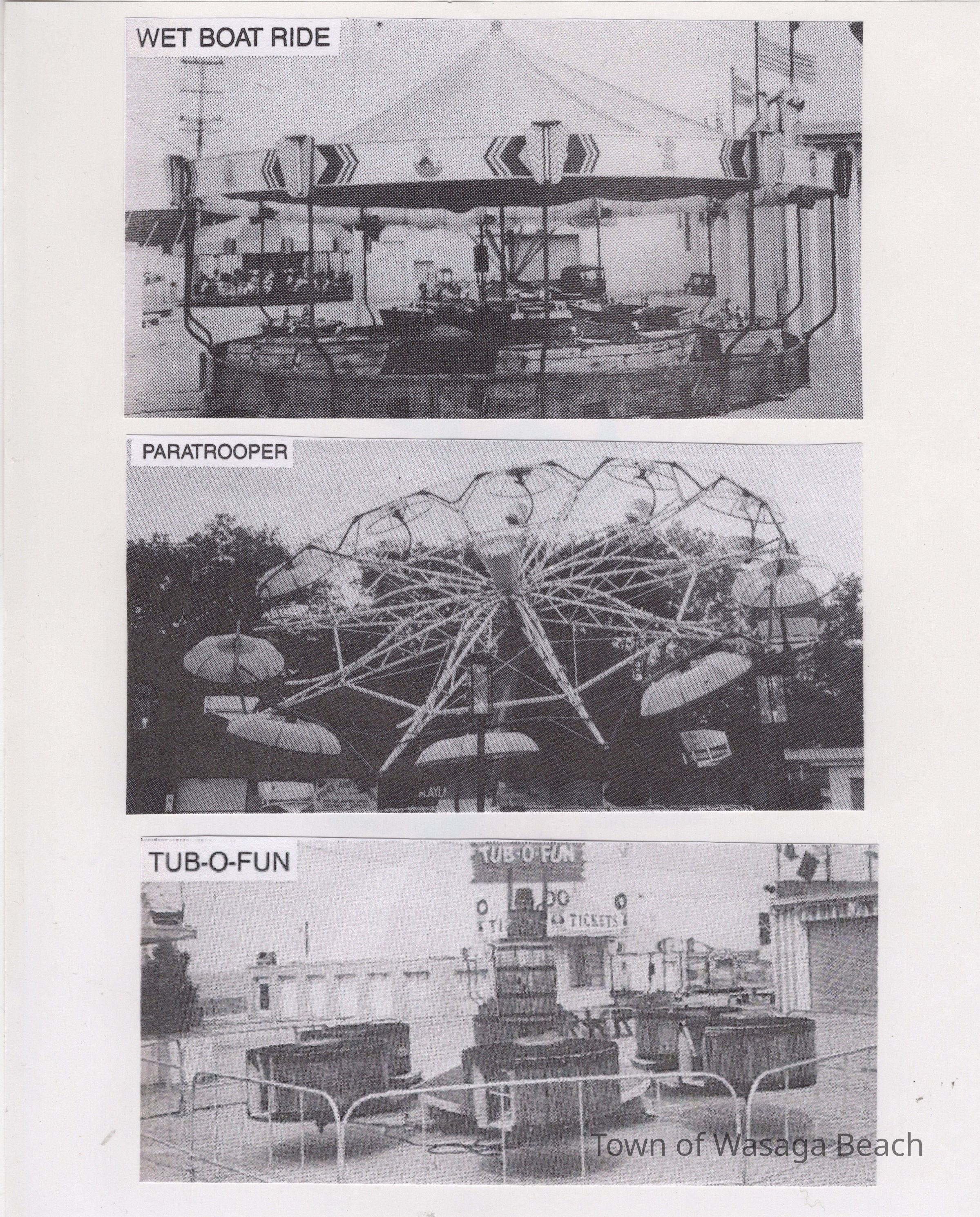 Pictures of Playland Park rides showing the Wet Boat Ride, Paratrooper, and Tub-O-Fun. Playland Park was an amusement park located at Beach Area 1 where the Playland Park Municipal parking lot now exists. Playland Park operated from 1932 - 1985.