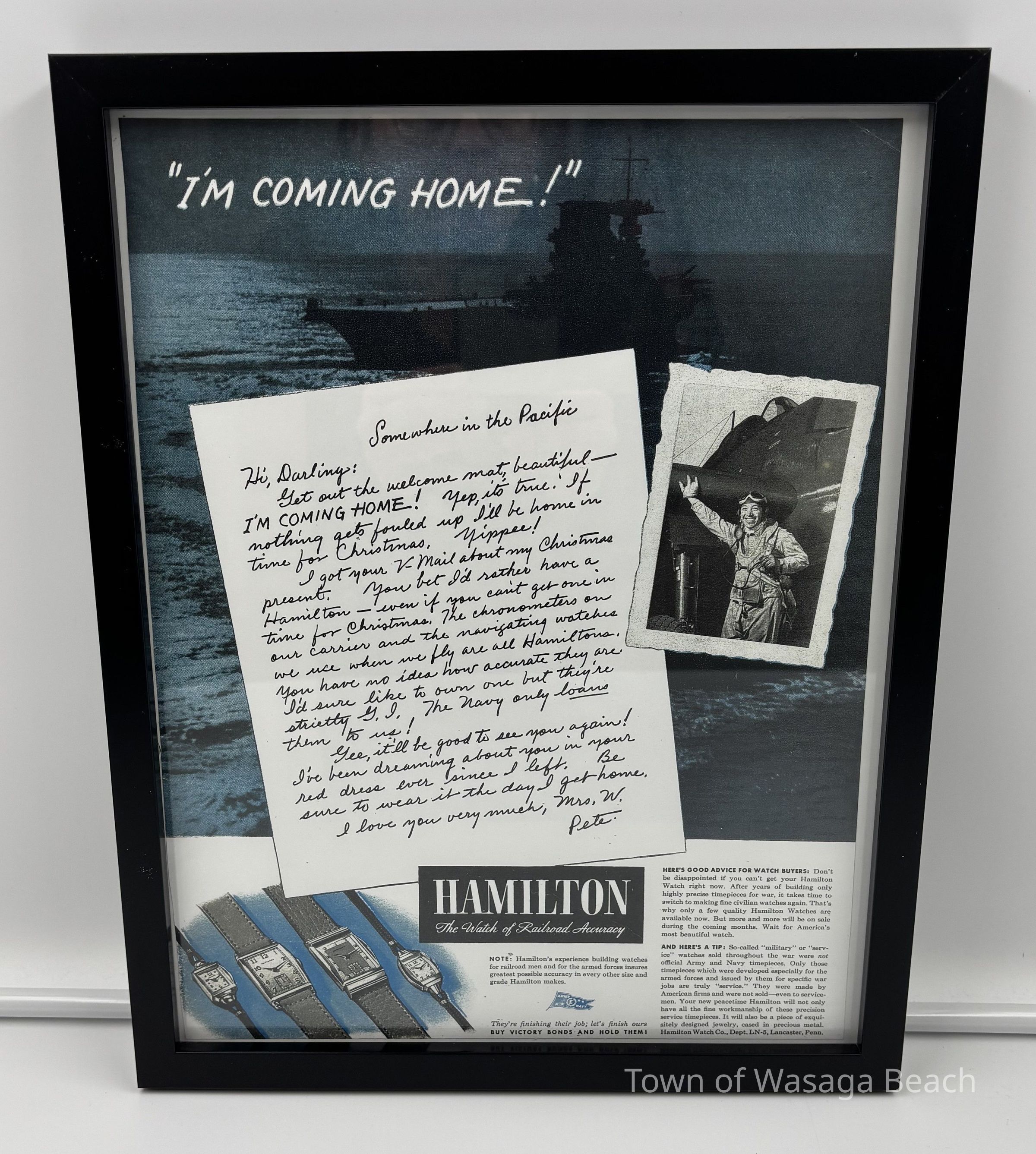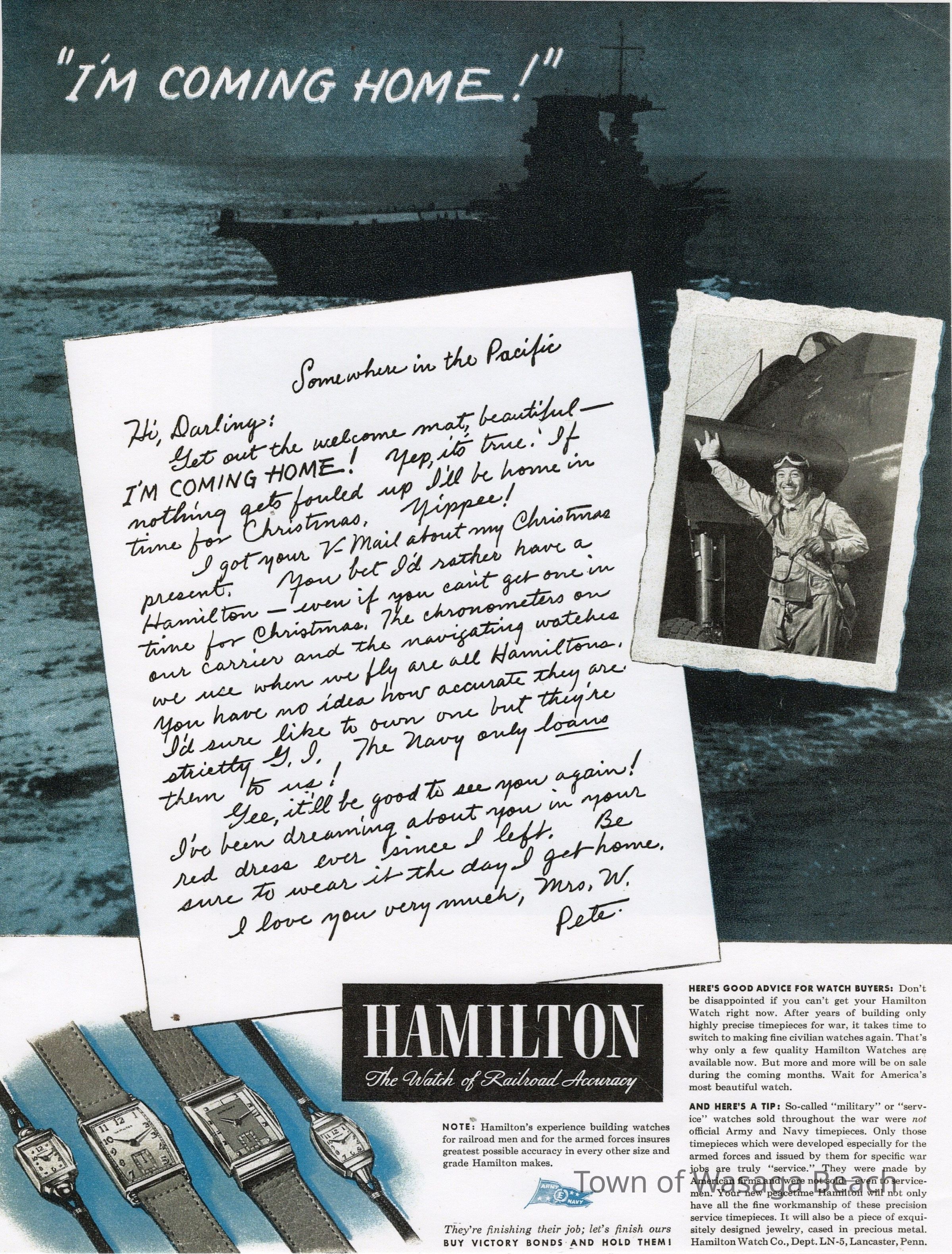 The poster includes a military pilot leaning on an aircraft with a "carrier" in the background, "Somewhere in the Pacific". In the letter to his wife, "Mrs. W. Pete", he notes how much he would like to own a Hamilton watch to assist with navigation and that he hopes to be home for Christmas.Acquisition