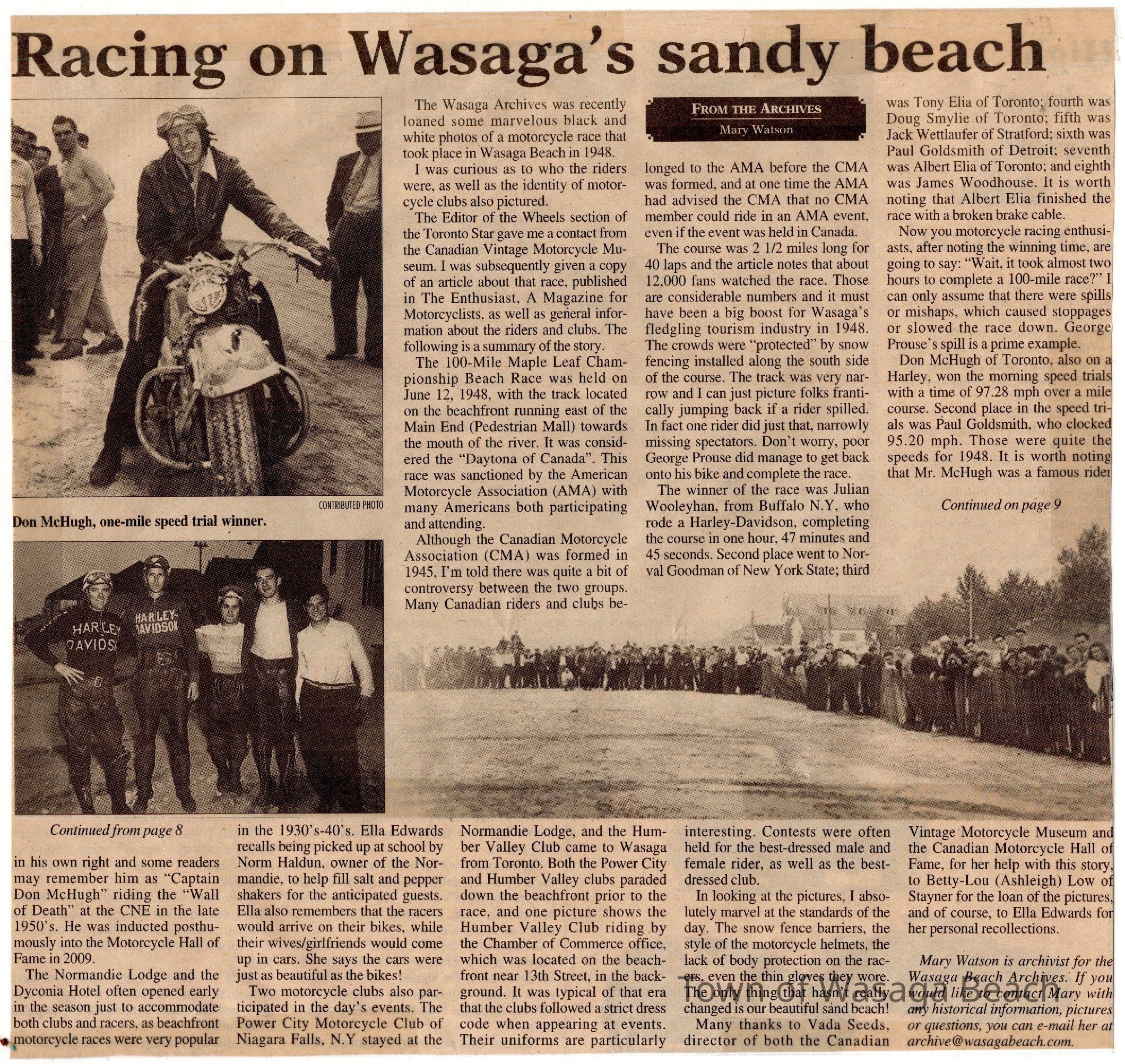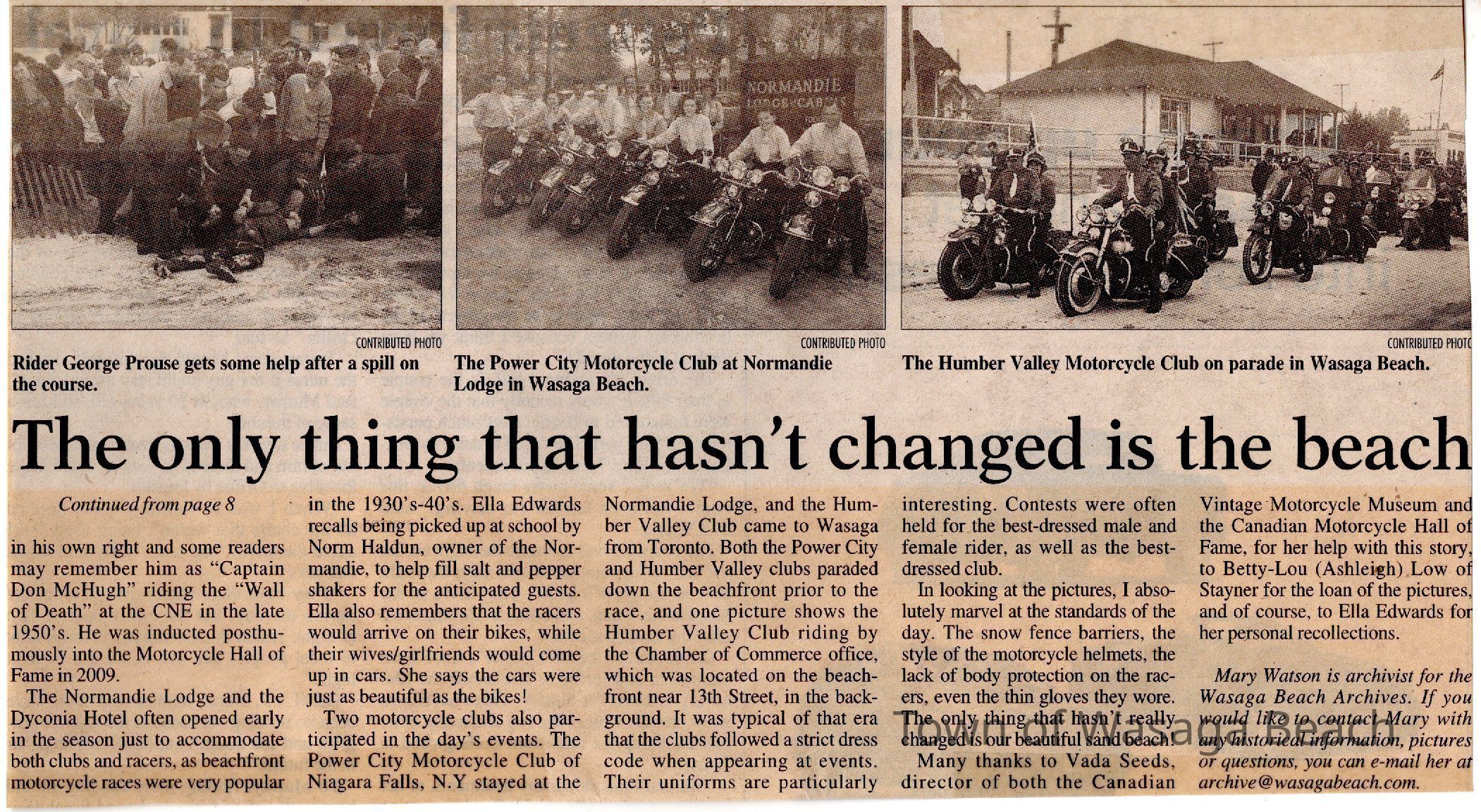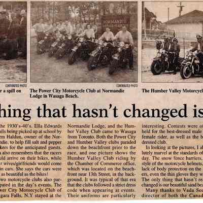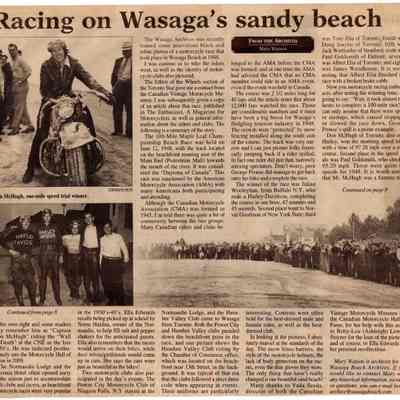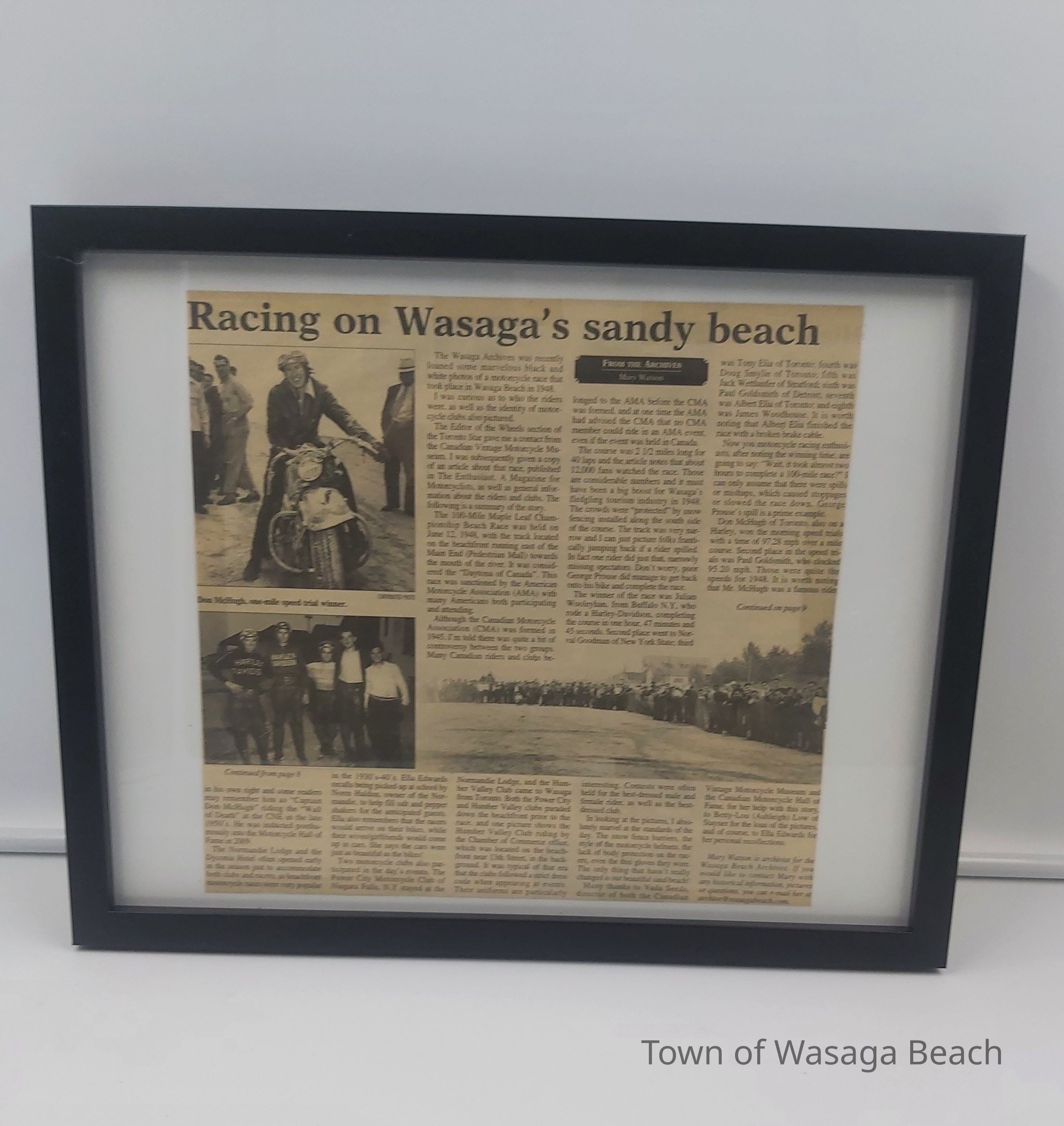 A framed copy of a newspaper article, written by Mary Watson, Town Archivist and Author, about the history of motorcycle racing on the beach in the 1930's and 1940's. The article details history of the Canadian and American Motorcycle Associations and documents race results and accomplishments of motorcycle racers. Memories of longtime local resident, Ella Edwards, are also included along with the mention of the Normandie Lodge and Dyconia Hotel as accomodation for racers and spectators. Contributions to the article were made by Vada Seeds, director of the Canadian Vintage Motorcycle Museum and the Canadian Motorcycle Hall of Fame, Betty-Lou (Ashleigh) Low and Ella Edwards.Acquisition