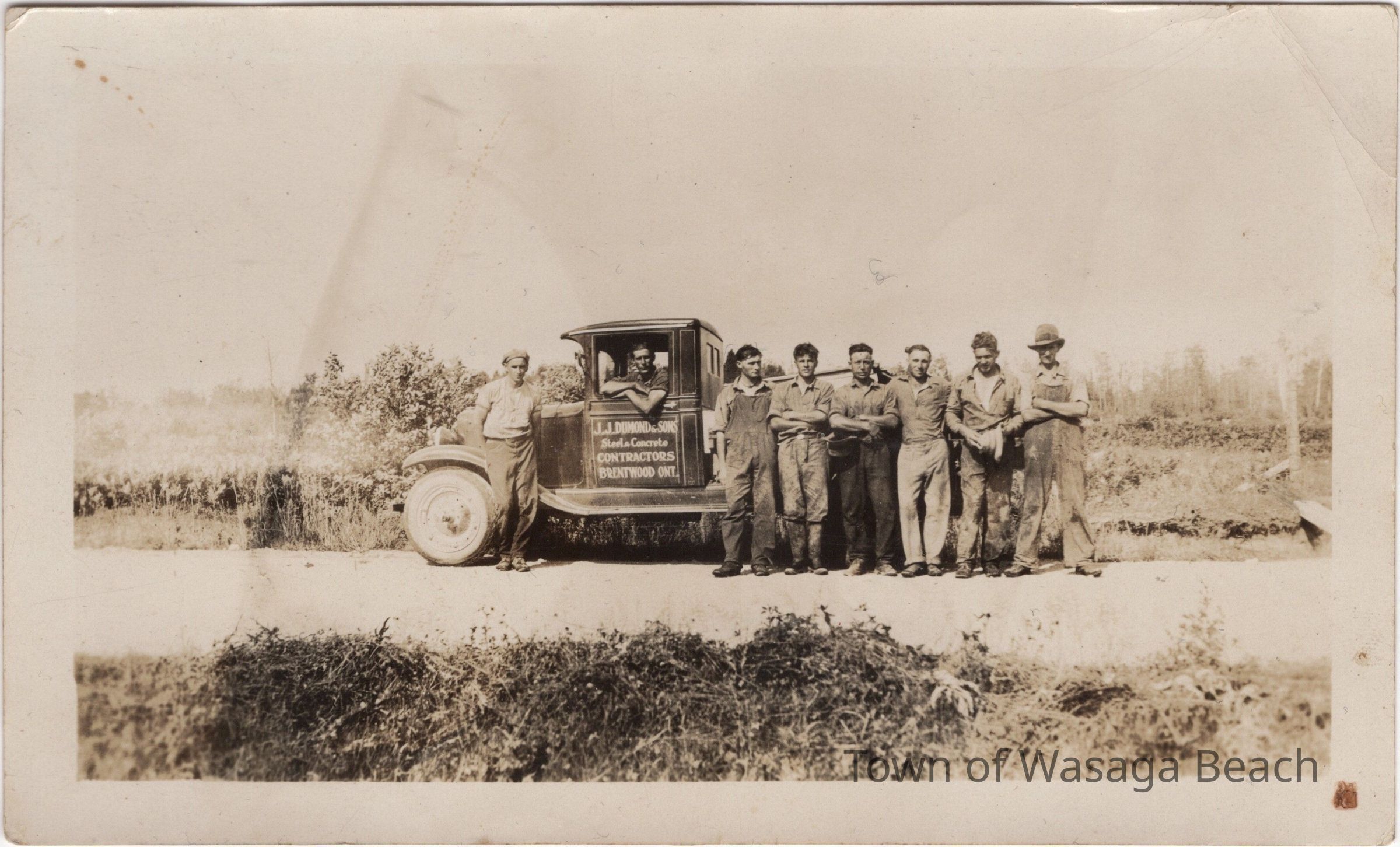 The photograph, features a vintage truck with a group of men who worked on building the Powers Bridge, on Klondike Park Road. The first abutment of the bridge was built in 1931. As noted on the back of the photograph, Reford Whiteside is pictured fourth from the left.