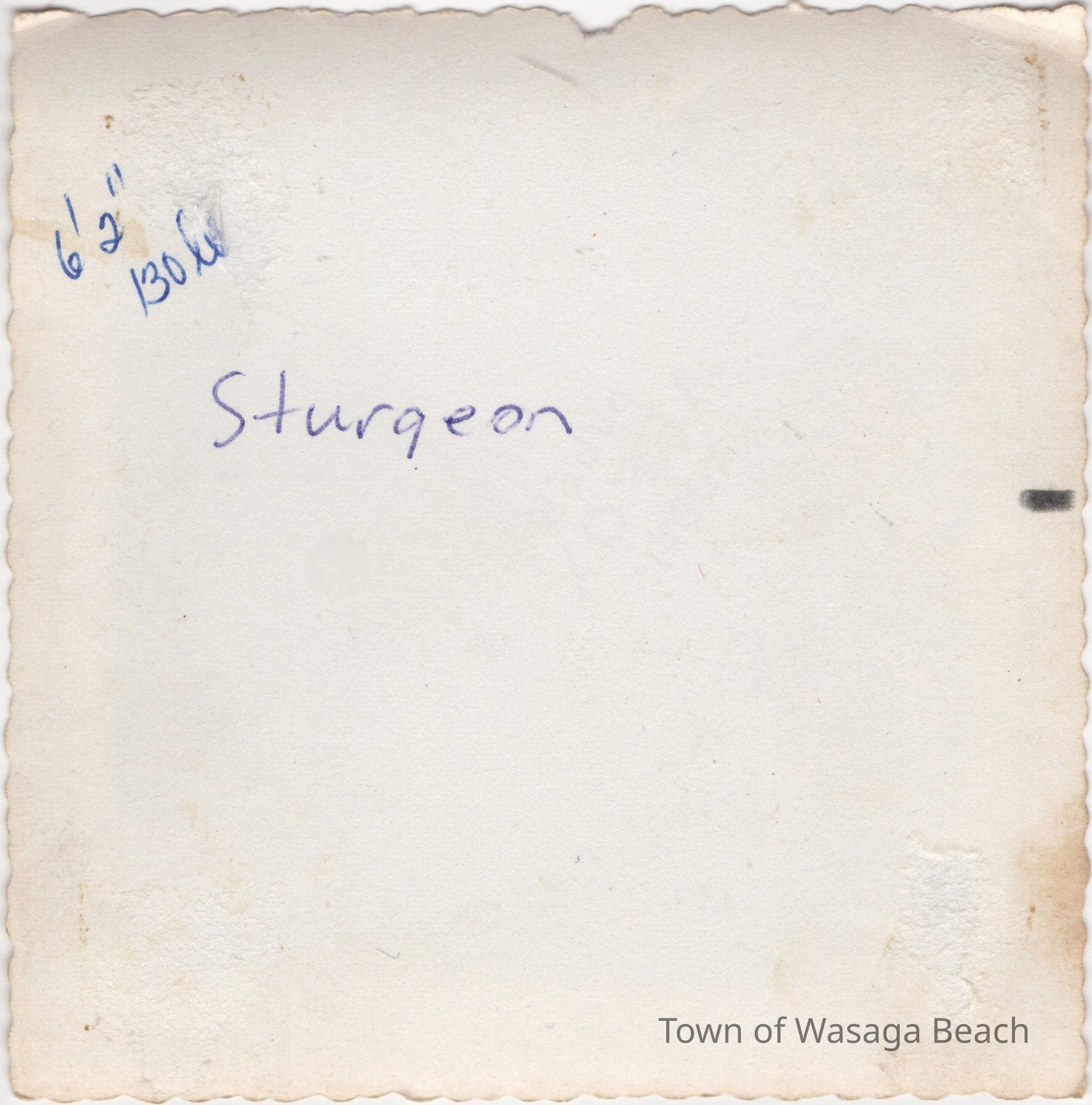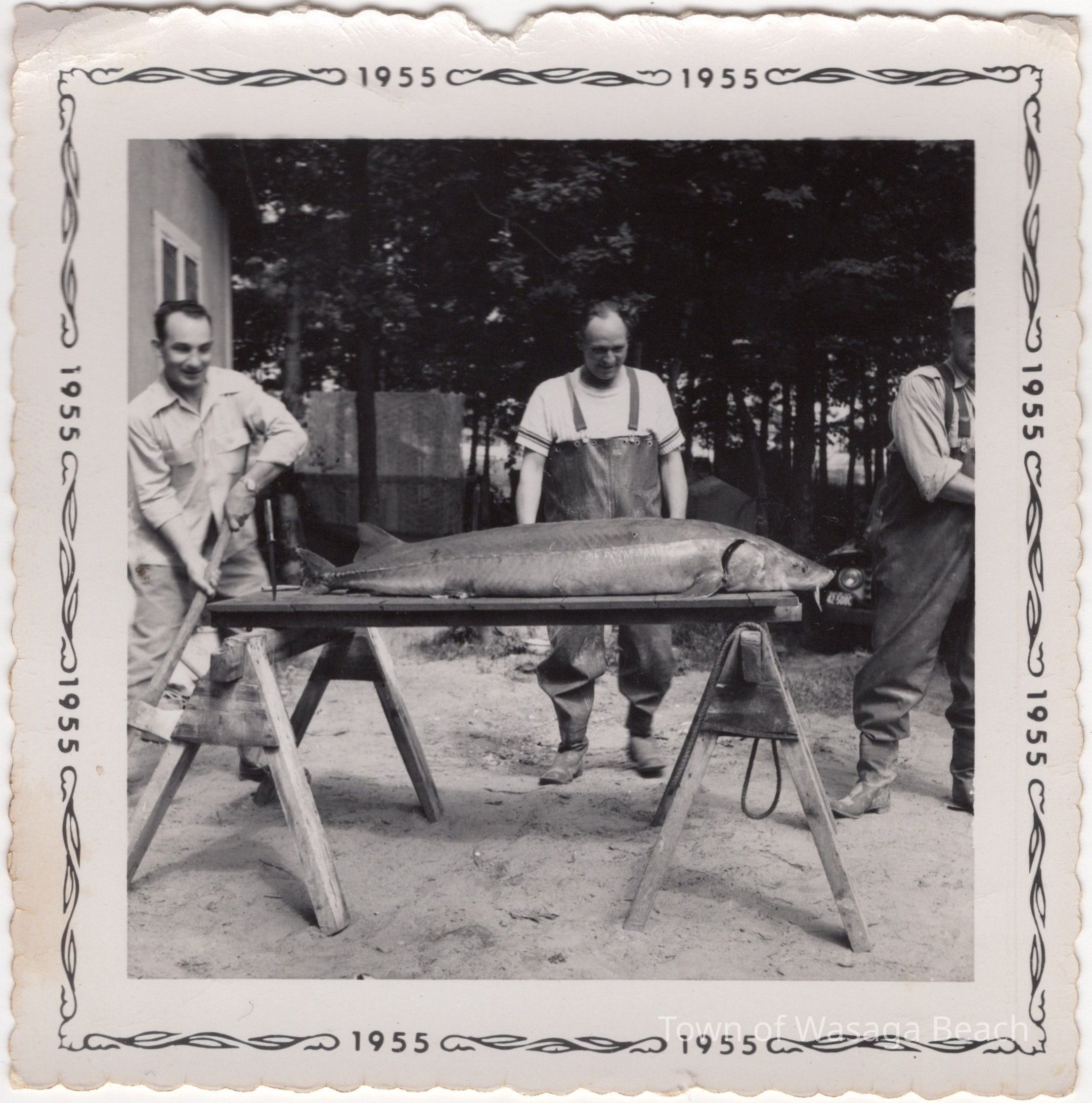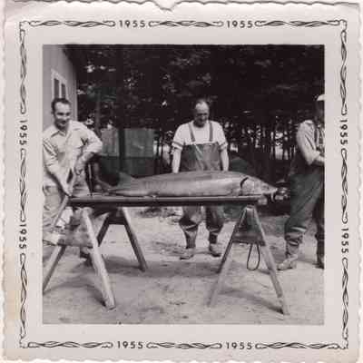 The first photograph dated 1955, shows Reford Whiteside with his back to the camera with a 6'2" long, 130 lb. sturgeon fish. The second photograph shows the sturgeon with Reford and two gentleman looking on.