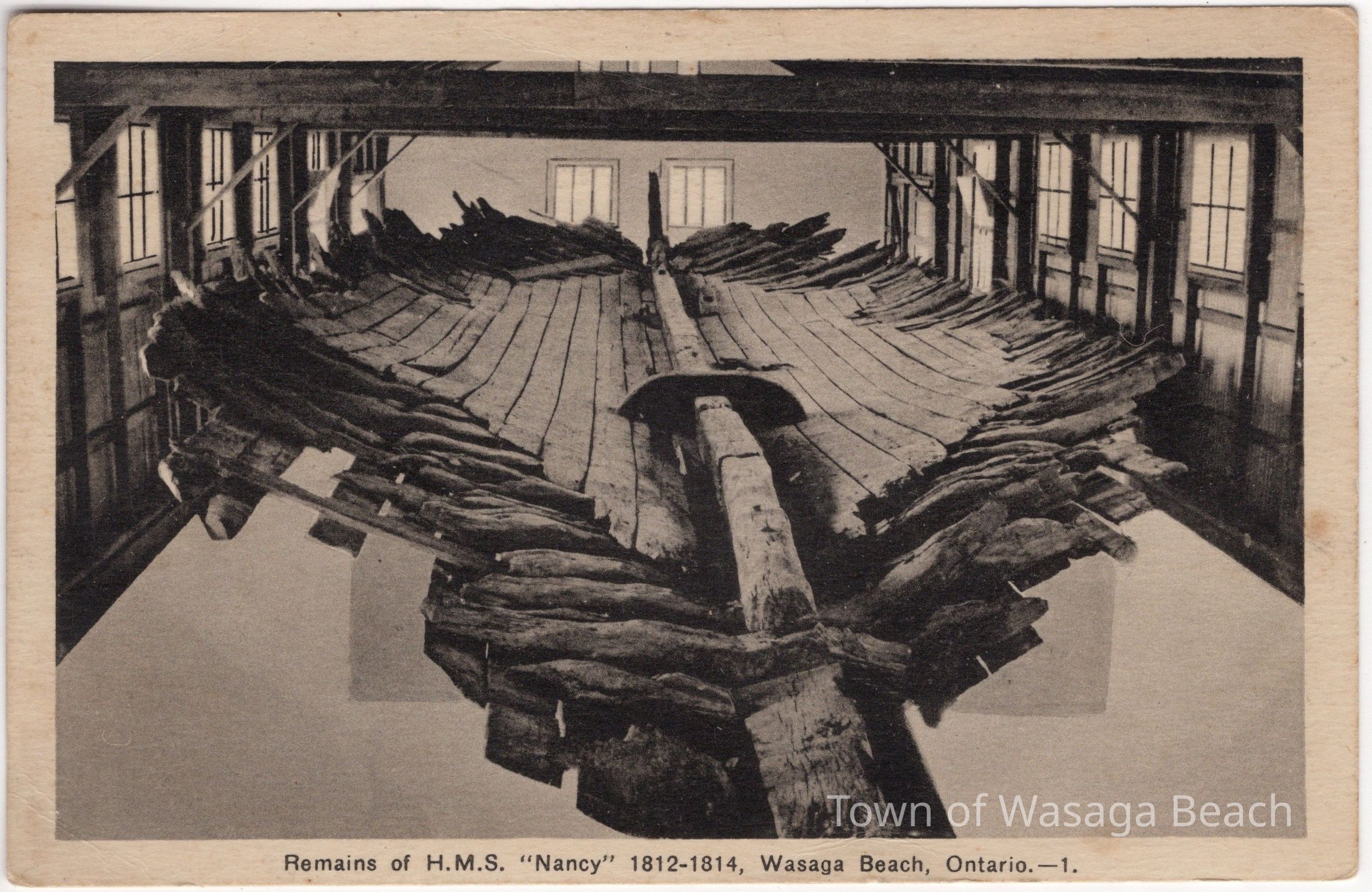 The post card, circa 1930's, shows a picture of the remains of the hull of the H.M.S. Nancy enclosed inside a structure. The title on the bottom of the post card reads: Remains of H.M.S. "Nancy" 1812-1814, Wasaga Beach, Ontario. -1".