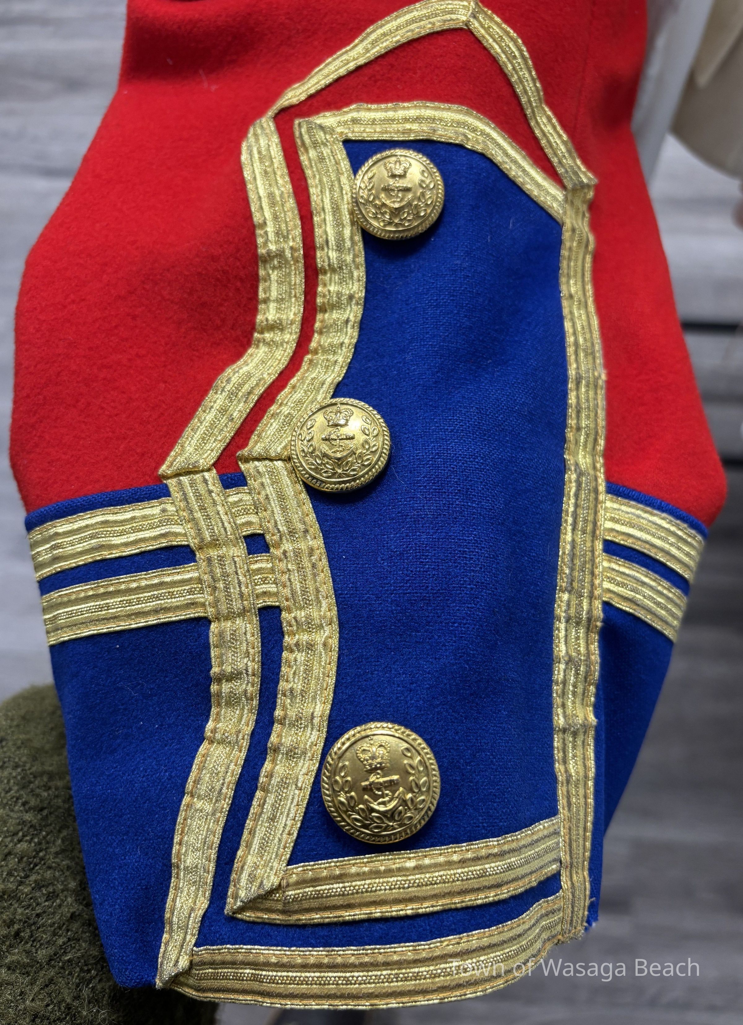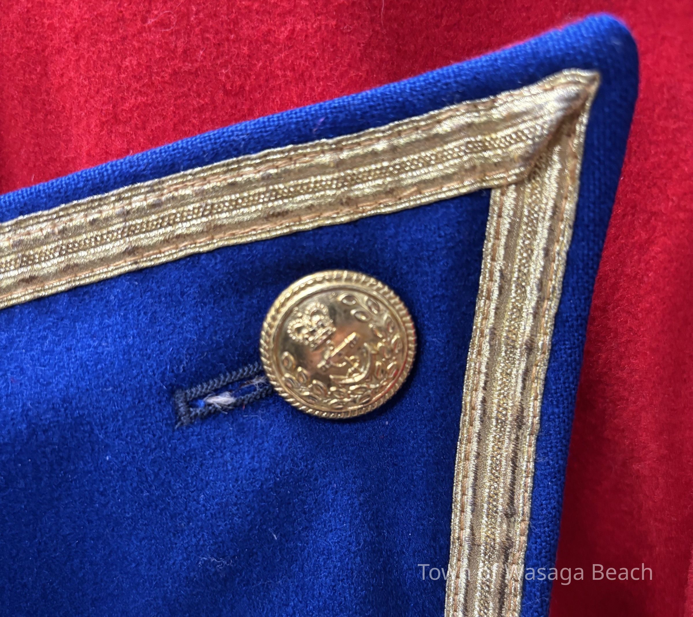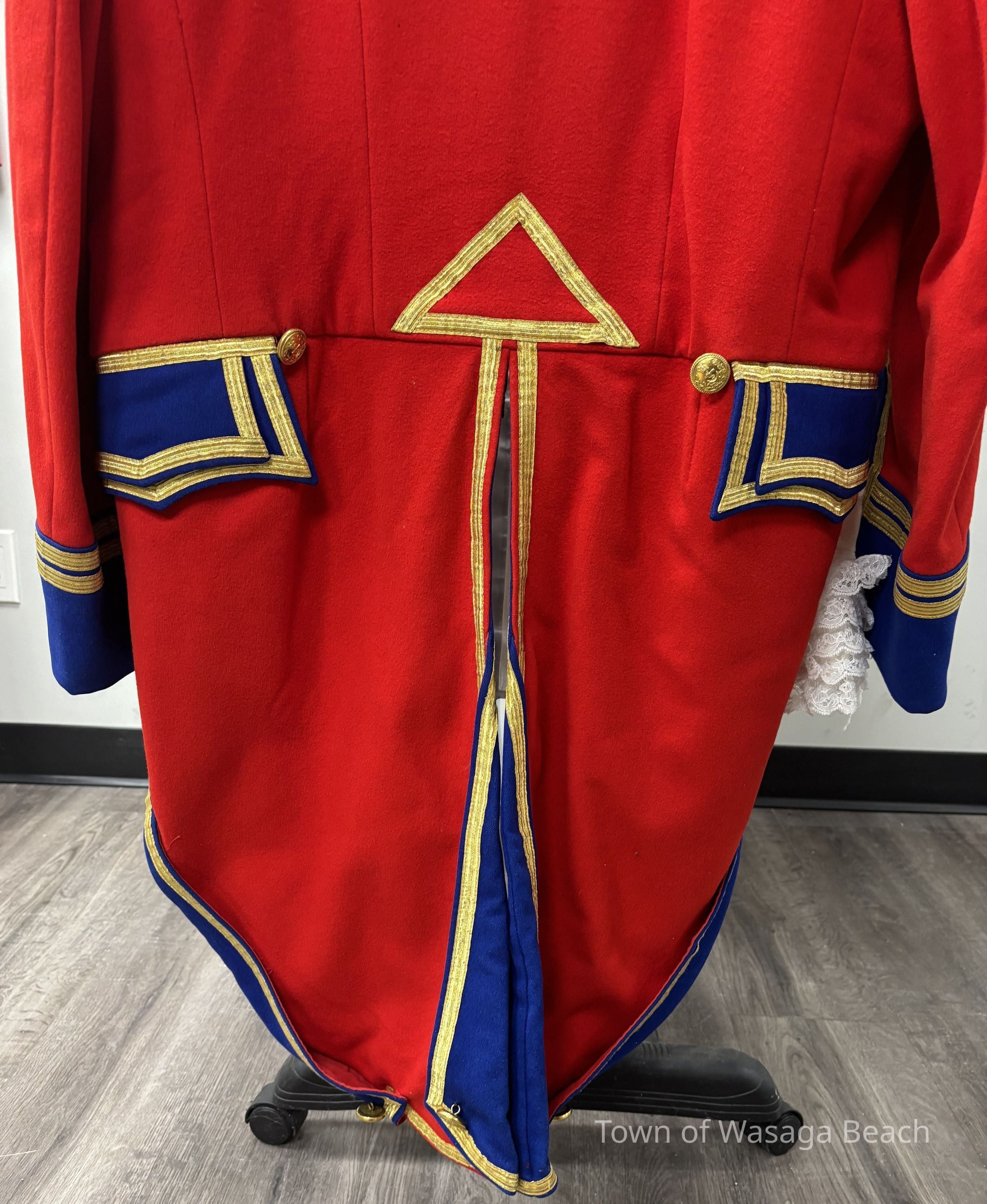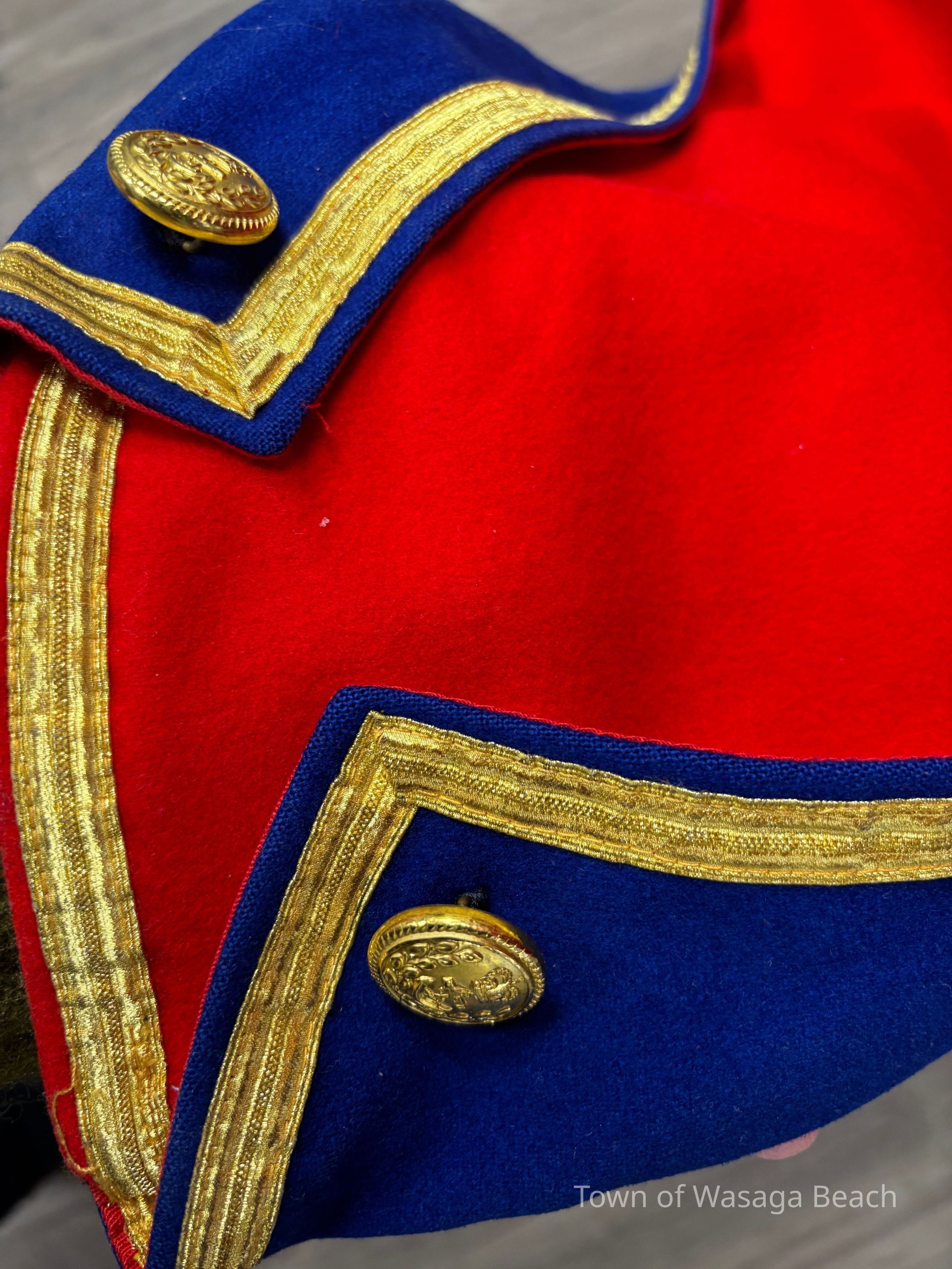 The Town Crier uniform, generously donated by family friend Bill Aiken in 2026, is of colonial style. Also called “livery” and never “a costume”, the frock coat was representative of the community. Town crier uniforms were distinct featuring specific elements of the heritage of the area they represented. The Wasaga Beach Town Crier uniform, with red, gold and blue, reflects the heavy influence of British military tradition and the significant historical role the area played during the schooner Nancy’s War of 1812 defense of the British Empire and then the British Navy’s Establishment at Schooner Town 1815-1818.