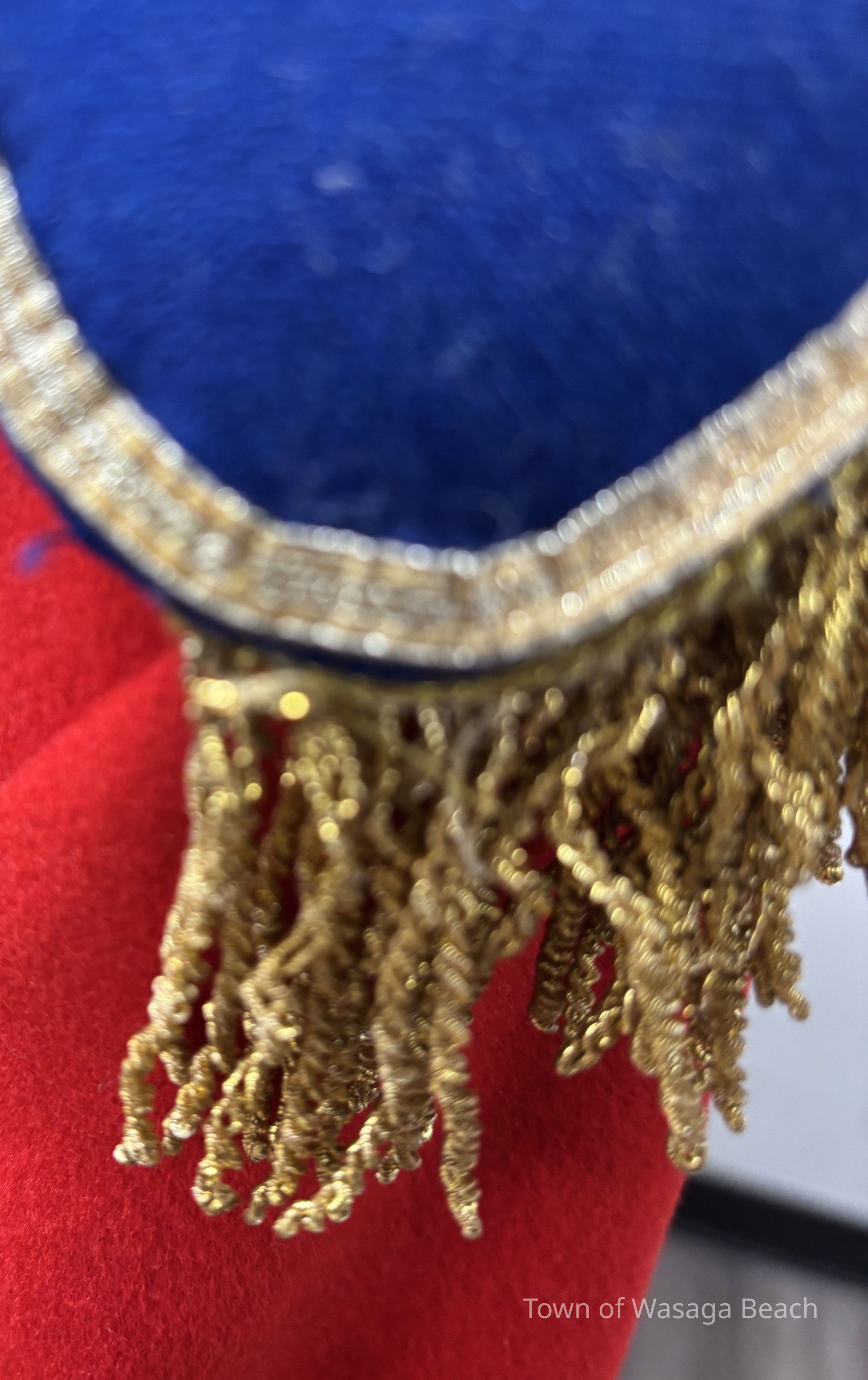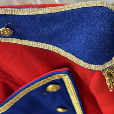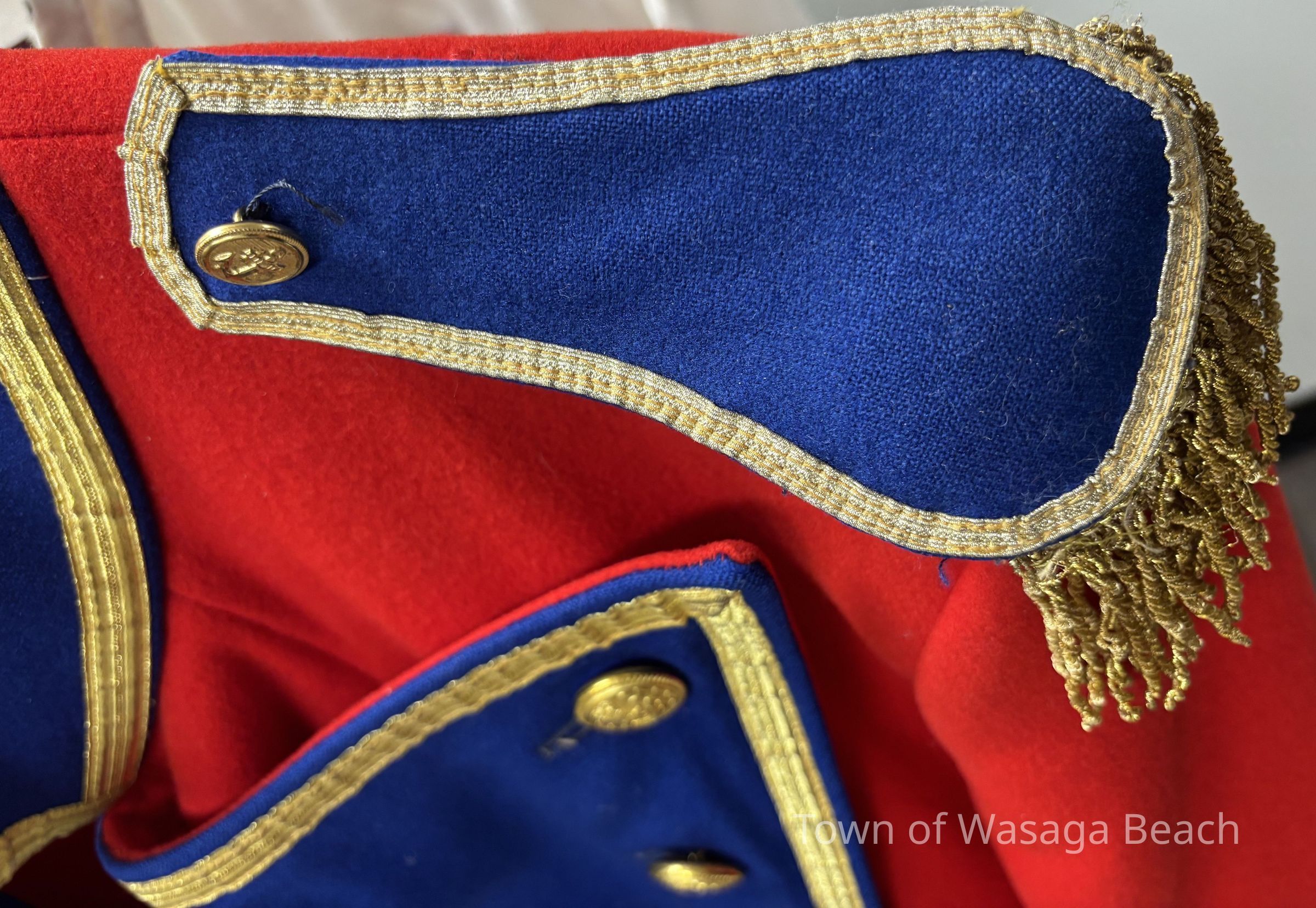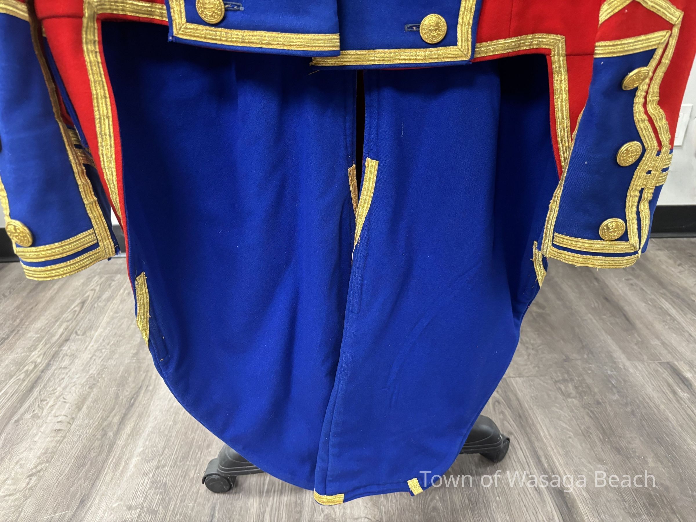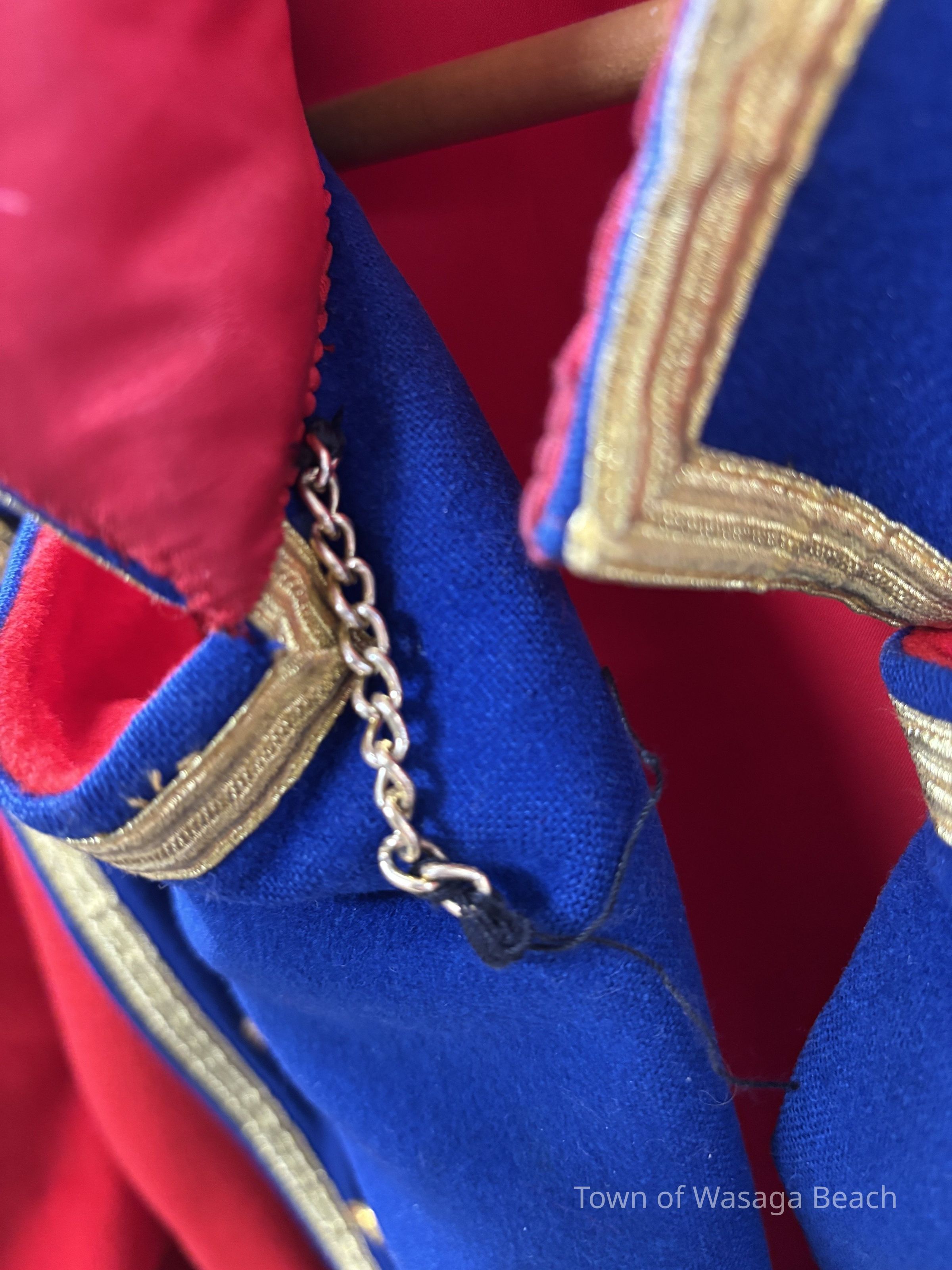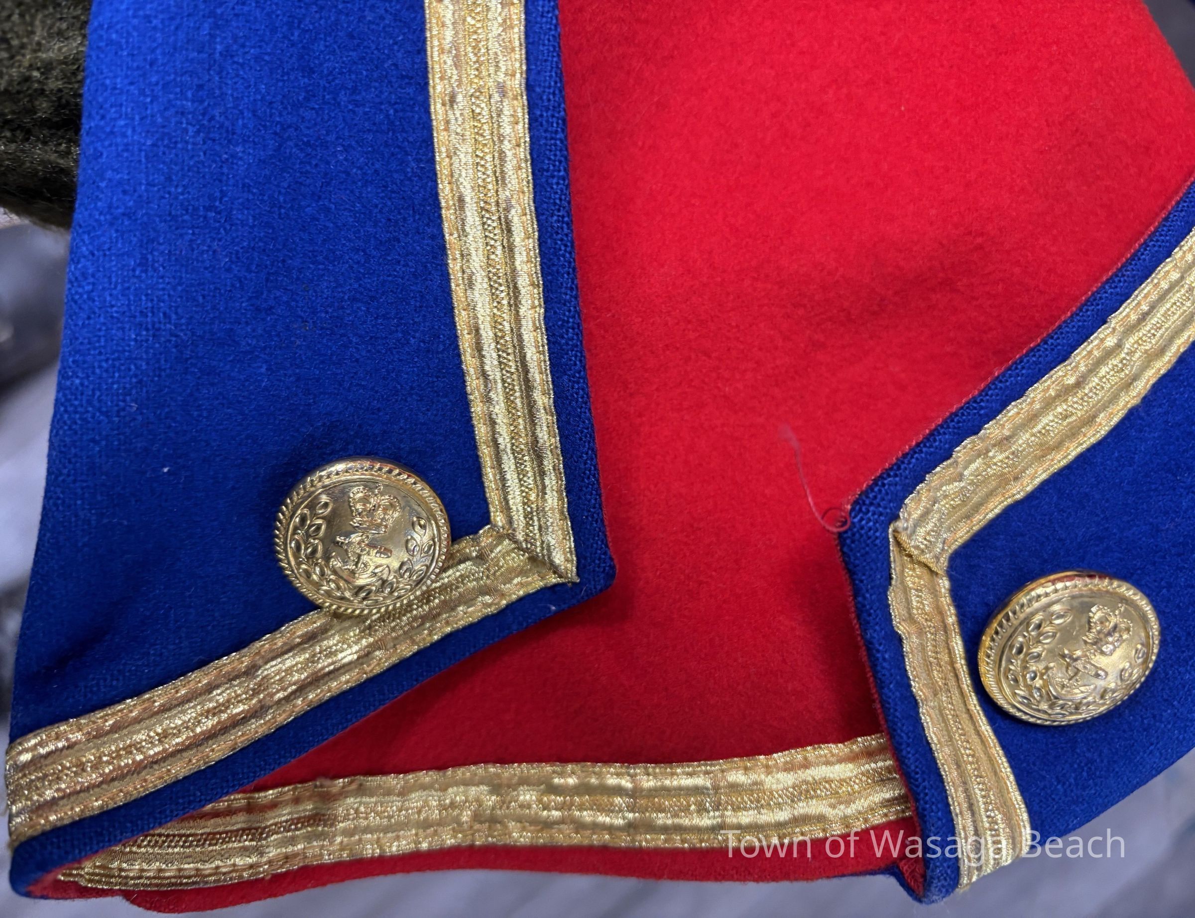 The Town Crier uniform, generously donated by family friend Bill Aiken in 2026, is of colonial style. Also called “livery” and never “a costume”, the frock coat was representative of the community. Town crier uniforms were distinct featuring specific elements of the heritage of the area they represented. The Wasaga Beach Town Crier uniform, with red, gold and blue, reflects the heavy influence of British military tradition and the significant historical role the area played during the schooner Nancy’s War of 1812 defense of the British Empire and then the British Navy’s Establishment at Schooner Town 1815-1818.