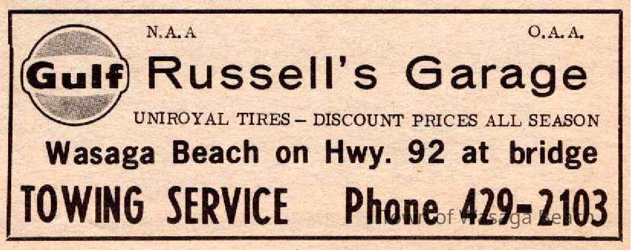 Russell' Garage, newspaper advertisement, Elmvale Lance - November 13, 1969, located on the west side of Main Street between Glenwood Drive and River Avenue Crescent.Acquisition