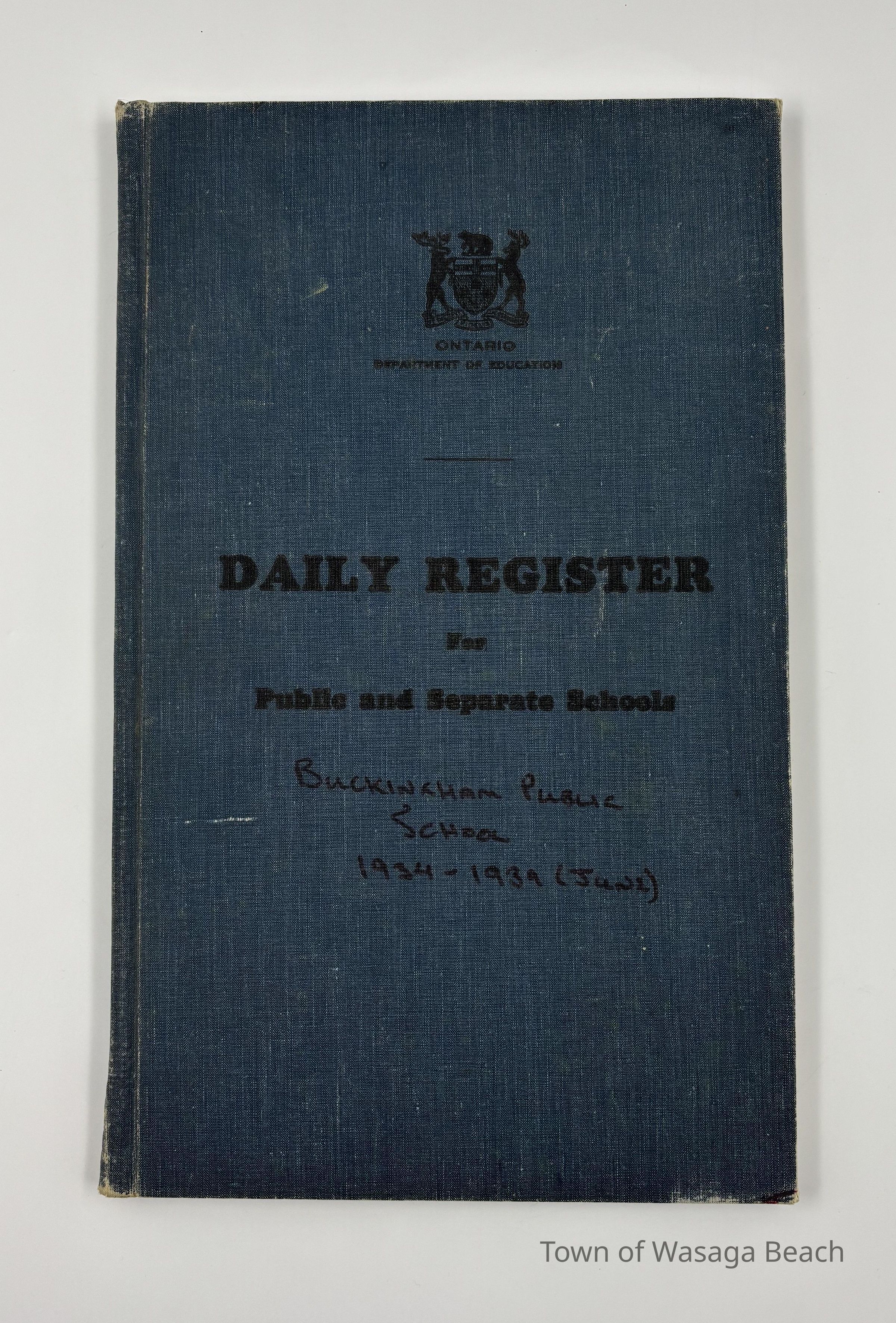 Ontario Department of Education, Public or Separate School Daily Register, hardcover daily attendance registry from Buckingham Public School, 1934-1939.Context
