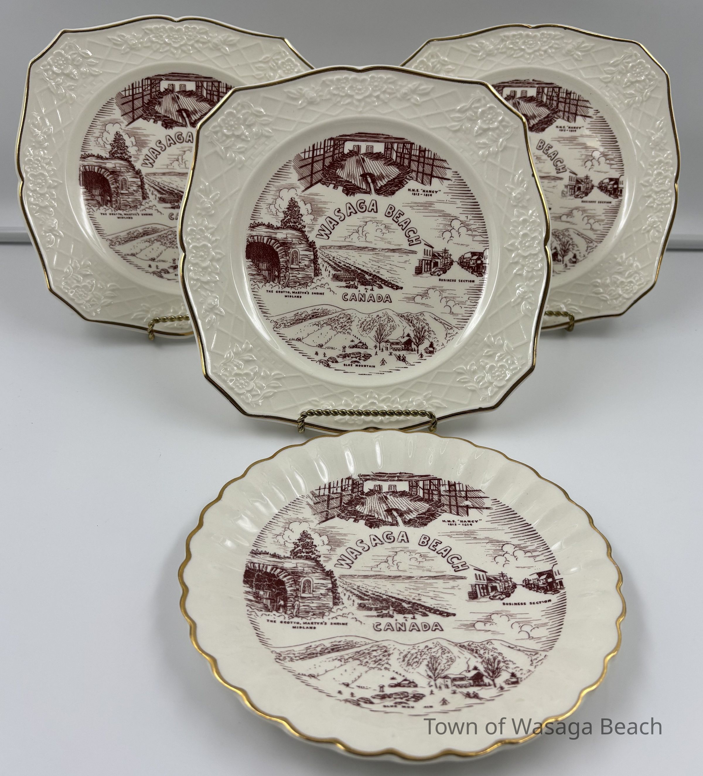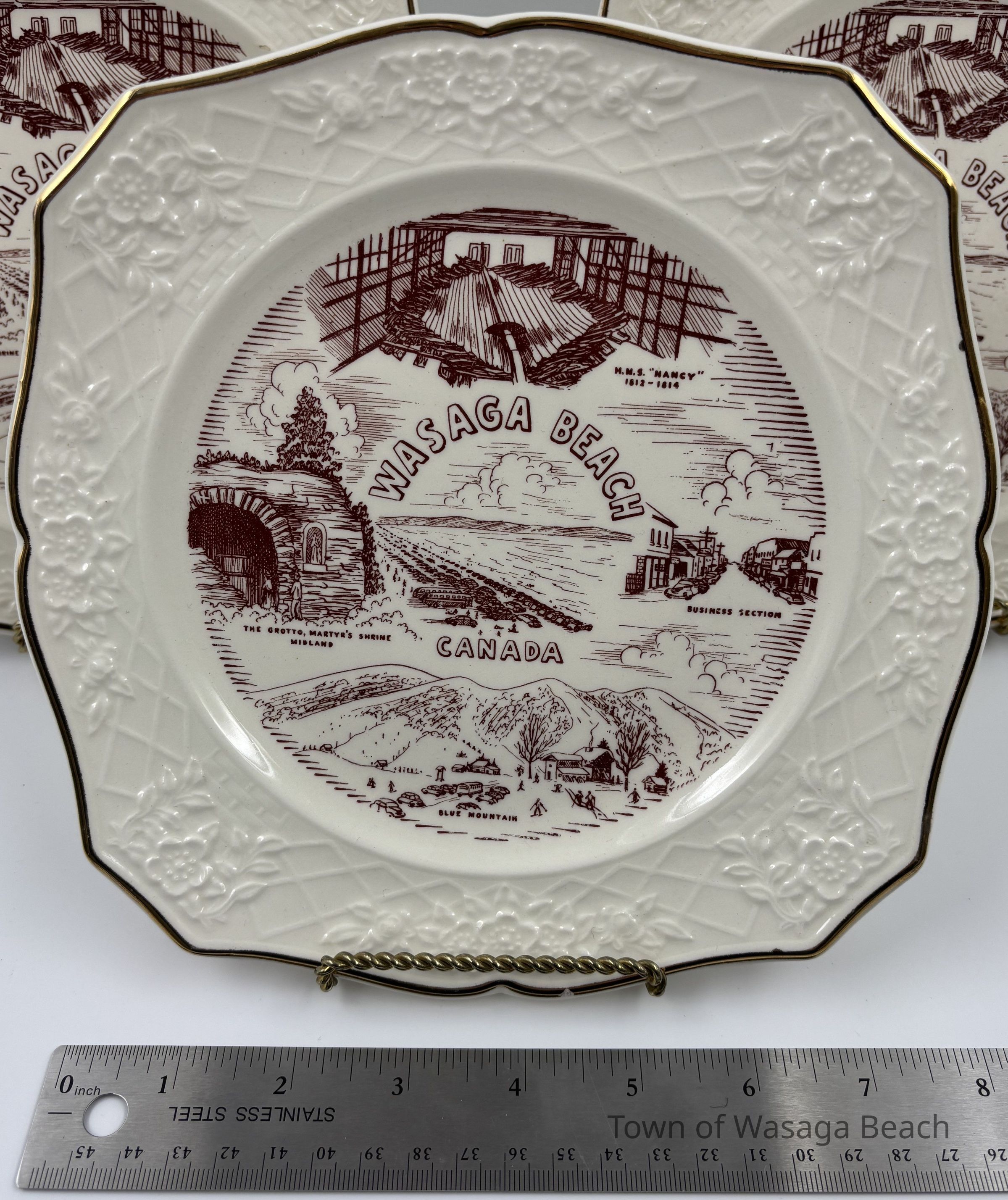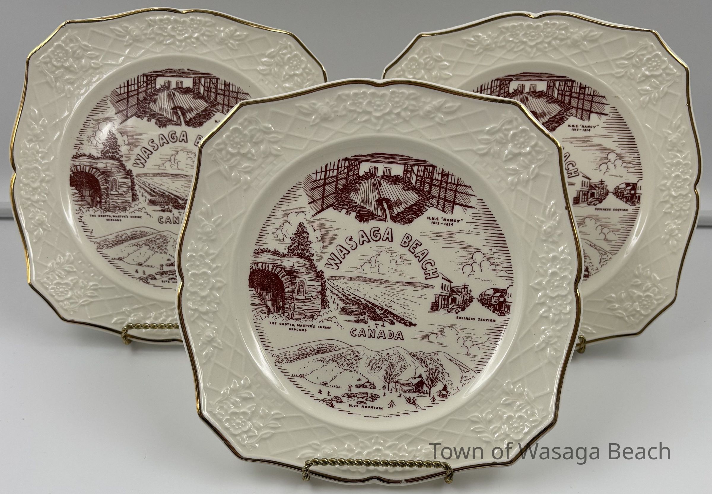 Each ivory/white souvenir plate is imprinted in the colour burgundy with a circular image featuring scenes from the H.M.S. "Nancy", Wasaga Beach Historic Main Street, Martyr's Shrine, Midland and Blue Mountain. The decorative edges of the plates are trimmed with 22K gold. The back of each plate has an emblem stamped in gold that includes a maple leaf with "DECORATED IN CANADA" imprinted across the leaf in a small banner. Below the maple leaf emblem reads "22 K GOLD". Pieces of china were often imported and then decorated with gold and other details within Canada. China was decorated with 22k gold in Canada for items like commemorative plates for special occasions or events.Acquisition