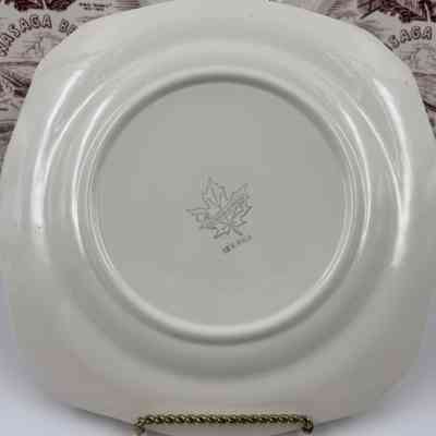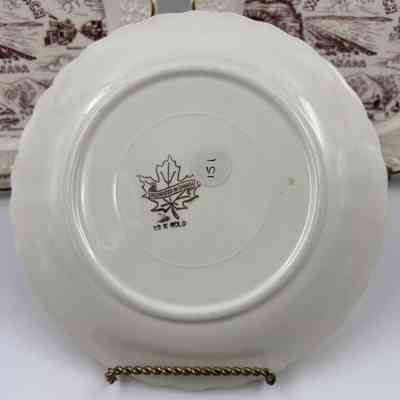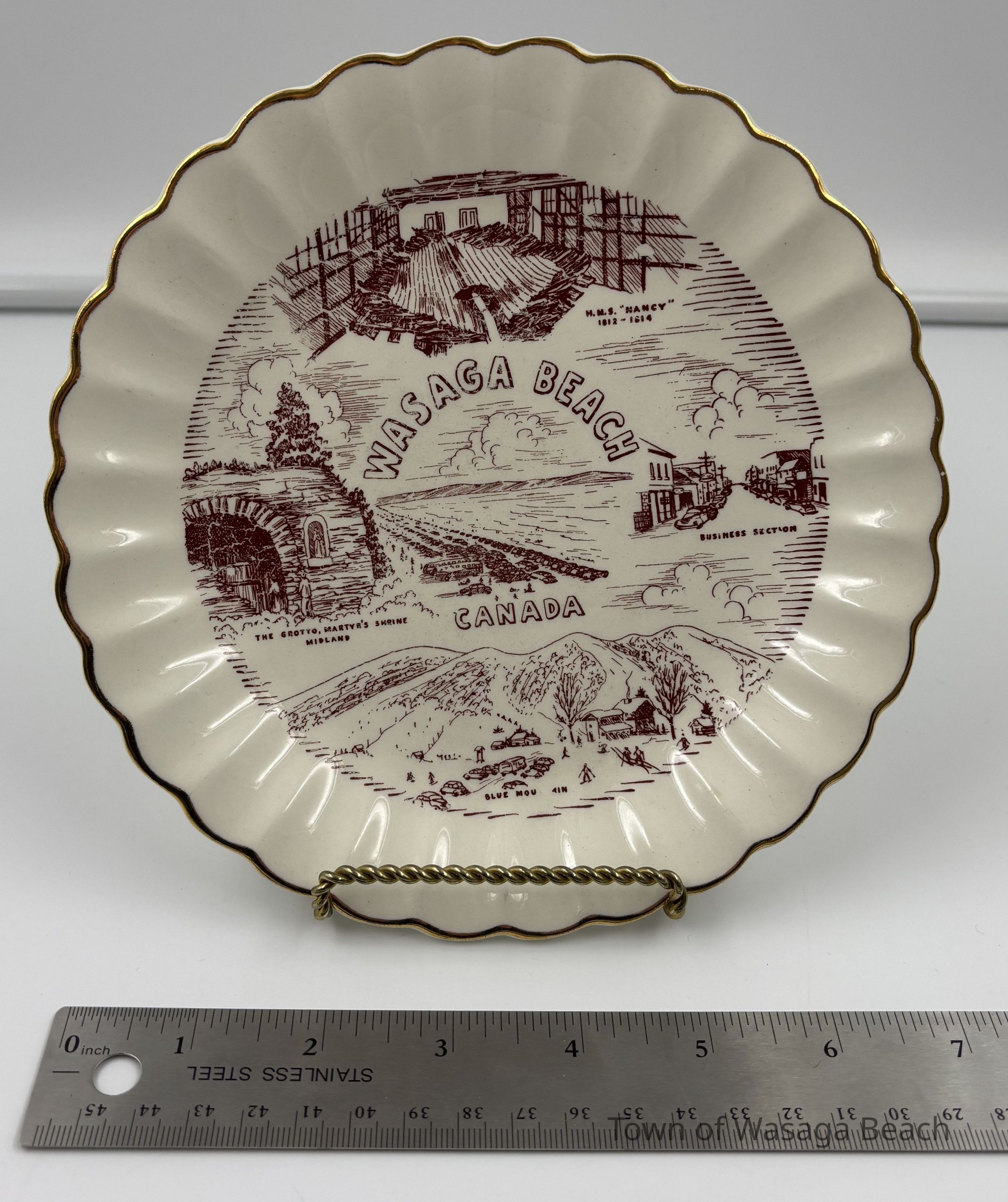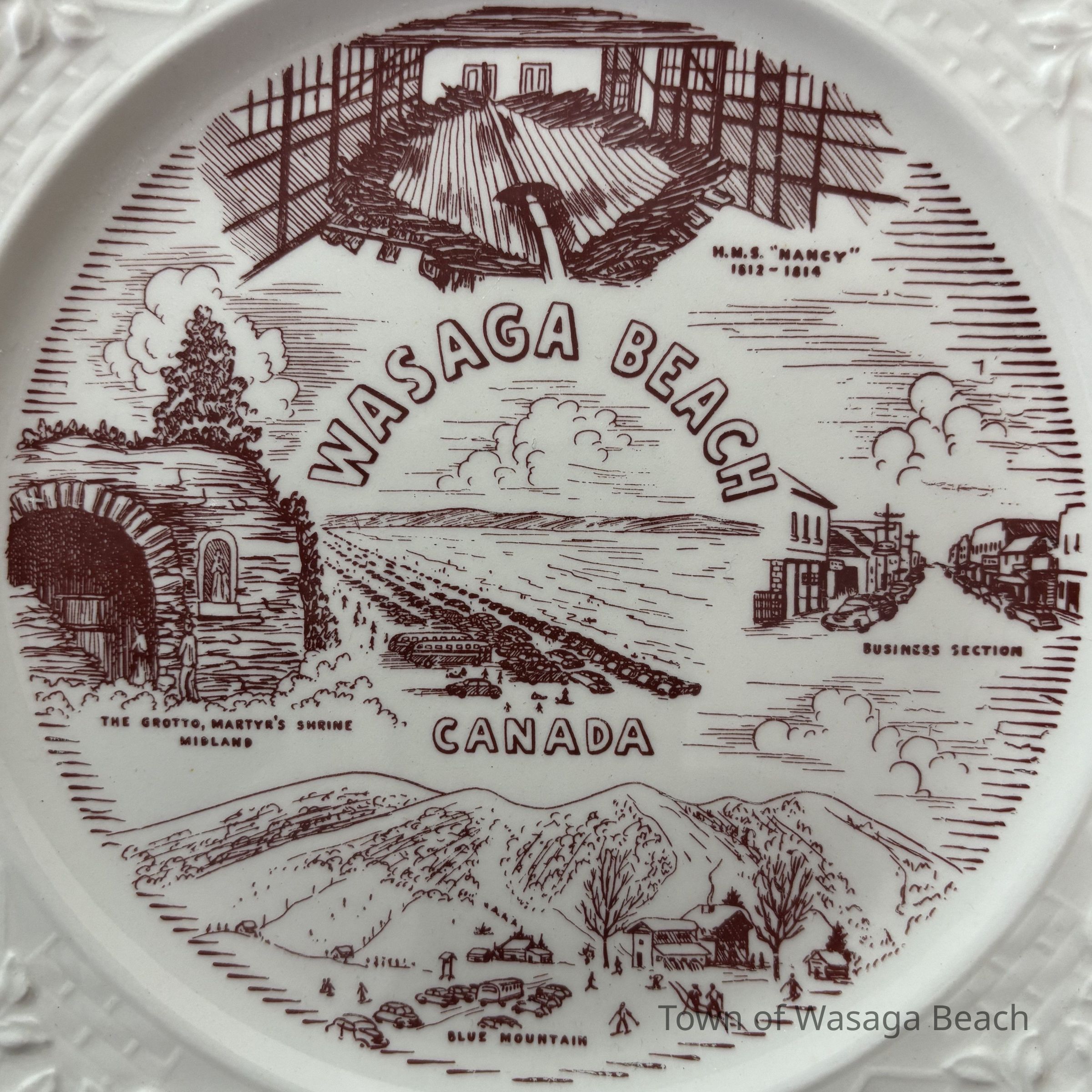 Each ivory/white souvenir plate is imprinted in the colour burgundy with a circular image featuring scenes from the H.M.S. "Nancy", Wasaga Beach Historic Main Street, Martyr's Shrine, Midland and Blue Mountain. The decorative edges of the plates are trimmed with 22K gold. The back of each plate has an emblem stamped in gold that includes a maple leaf with "DECORATED IN CANADA" imprinted across the leaf in a small banner. Below the maple leaf emblem reads "22 K GOLD". Pieces of china were often imported and then decorated with gold and other details within Canada. China was decorated with 22k gold in Canada for items like commemorative plates for special occasions or events.Acquisition