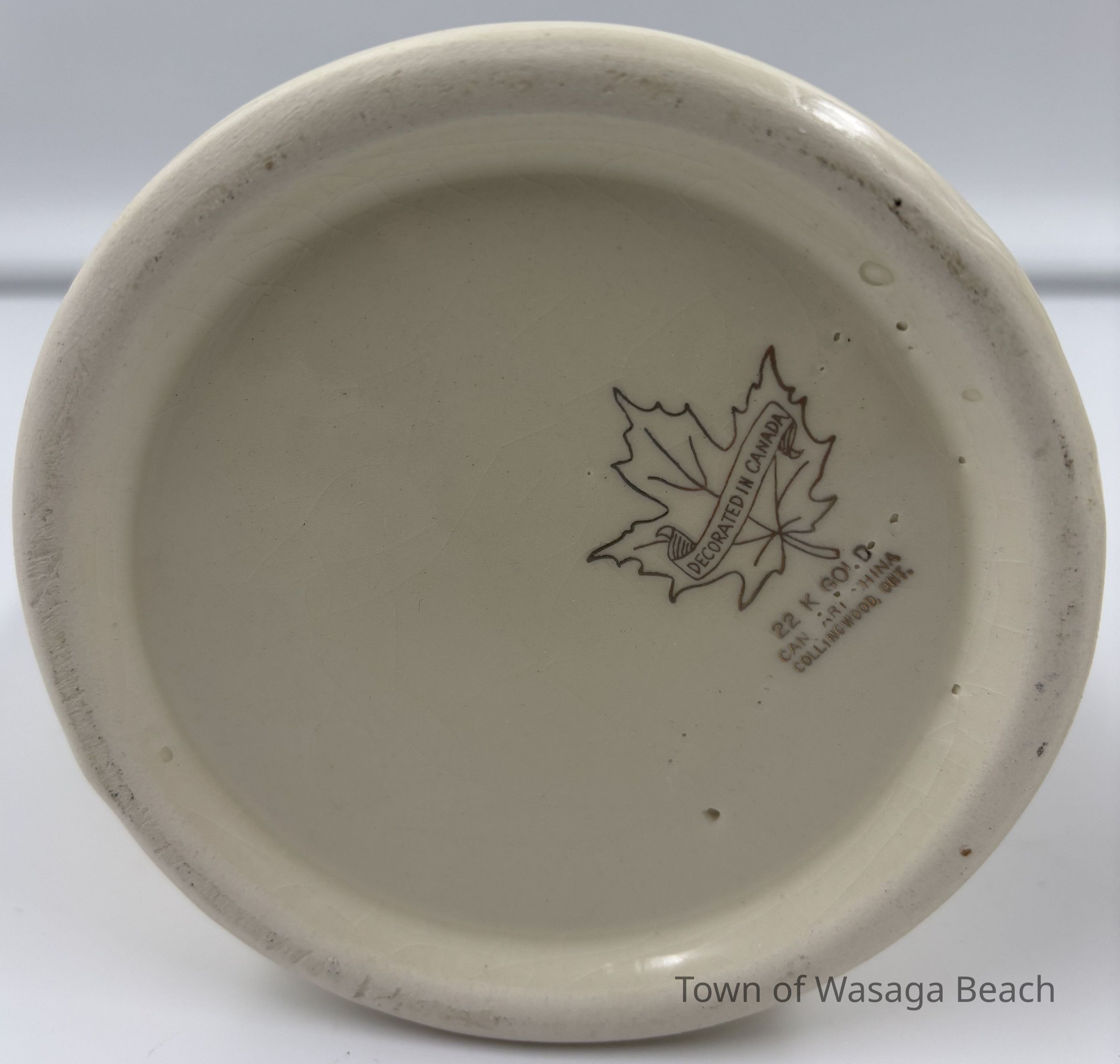 The steins are decorated with 22K gold. The bottom of each plate has an emblem stamped in gold that includes a maple leaf with "DECORATED IN CANADA" imprinted across the leaf in a small banner. Below the maple leaf emblem reads "22 K GOLD" and "CAN ART CHINA COLLINGWOOD, ONT." Blank pieces of china were often imported and then decorated with gold and other details for items like commemorative plates for special occasions or events. Canadian Art China was located in Collingwood, Ontario.Acquisition