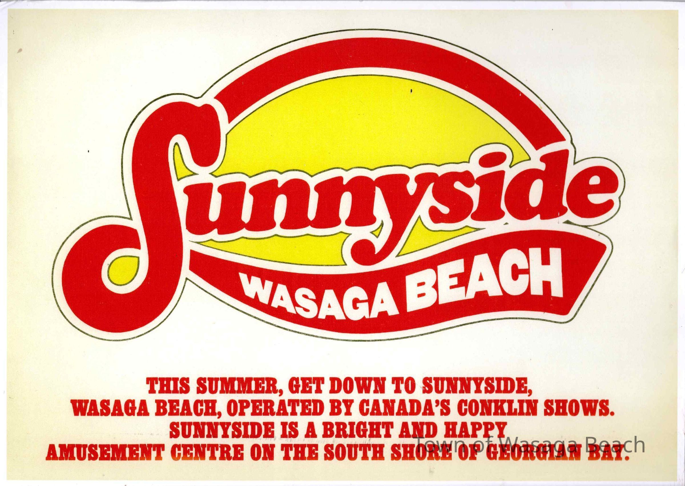 Sign for Sunnyside, Wasaga Beach, circa 1960, - Text reads: This summer, get down to Sunnyside, Wasaga Beach, operated by Canada's Conklin Shows. Sunnyside is a bright and happy amusement centre on the south shore of Georgian Bay."Dimensions