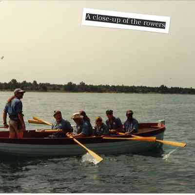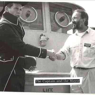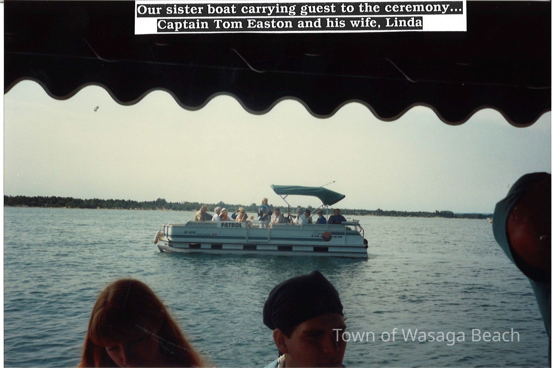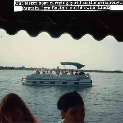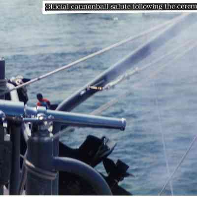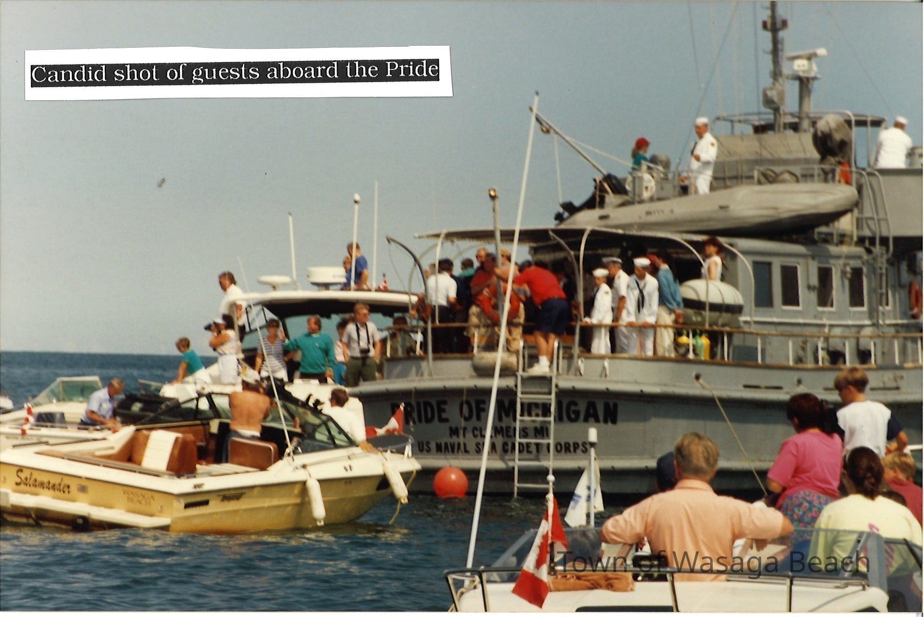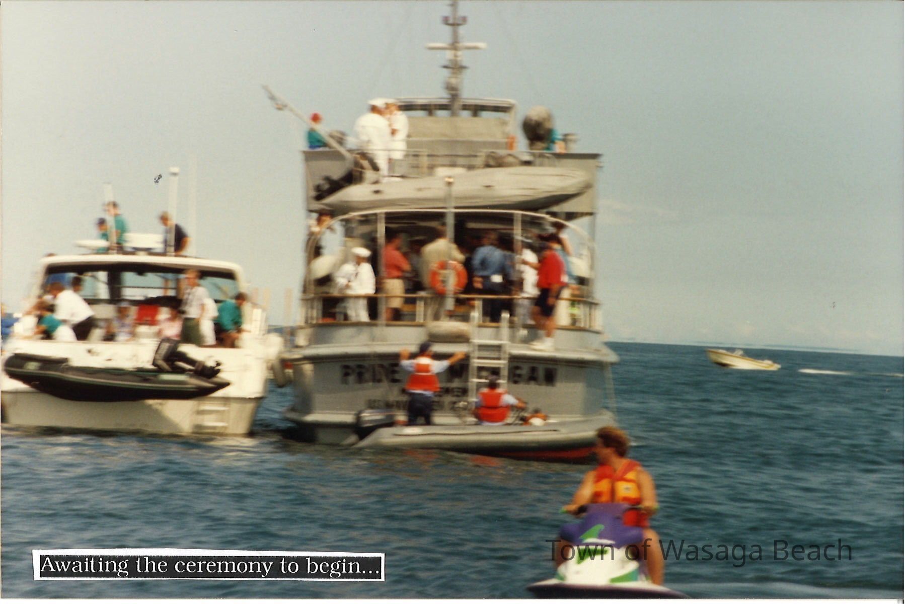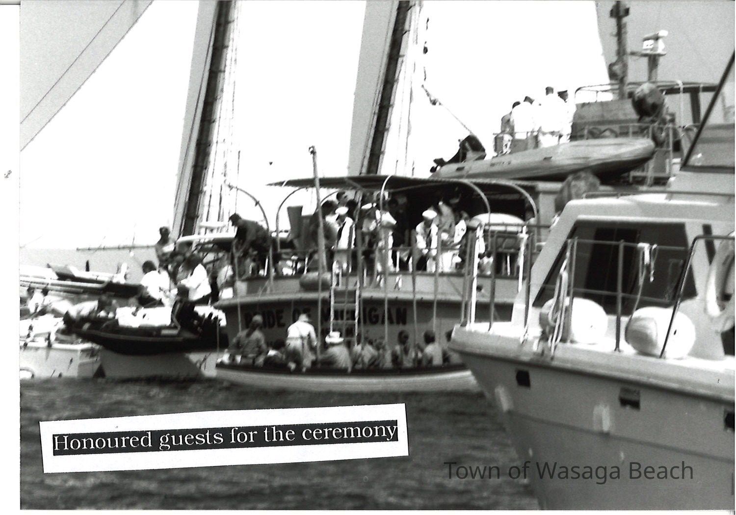 The album features "The Ceremony" aboard the "Pride of Michigan" on July 28, 1994 at the Tall Ships event in Wasaga Beach. The ceremony included the presentation of a cannonball by Mayor Walter Borthwick. The inscription on the base holding the cannonball reads: "This thirty-two pound shot was presented in peace and friendship to the crew of the US Brig Niagara from the people of Schoonertown, Upper Canada, now know as Wasaga Beach, Ontario, at the site of her 1814 Battle with the HMS Nancy." The historical row boat, "Niagara", is shown arriving alongside the Pride of Michigan.