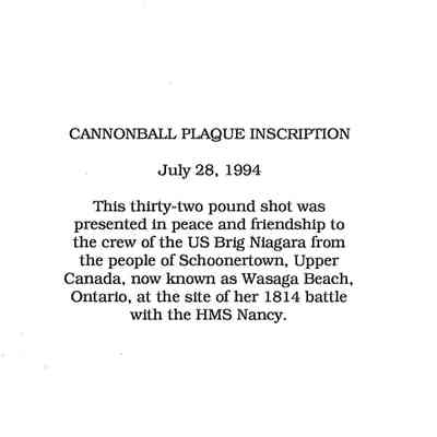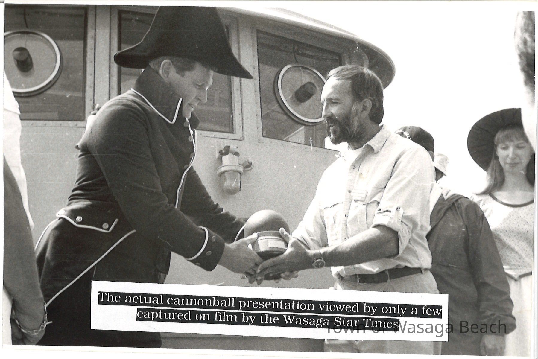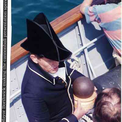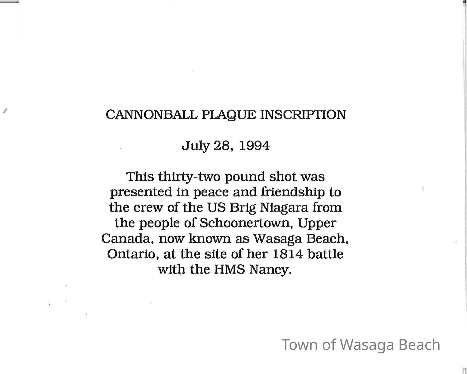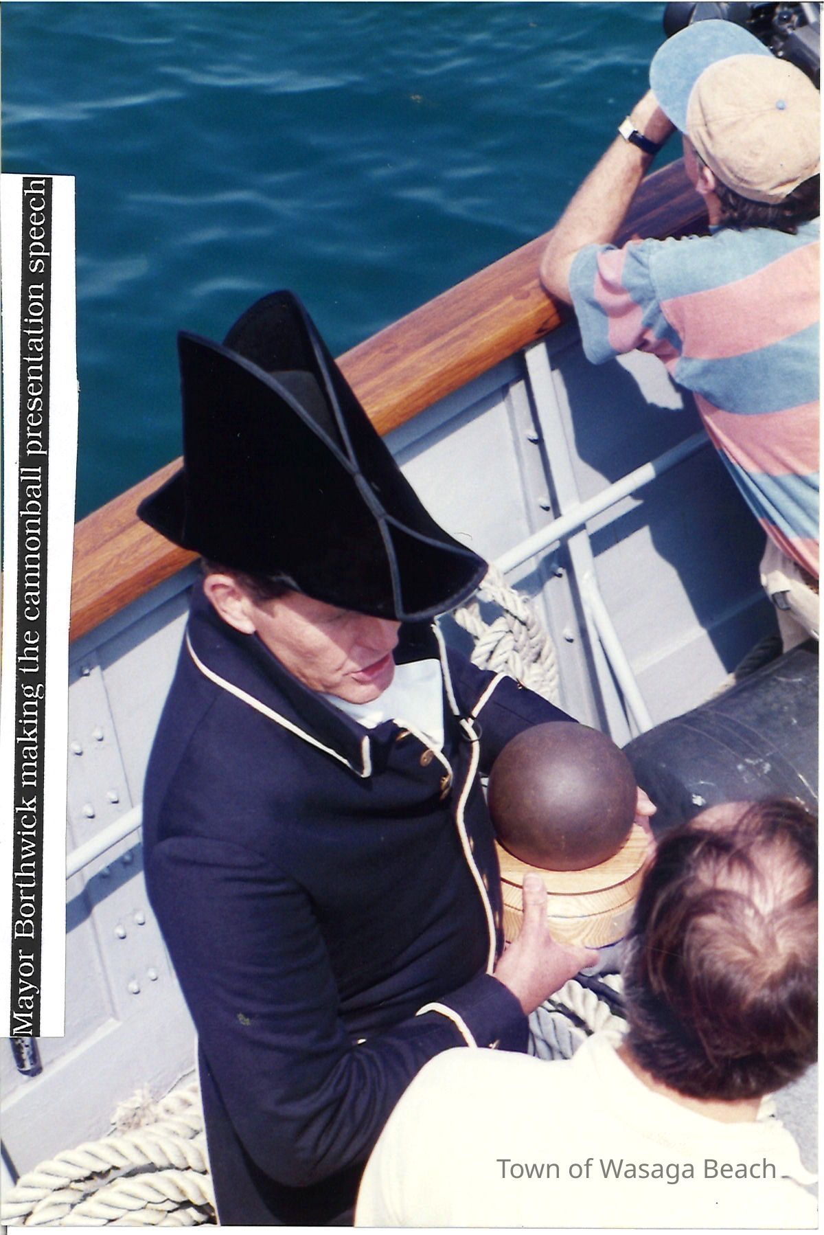 "It was one of our fabulous summer days with full sunshine. Those dressed in period costumes and woollen uniforms will remember how warm they felt when crossing the bay under the hot sun to meet the ships. We had a small vessel full of dignitaries heading out to meet them, complete with Mayor Walter Borthwick dressed in full uniform. They were on their way to meet the captain of the U.S Brig Niagara, to return a 32-pound shot or cannonball, which had been fired on the Nancy and later found in the river’s sand bottom", written by Mary Watson, Town Archivist. See link to full article below.Acquisition
