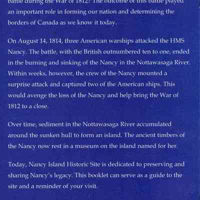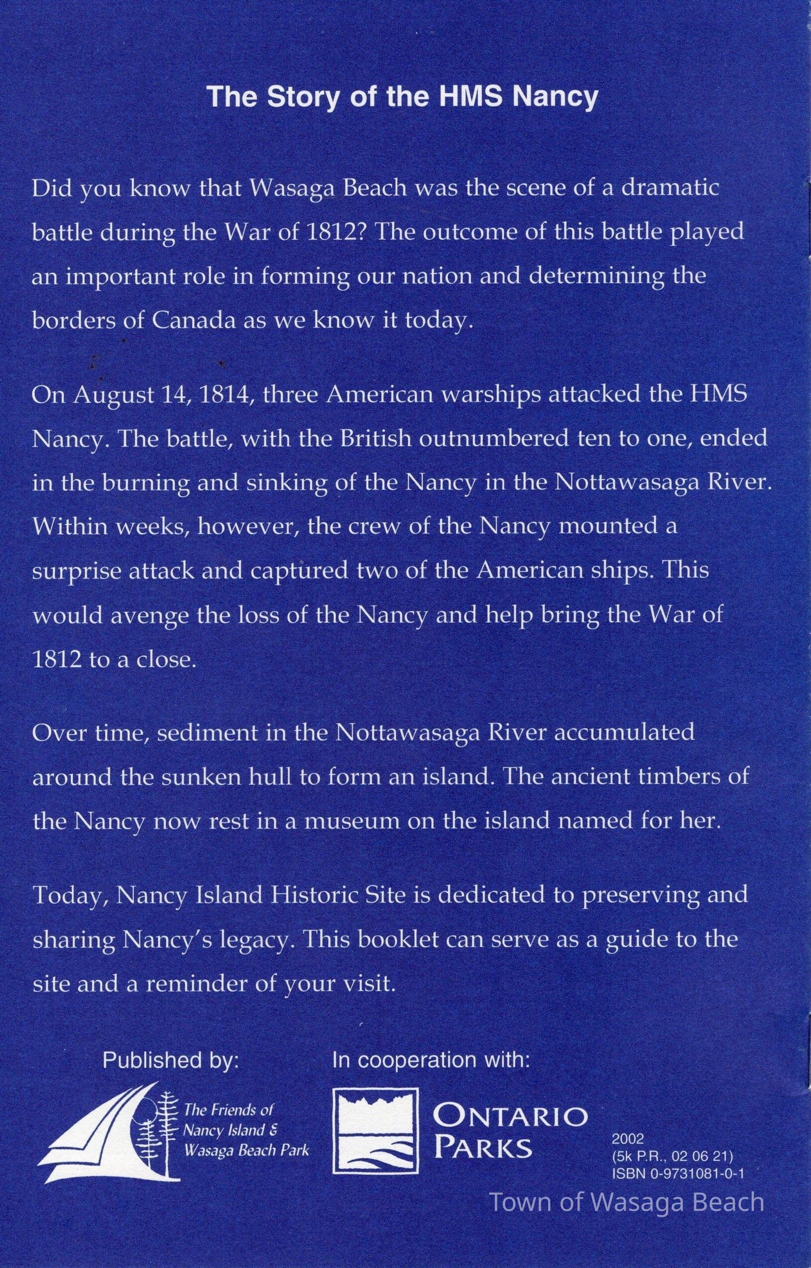 -The booklet "HMS Nancy, The Legacy of a War of 1812 Schooner and Her Crew" published by The Friends of Nancy Island and Wasaga Beach Park in cooperation with Ontario Parks, 2002, describes the story of the HMS Nancy. During the War of 1812 , on August 14, 1814, the HMS Nancy was sunk by American ships in the Nottawasaga River. The crew of the Nancy planned a surprise attack and avenged the sinking of the Nancy when they captured two American ships. This helped end the war and was instrumental in determining Canada's borders as they are known today. The booklet includes the history of the HMS Nancy, the fur trade, factors leading to the War of 1812, The Battle of Lake Erie, Nancy's Notable crew, the Battle of the Nottawasaga River, the capture of USS Tigress & USS Scorpion and information about the Nancy Island Historic Site, where the remains of the hull of the Nancy are preserved for public viewing.