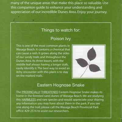 From the booklet: "Wasaga Beach Provincial Park protets the largest undisturbed tract of parabolic dunes on the Great Lakes with over 50 kilometres of trails for your hiking and cross-country skiing enjoyment. The Pine Trail 96.1 kilometres long) winds through many of the unique areas that make this place so valuable." The booklet includes information about Pine Trail, dune development, vegetation, the eastern hognose snake, evergreen and pine-oak woodland, wildlife and birds.Acquisition