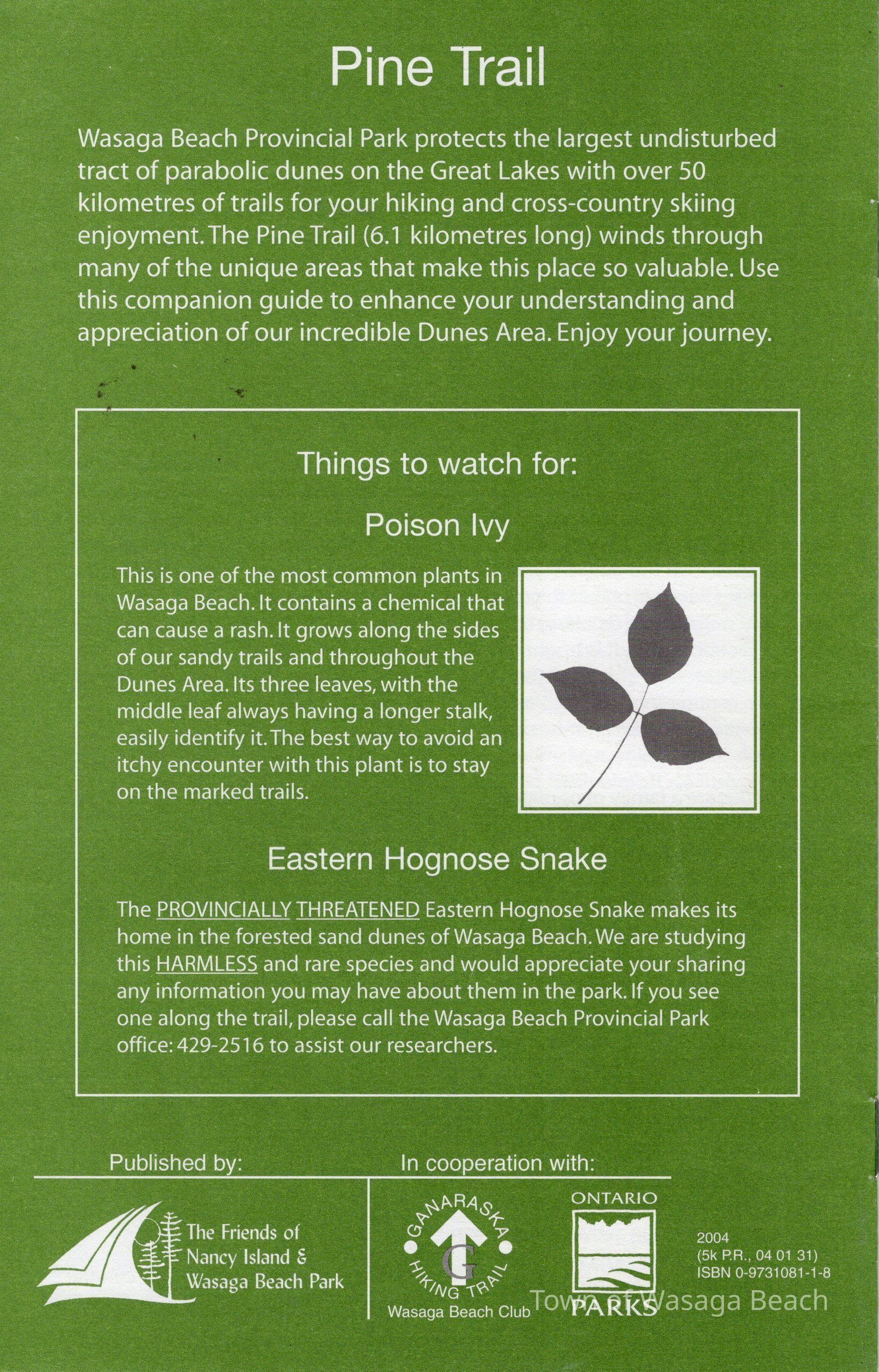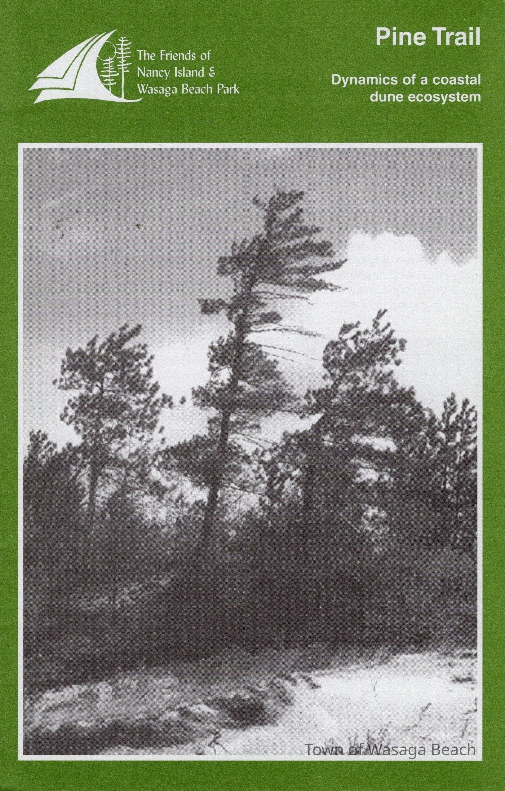 The booklet, "Pine Trail, Dynamics of a coastal dune ecosystem" is published by The Friends of Nancy Island & Wasaga Beach Park in cooperation with he Ganaraska Hiking Trail Wasaga Beach Club and Ontario Parks in 2004.