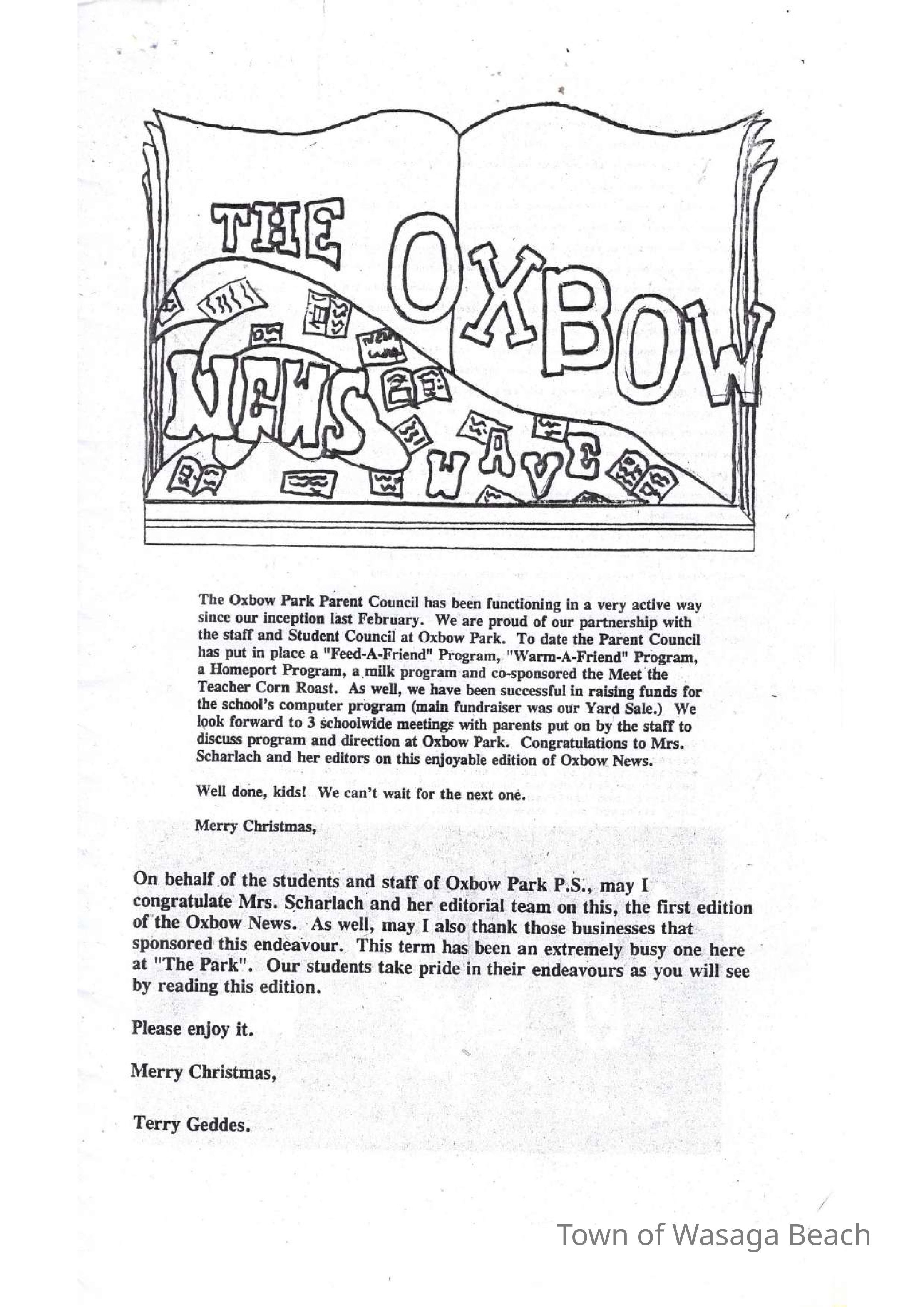 The Oxbow News Wave was created by teachers and students. The pamphlet includes class photos, drawings and various writings by students along with business sponsors. The pamphlet was "Supplement to the Enterprise-Bulletin, Friday, December 17, 1993 and the Huronia Sunday Saver (Wasaga Beach) Sunday, December 12, 1993.