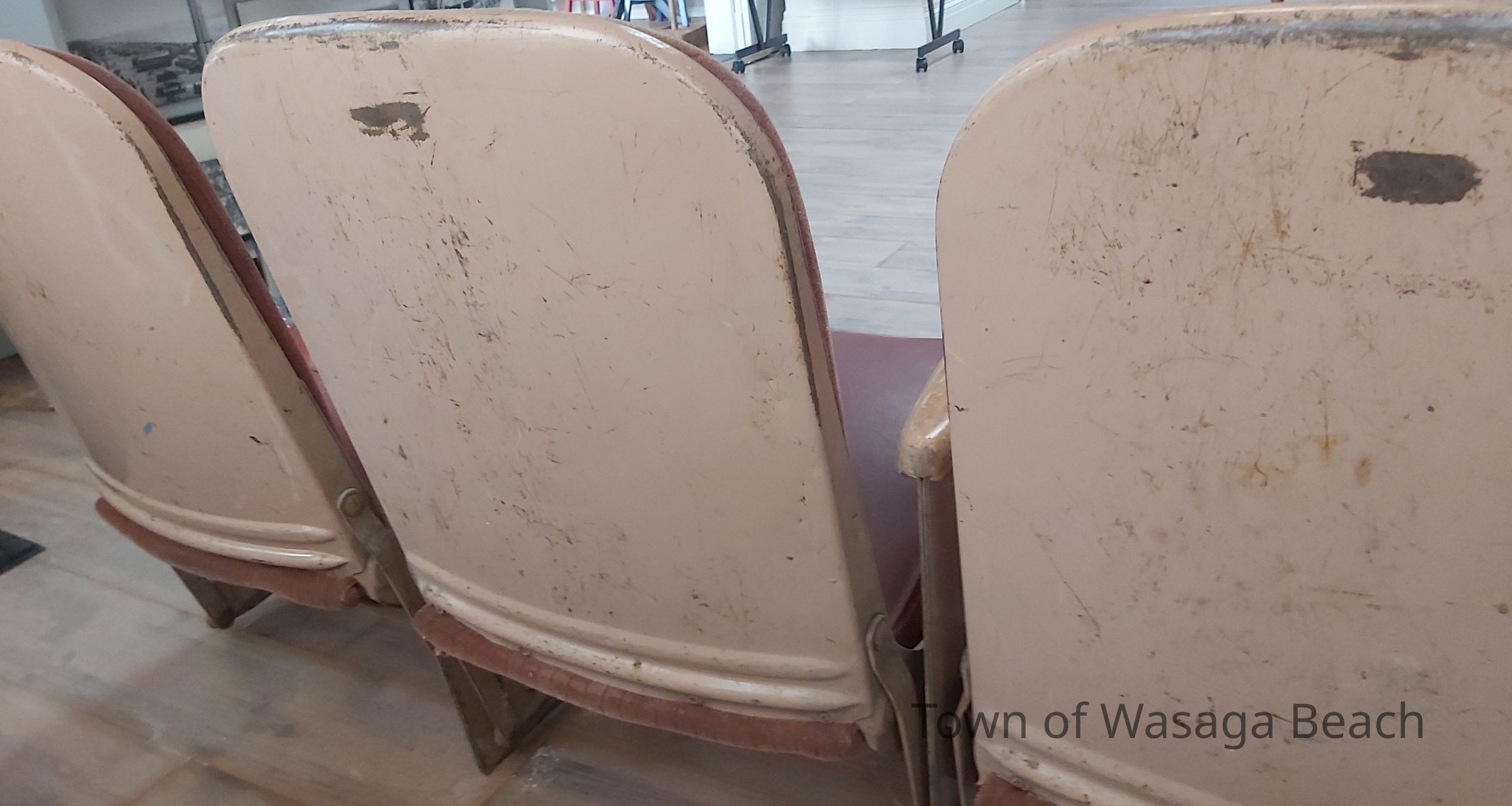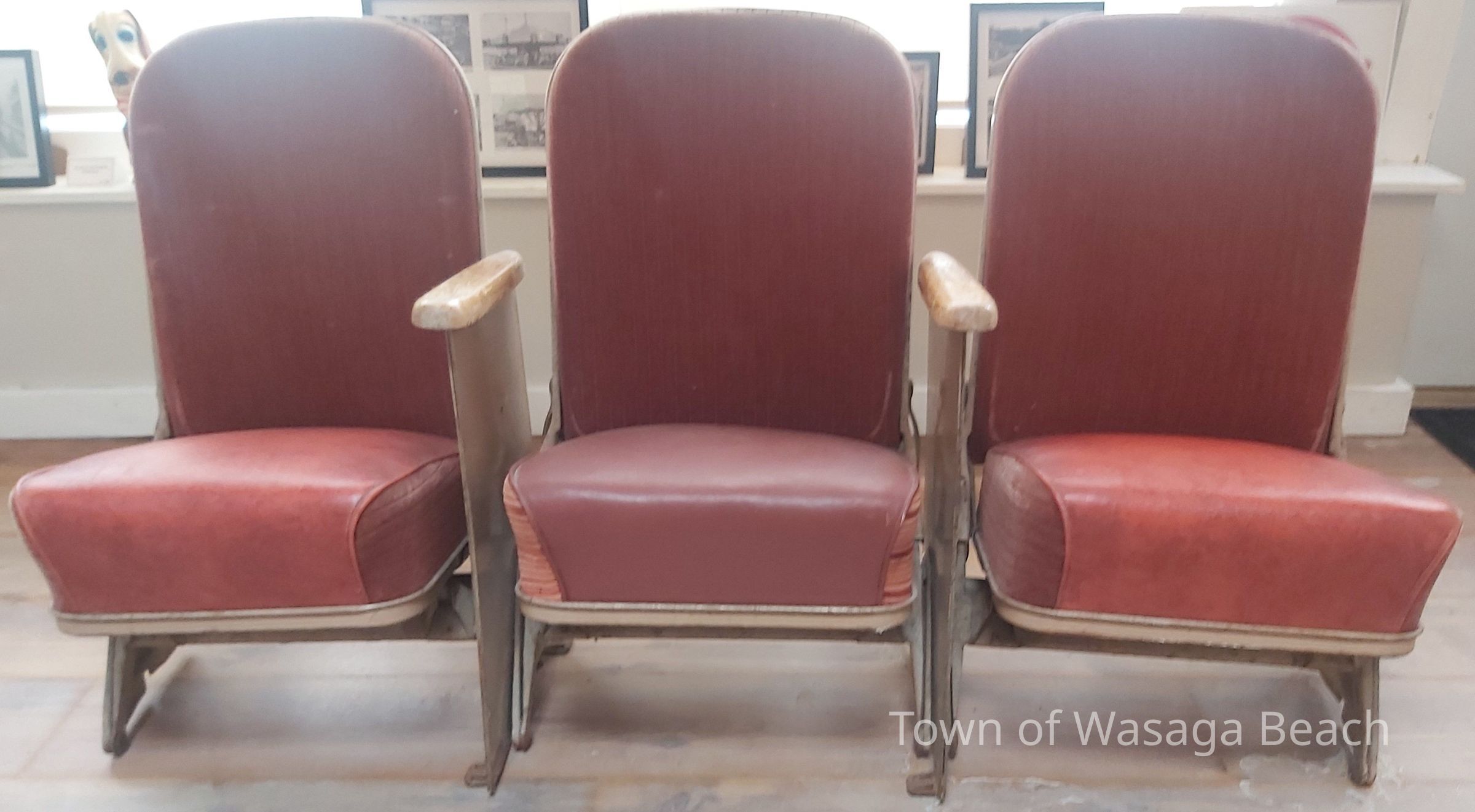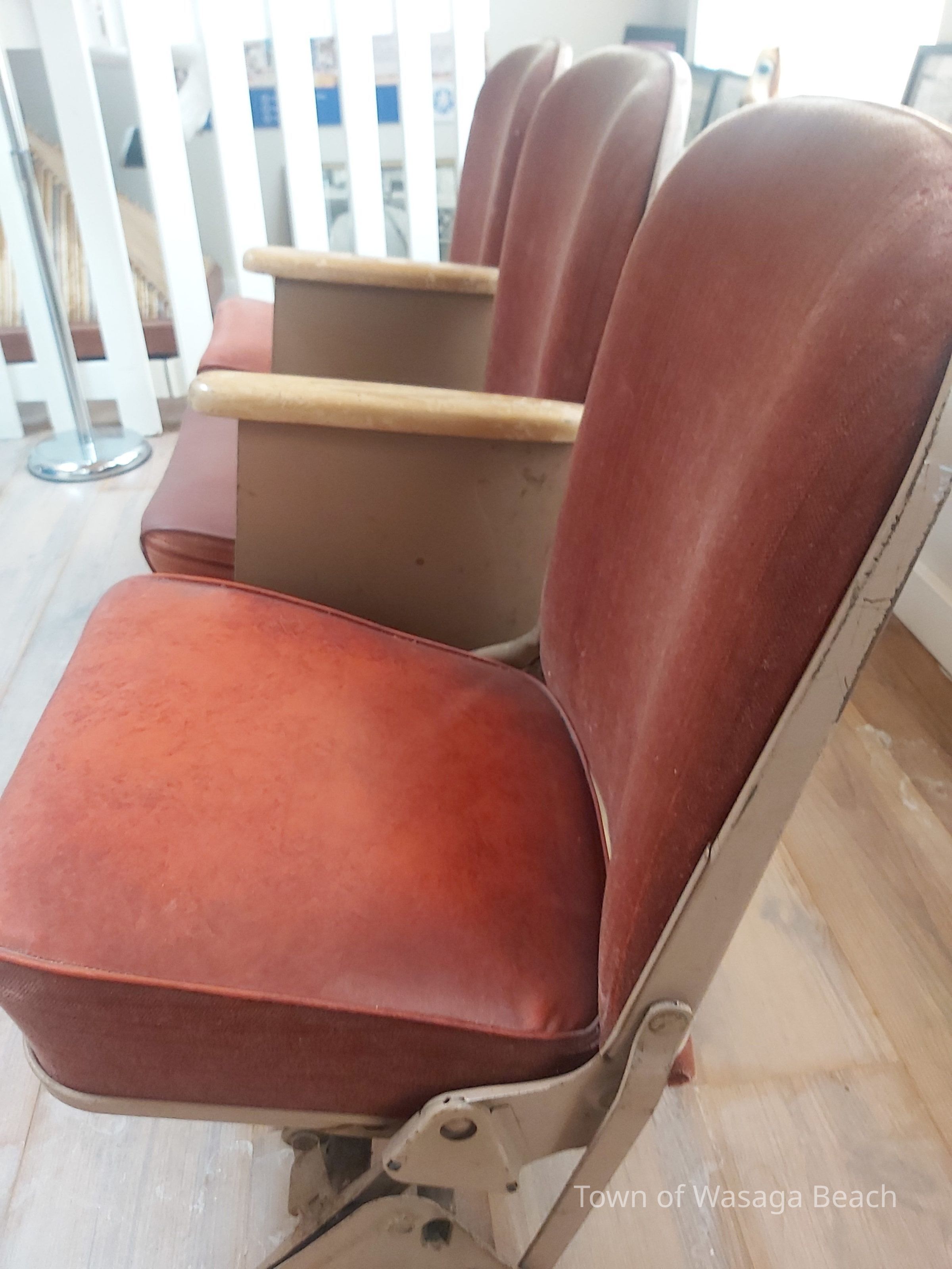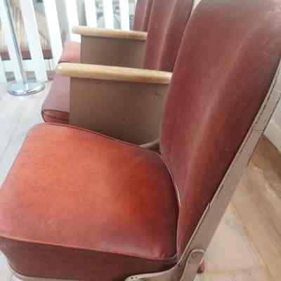 Theater seats with a metal frame and wood armrests. Seats made of red leather with red velour like material back rests.Acquisition