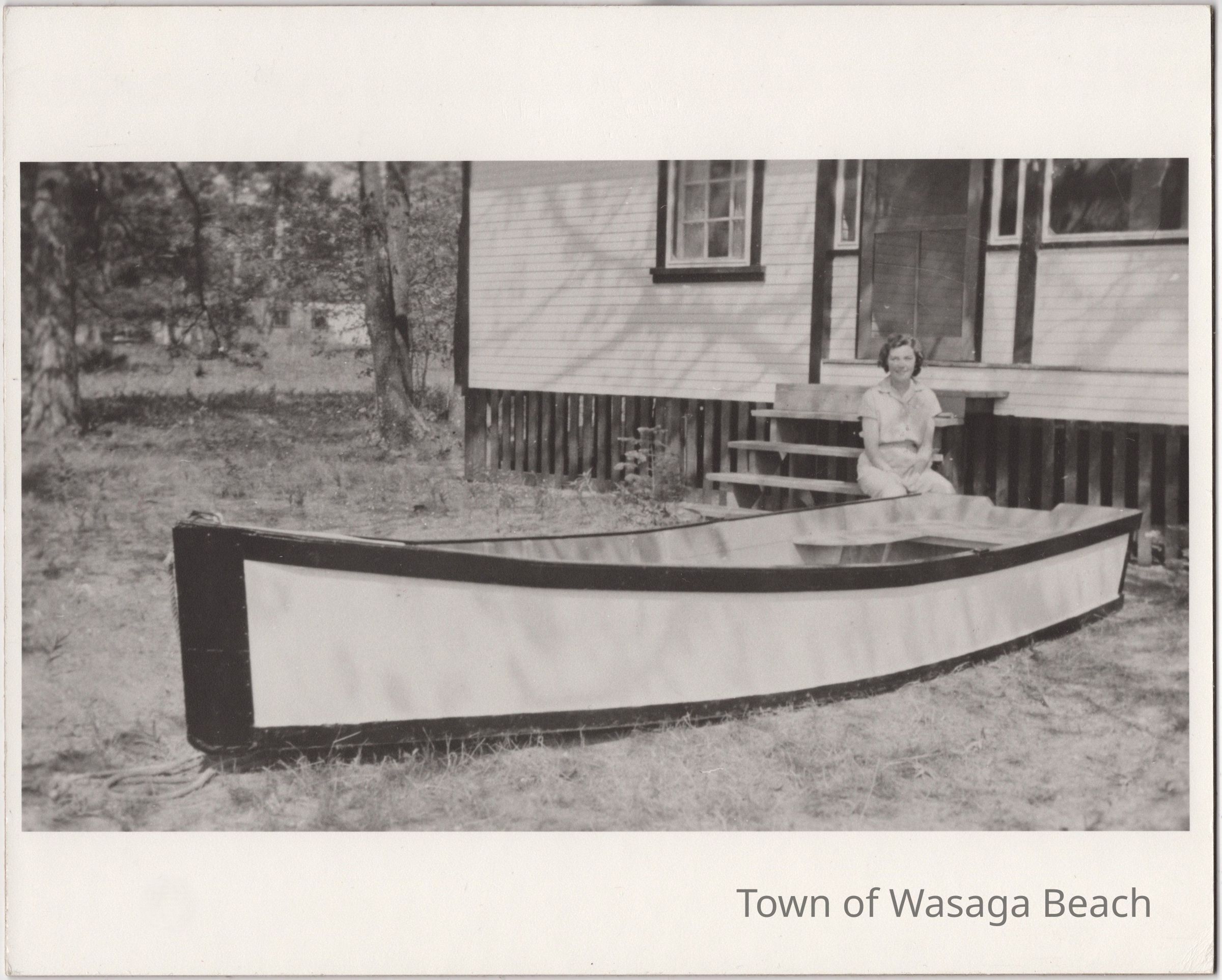 The photograph is of Thelma's mother sitting beside a large rowboat in front of a cottage.Acquisition