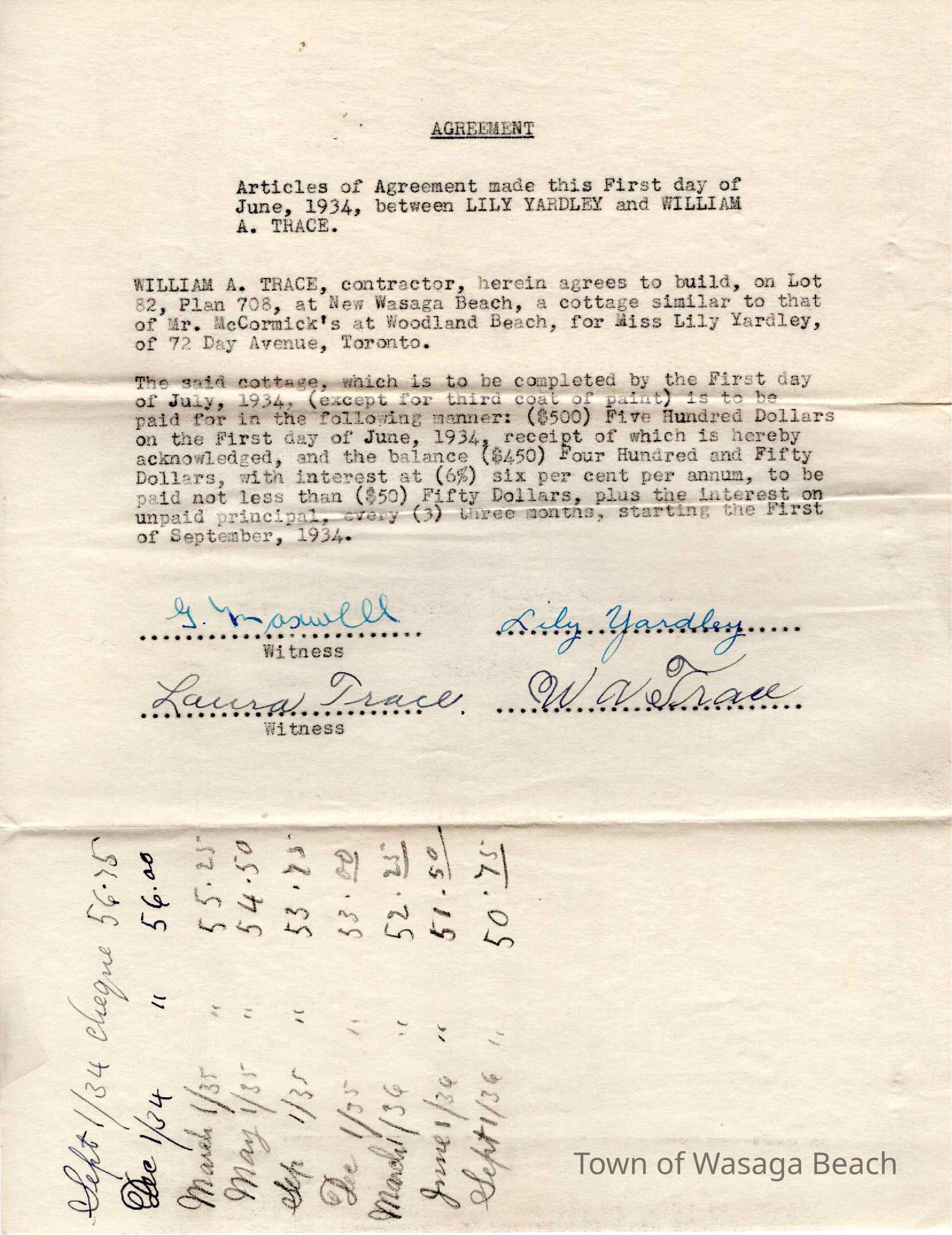 Agreement between William A. Trace and Lily Yardley, dated June 1, 1934. W.A. Trace (contractor) agrees to build a cottage similar to one built for Mr. McCormick of Woodland Beach. The build and payment schedule is documented in the agreement.Acquisition