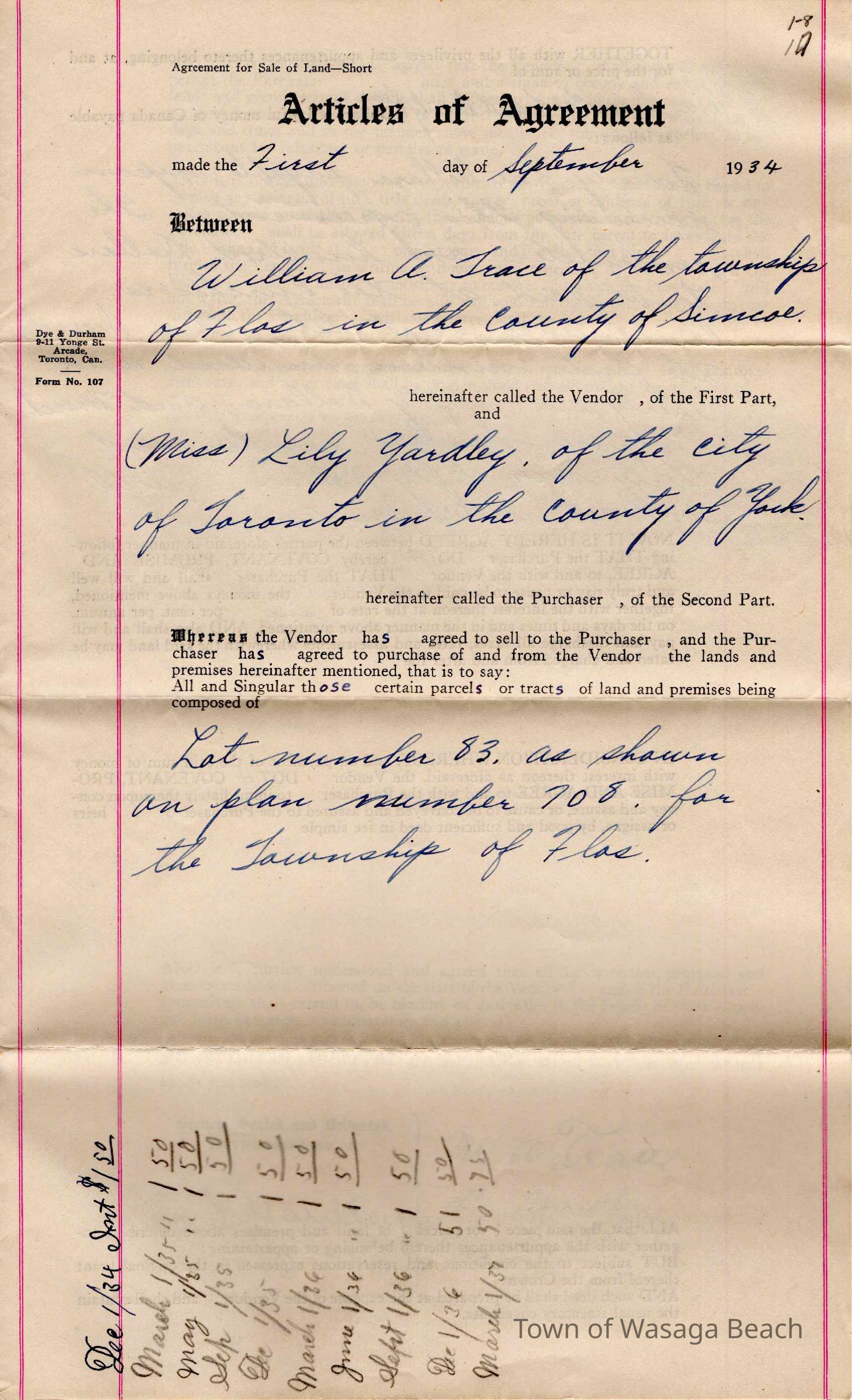 Agreement between W.A. Trace and Lily Yardley, dated September 1, 1934, for the purchase of Lot 83, Plan No. 708 for $125. The schedule of payments to be paid by Miss Yardley to Mr. Trace is documented in the agreement.Acquisition