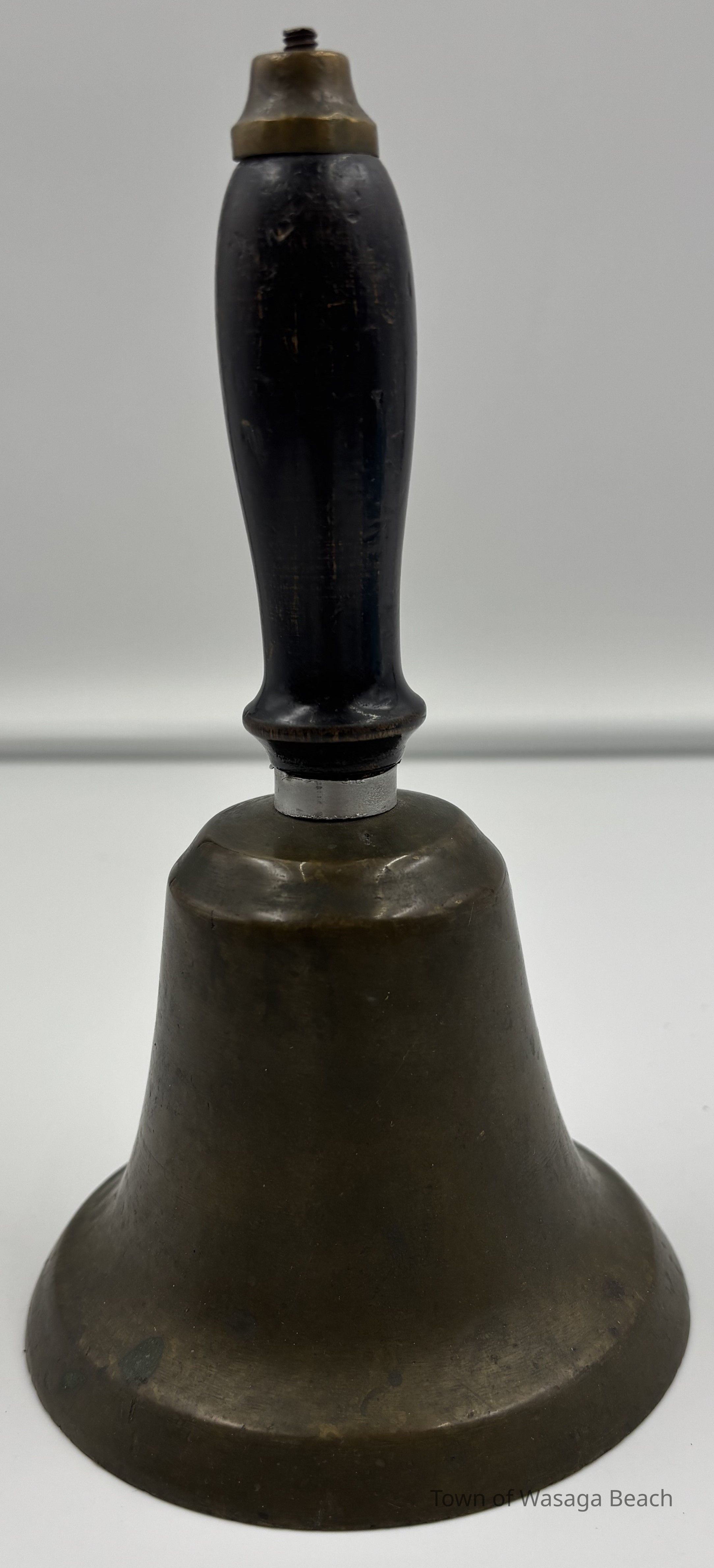 Brass school bell with wooden handle and brass cap on handle and a silver metal ring separates the wooden handle and the brass bellContext
