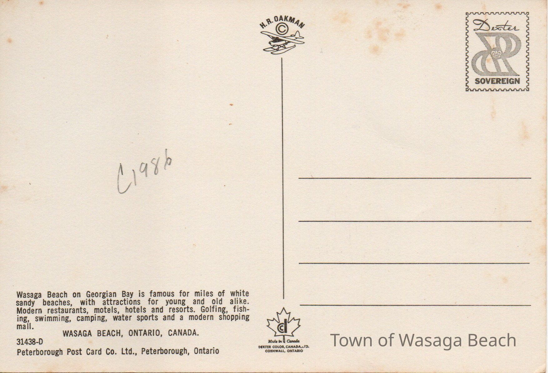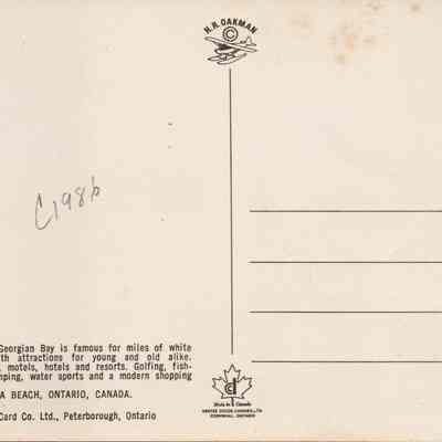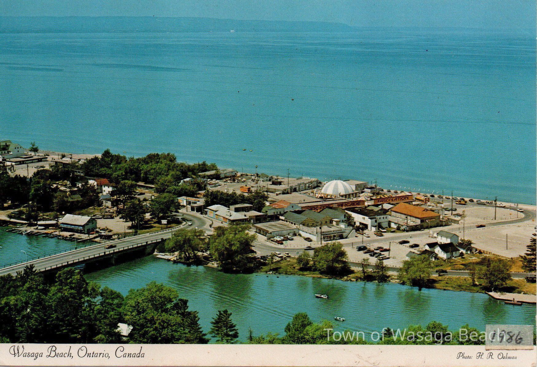 Aerial colour photo showing the river and bridge, and main street with Blue Mountain across the by. The postcard is labelled "1986" with "Wasaga Beach, Ontario, Canada in print across the bottom white border of the postcard. Photo by H.R. OakmanAcquisition