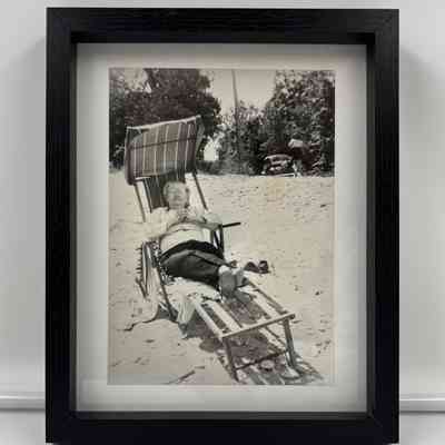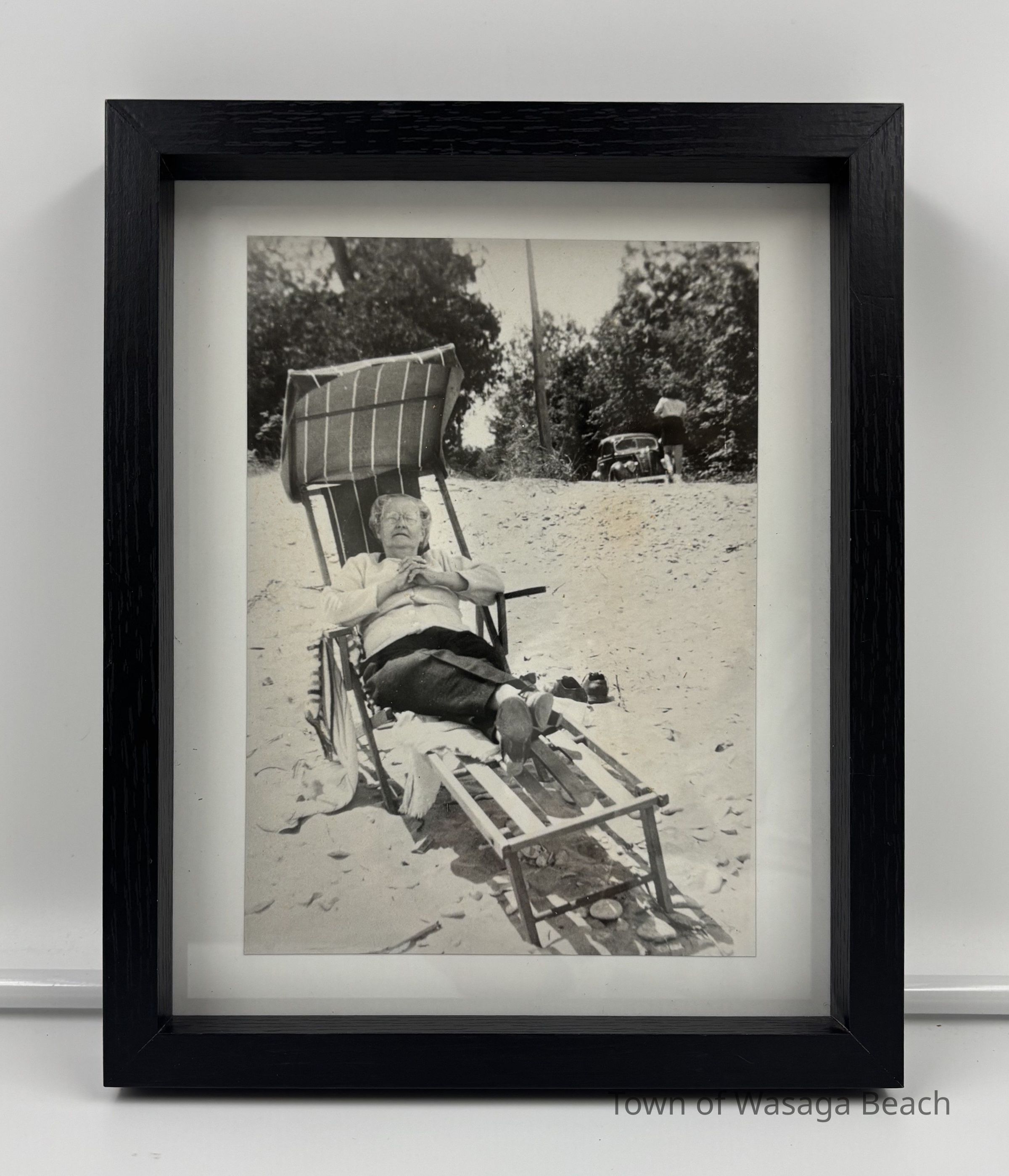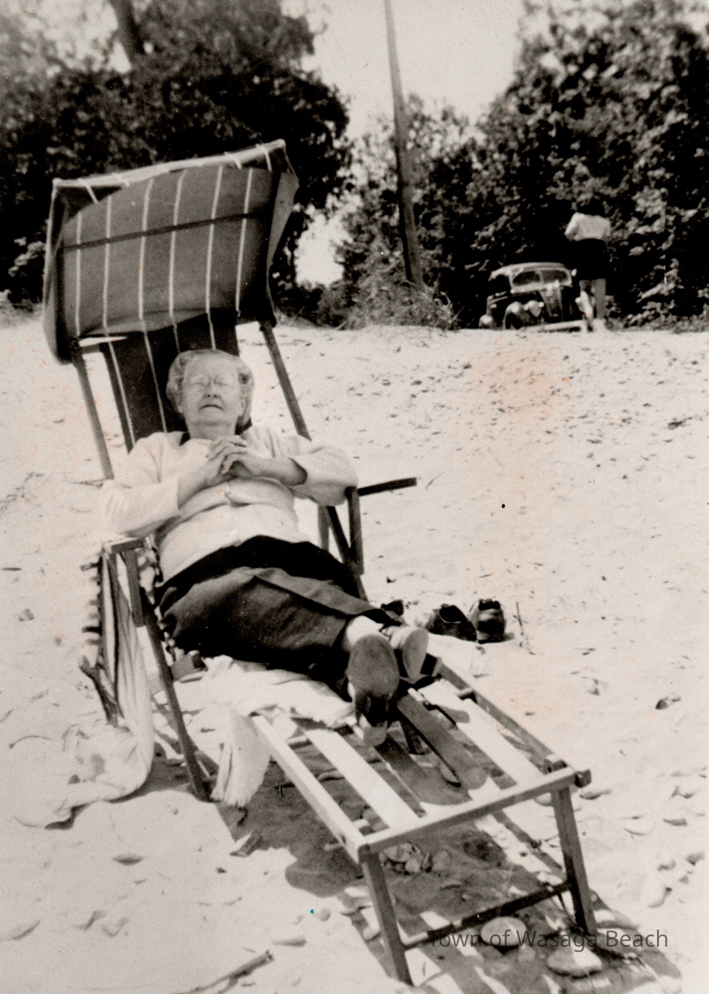 The photograph features Lillian Capps, relaxing on the beach in a classic wood and canvas deck chair,1940 (Wasaga Saga by Thelma Morrison). The lounge chair appears to be constructed of wood and cloth, including a cloth sun canopy. The vintage vehicle parked in the background is a Ford model, circa 1938.Acquisition