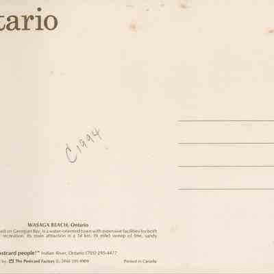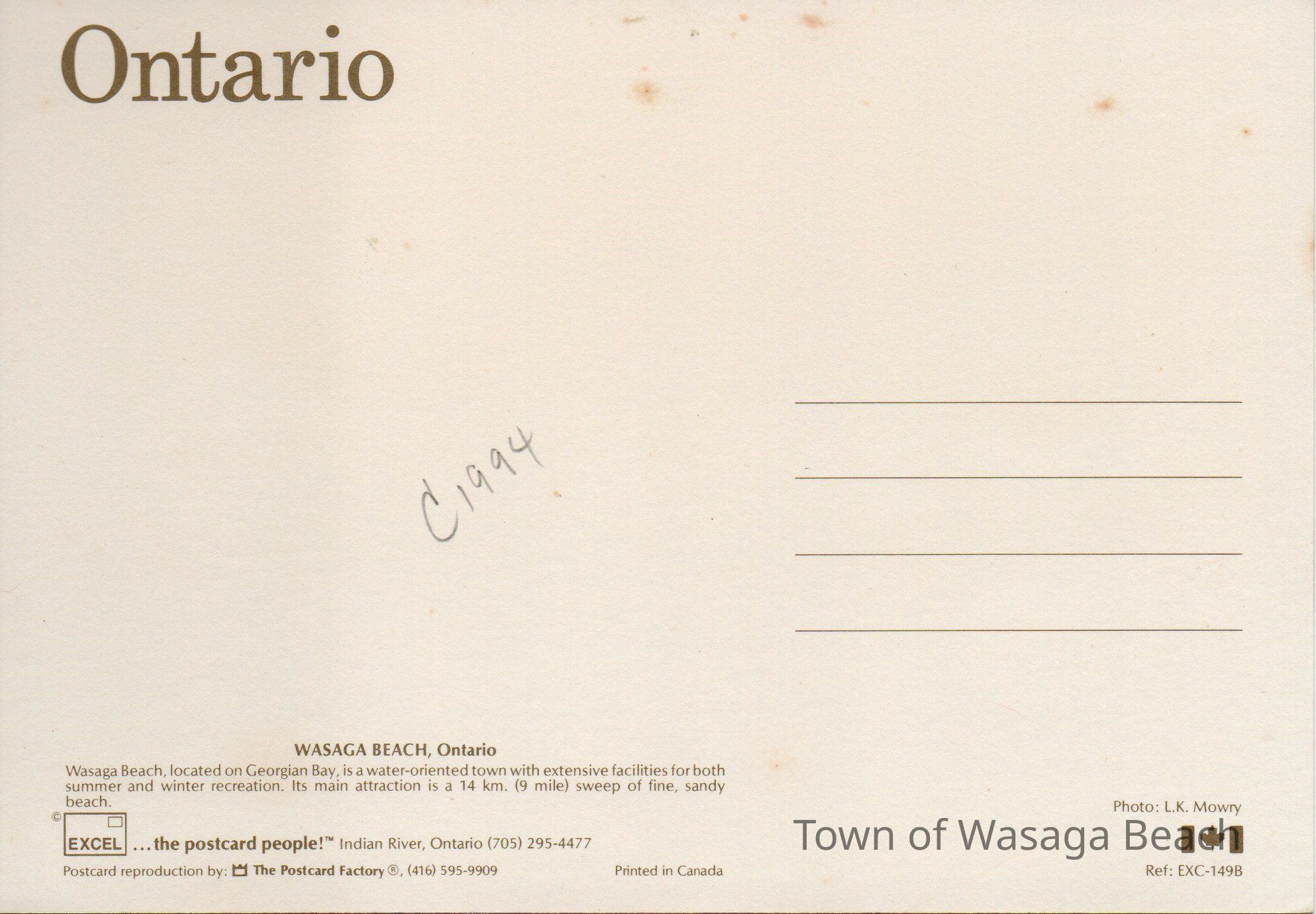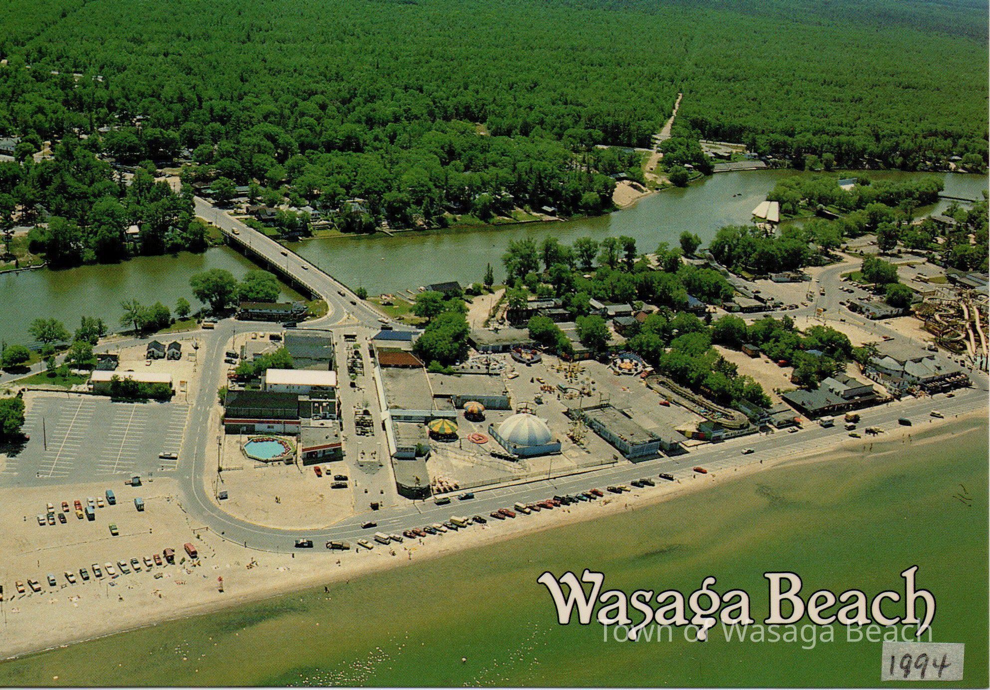 Colour photo, aerial view showing the Spruce Street Parking lot west to the Dardanella, Waterslide and Nancy Island. "Wasaga Beach" is printed in white text on the bottom right portion of the postcard. There is a label added in the bottom right corner that reads "1994". Photo by: L.K. MowryAcquisition