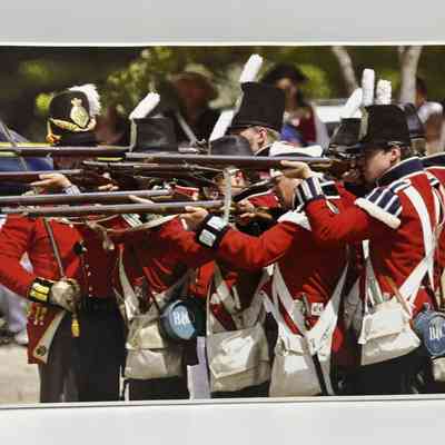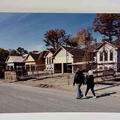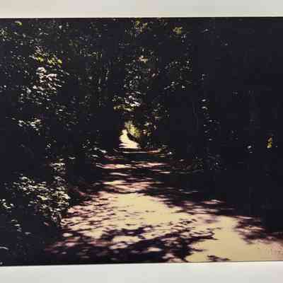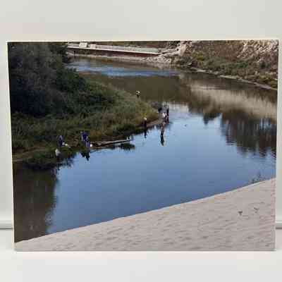 A collection of photograph copies of varying sizes from 8"x10" to 11"x15", attached to coroplast.