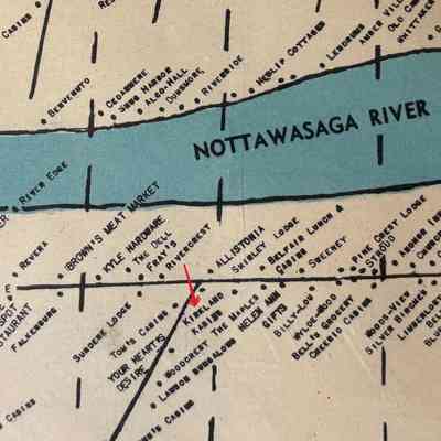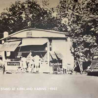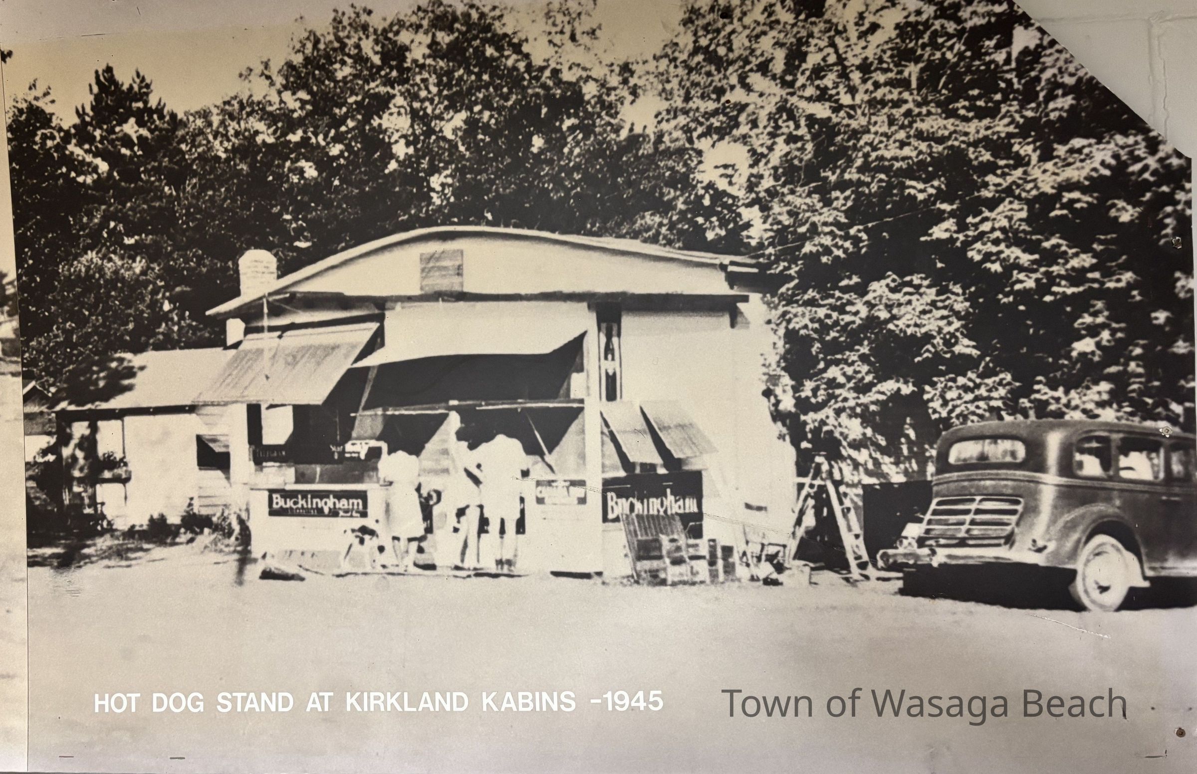 The picture captioned, "Hot Dog Stand at Kirkland Kabins -1945" has patrons at a hotdog stand and a vintage automobile at Kirkland Kabins which was located on the south east corner of the intersection of Beck Street and River Road East.Acquisition