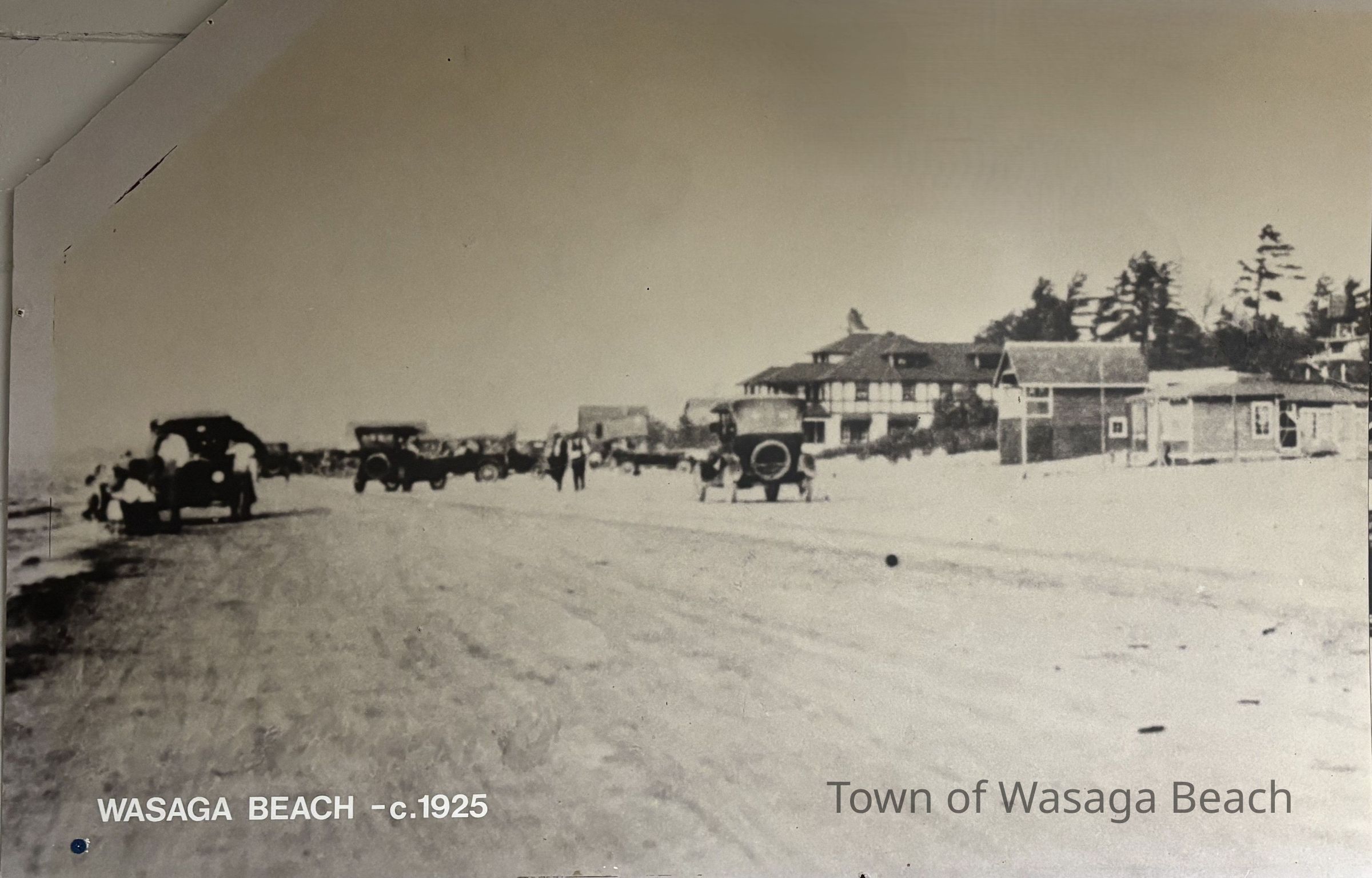 The first main road in Wasaga Beach was the beachfront. The first wooden bridge, built in 1872, and later the Main Street bridge built in 1909, provided easy passage by vehicles over the Nottawasaga River and onto the beachfront. In the picture captioned "Wasaga Beach -c.1925", vintage vehicles are parked and driving along the beachfront with people and buildings in the background. In 1973, mostly due to safety concerns, vehicles driving on the beach ended.