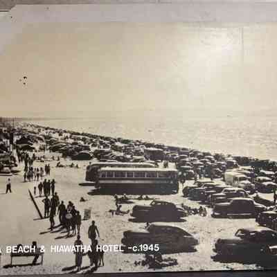 A picture, captioned "Wasaga Beach & Hiawatha Hotel", photographed from the Hiawatha Hotel, circa 1945, shows the beachfront at Wasaga Beach, with many rows of cars parked along the beach as far as can be seen. There are also 2 buses parked and people can be seen along the beach and around cars.