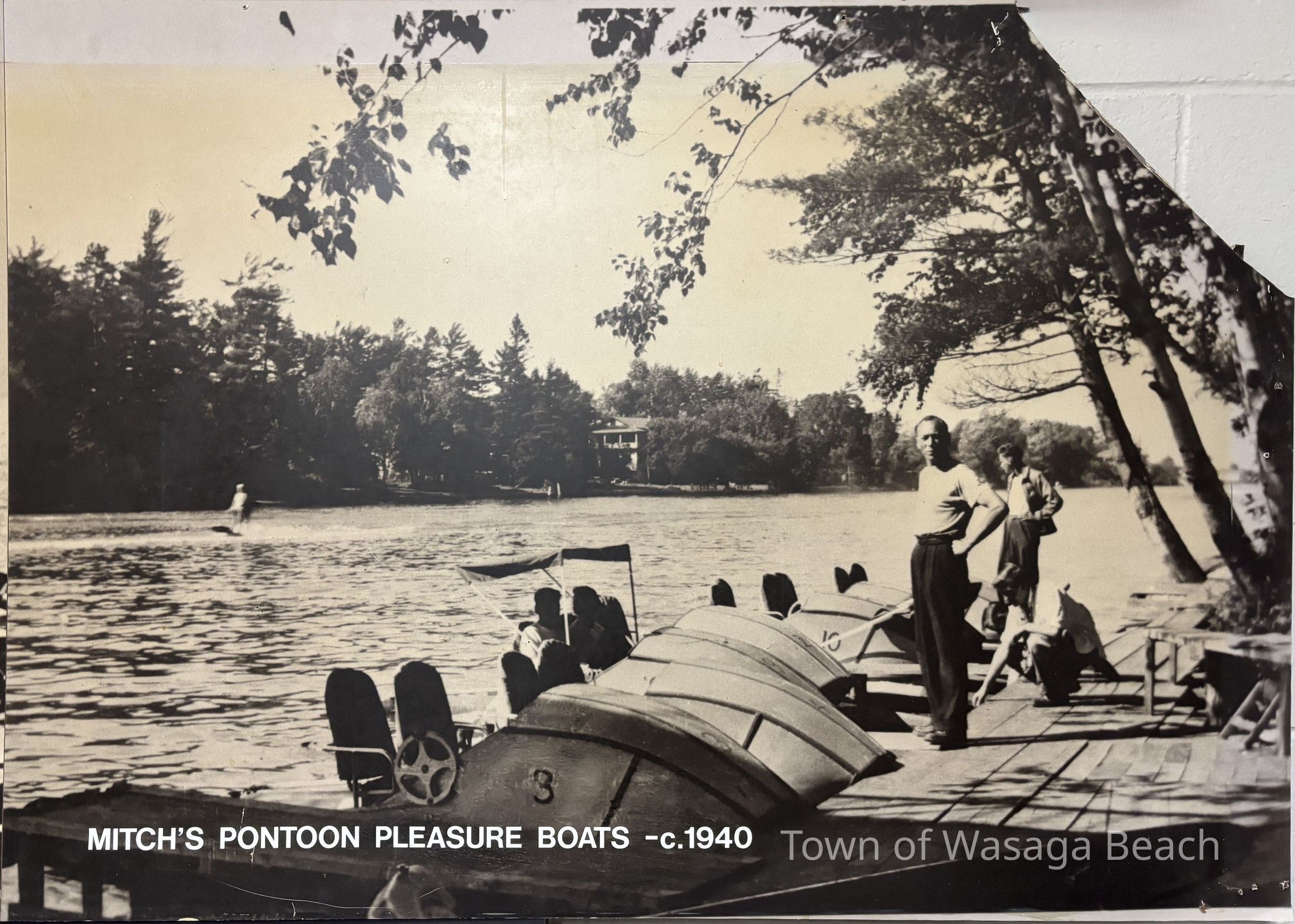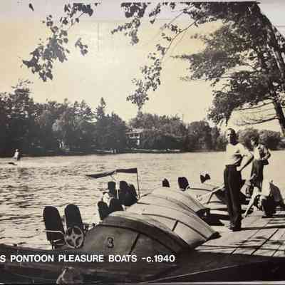 The picture captioned "Mitch's Pontoon Pleasure Boats", circa 1940, captures 3 individuals on a dock with pontoon boats on the river.Acquisition