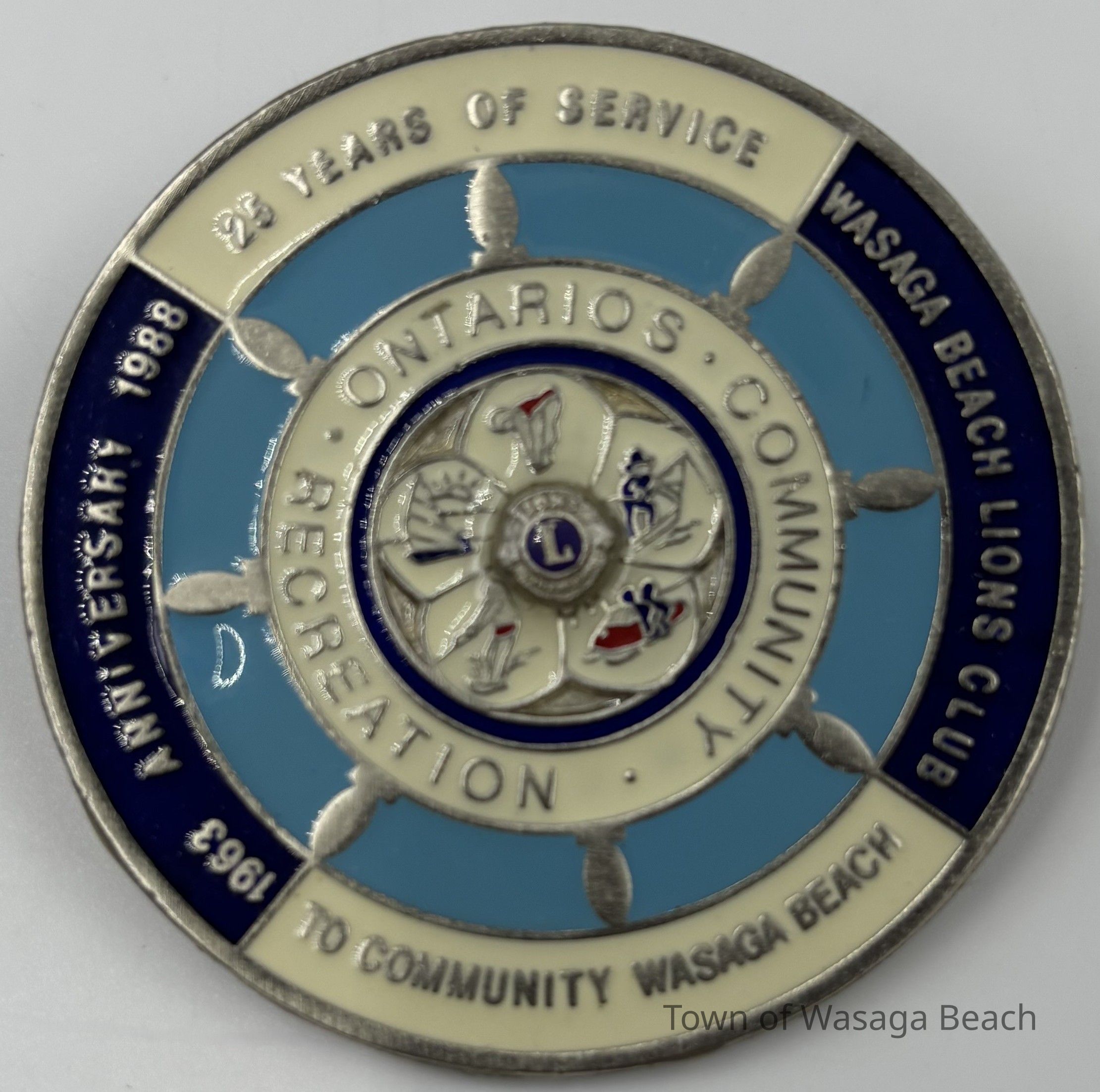 The Wasaga Beach Lions Club lapel pin recognizes 25 Years of Service to the community of Wasaga Beach beginning in 1963 with the 25th Anniversary in 1988. The first president of the club was Sid Martin. The club is still active today.Acquisition