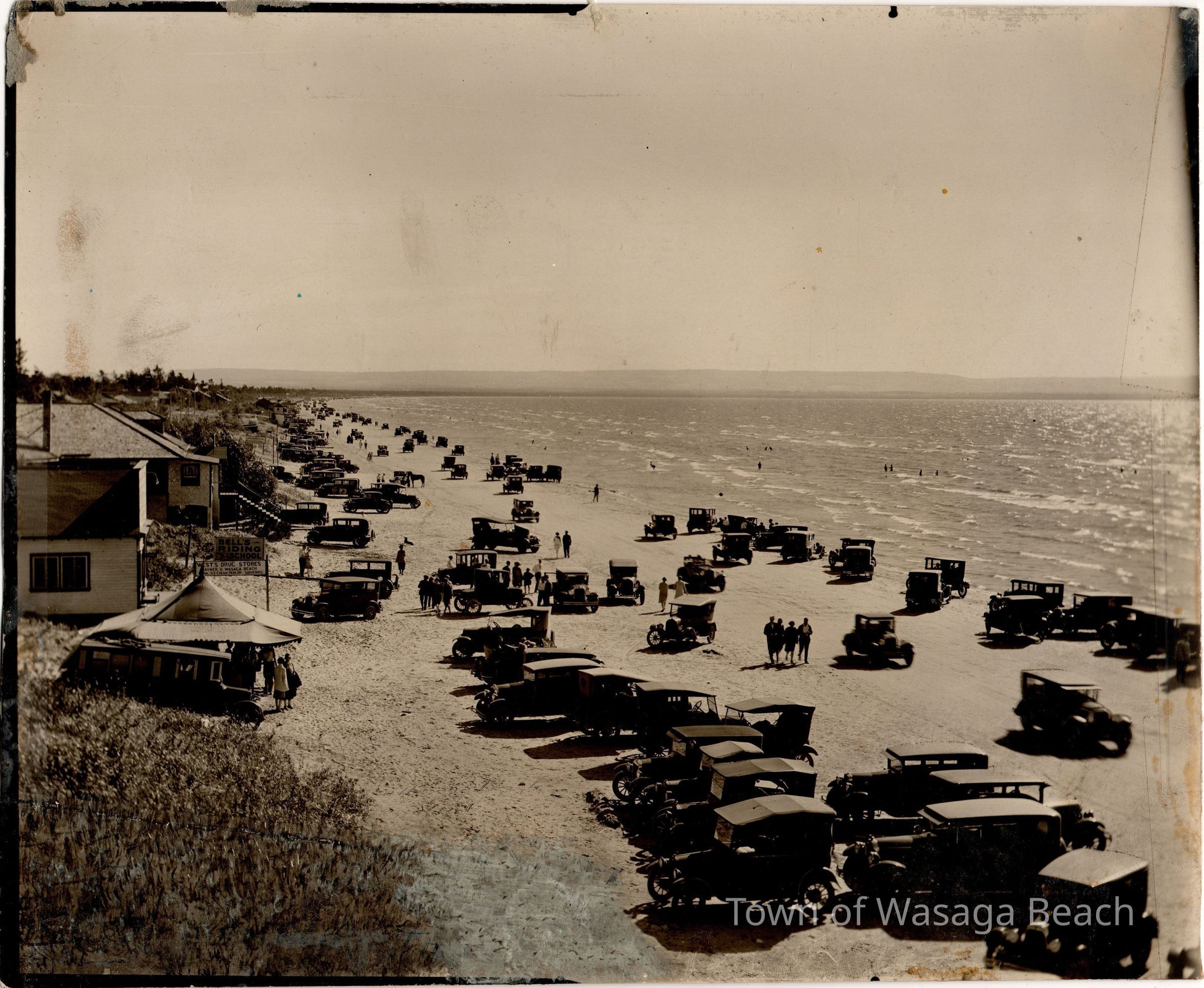 A sign close to a building reads Bell's Riding School with a horse standing near a vehicle on the beach part way along the beach. A second sign reads Wests Drug Stores, Stayner and Wasaga Beach, with the words Ice Cream Parlor and Souvenirs visible. A large umbrella like structure is visible near the signs.