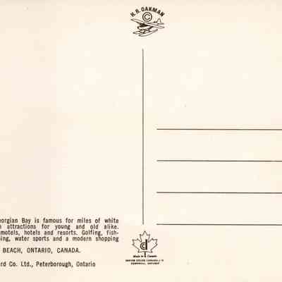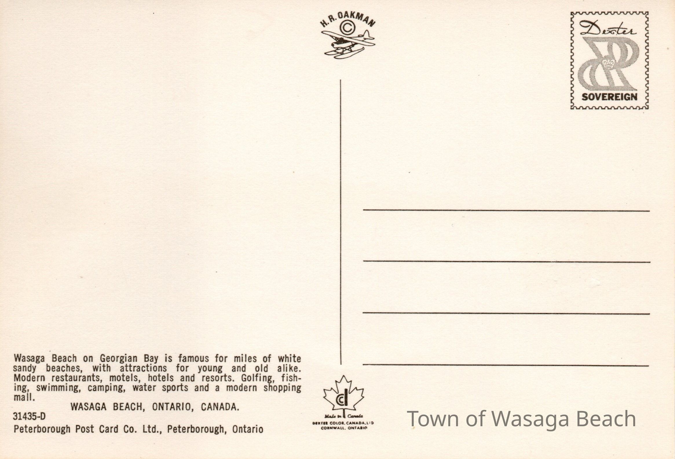 The description on the back of the card reads as follows: "Wasaga Beach on Georgian Bay is famous for miles of white sandy beaches, with attractions for young and old alike. Modern restaurants, motels, hotels and resorts. Golfing, fishing, swimming, camping, water sports and a modern shopping mall. WASAGA BEACH, ONTARIO, CANADA."